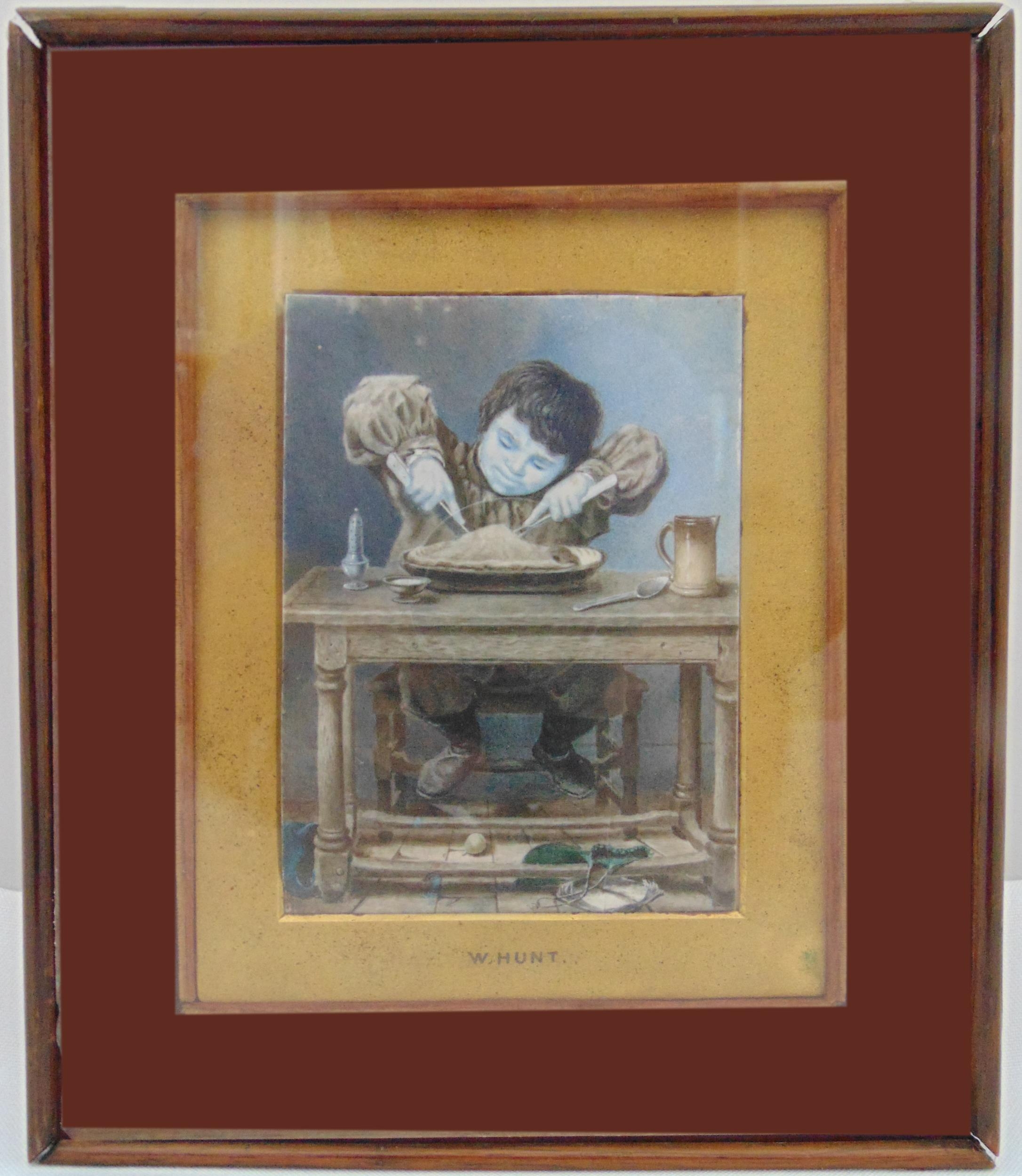 William Hunt framed and glazed 19th century watercolour of a boy eating a pie, 11 x 8cm