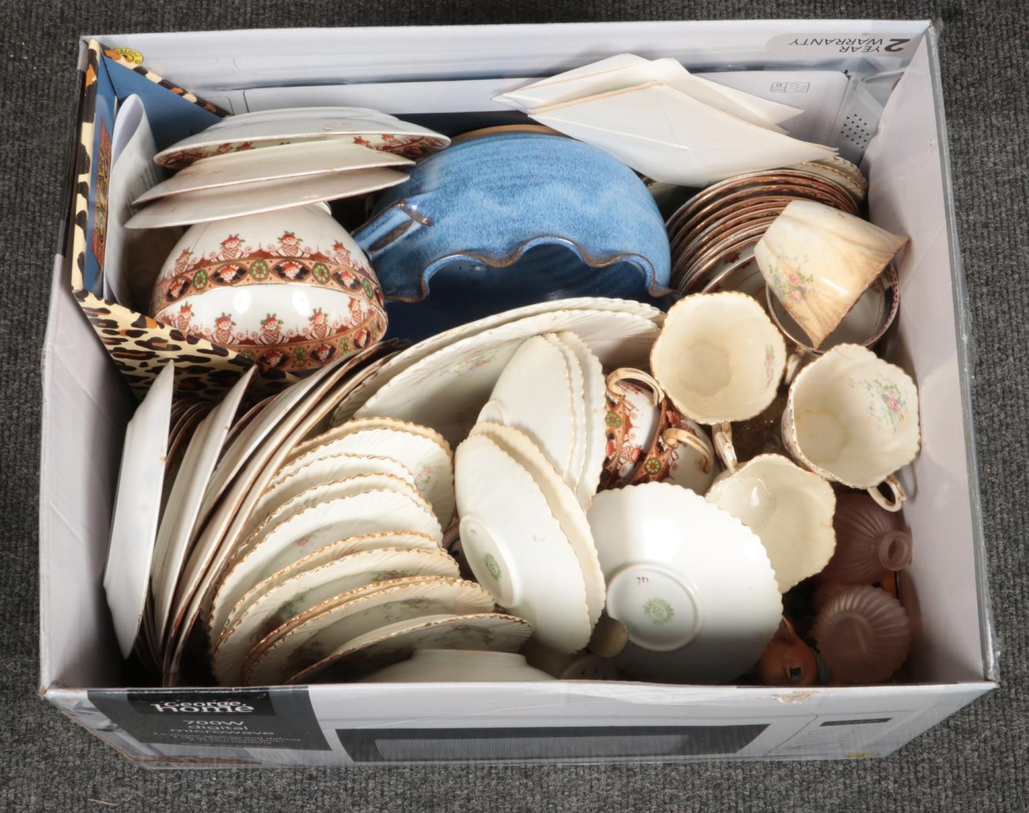 A box of miscellaneous including two Edwardian china teasets, silver plated cutlery, boxed Safari baby Oleg and fairy figuines including snowstorm etc.