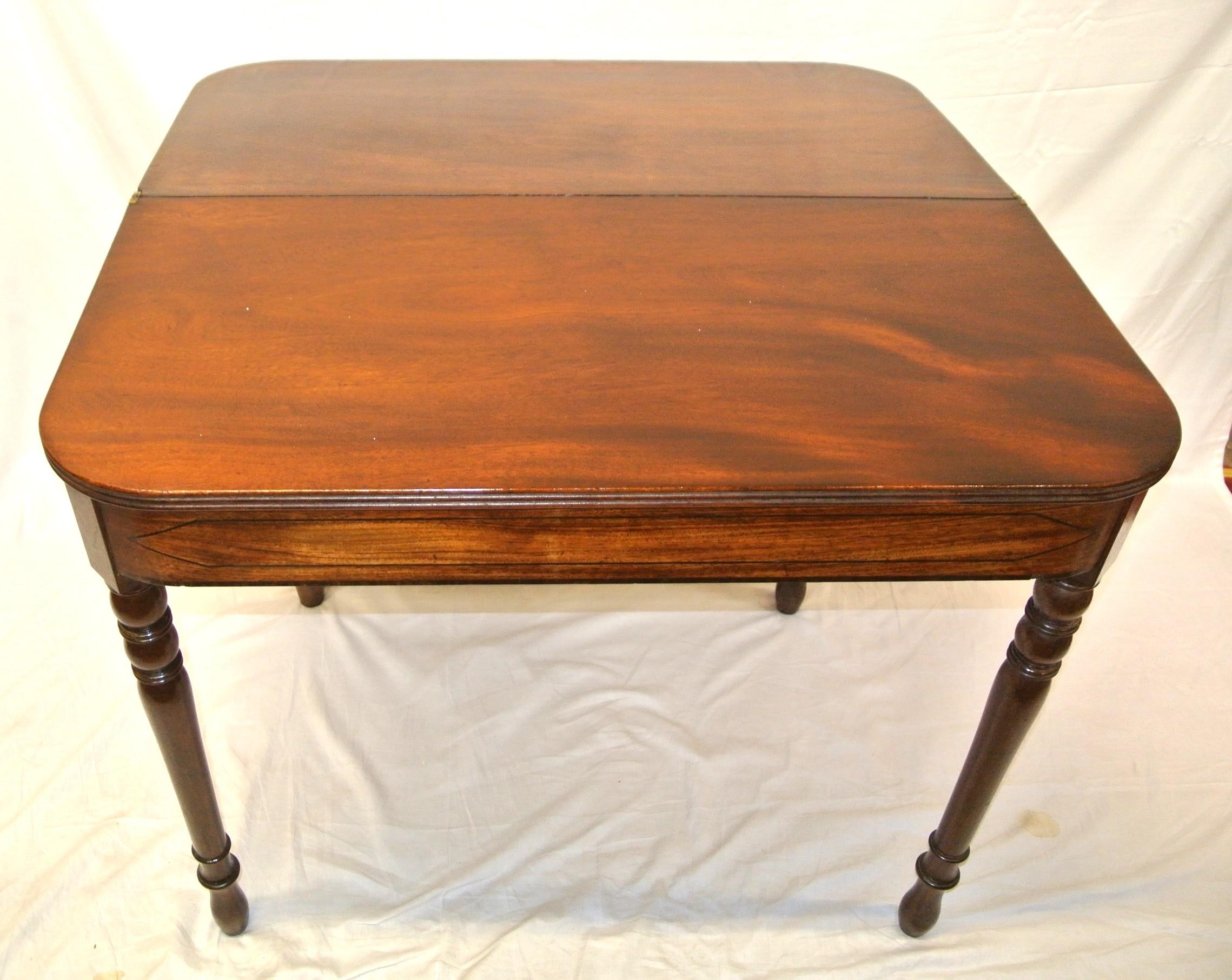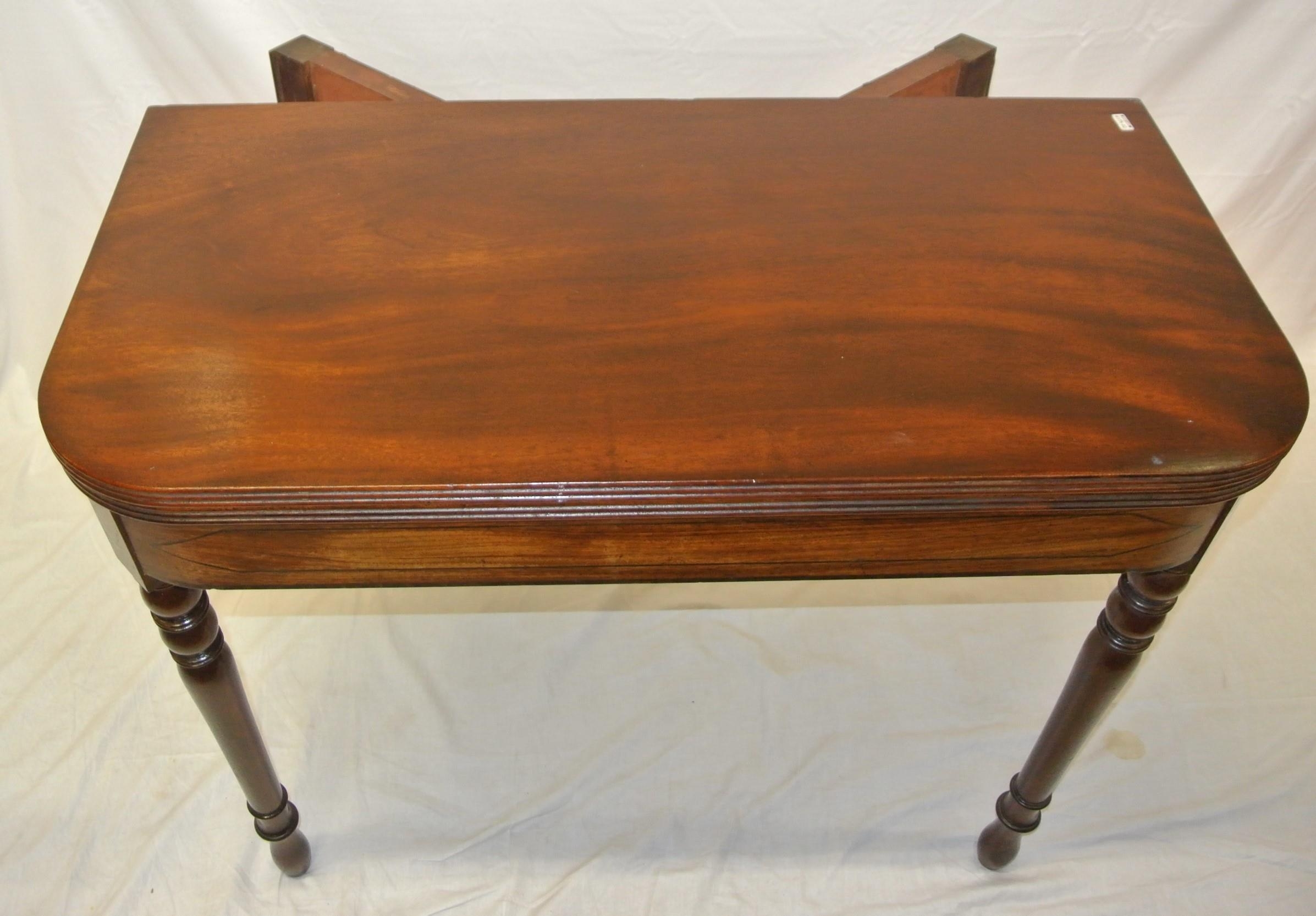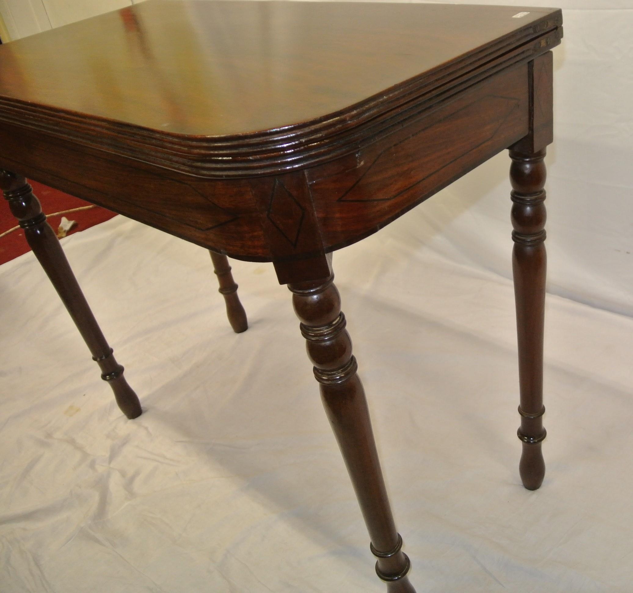 Victorian mahogany tea table with fold-over top, pull-out gateleg support, reeded borders, on turned legs