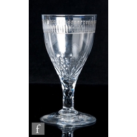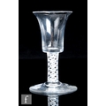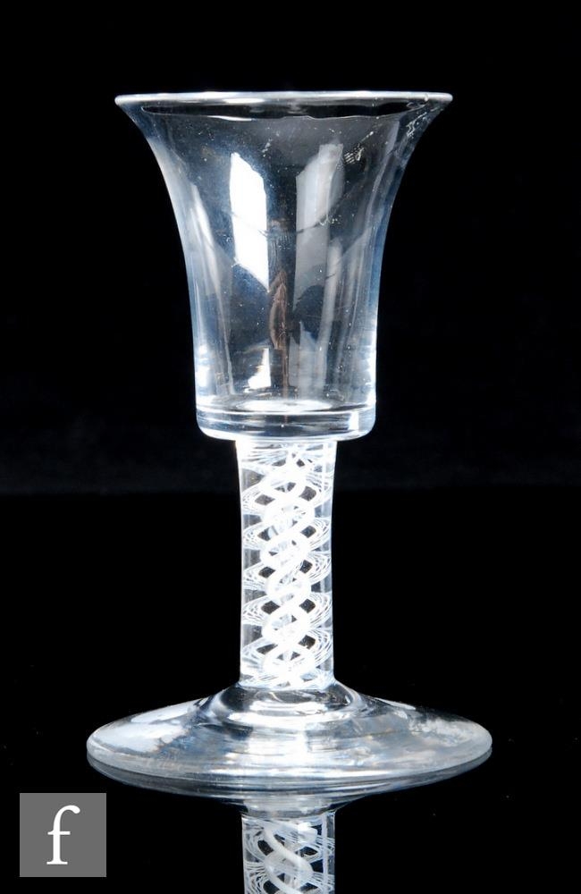 An 18th Century drinking glass, circa 1760, the flared bucket bowl above a mixed twist stem with opaque gauze and two spiral tapes outside a central air core, raised to a shallow conical foot, height 11cm.