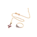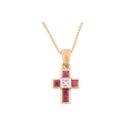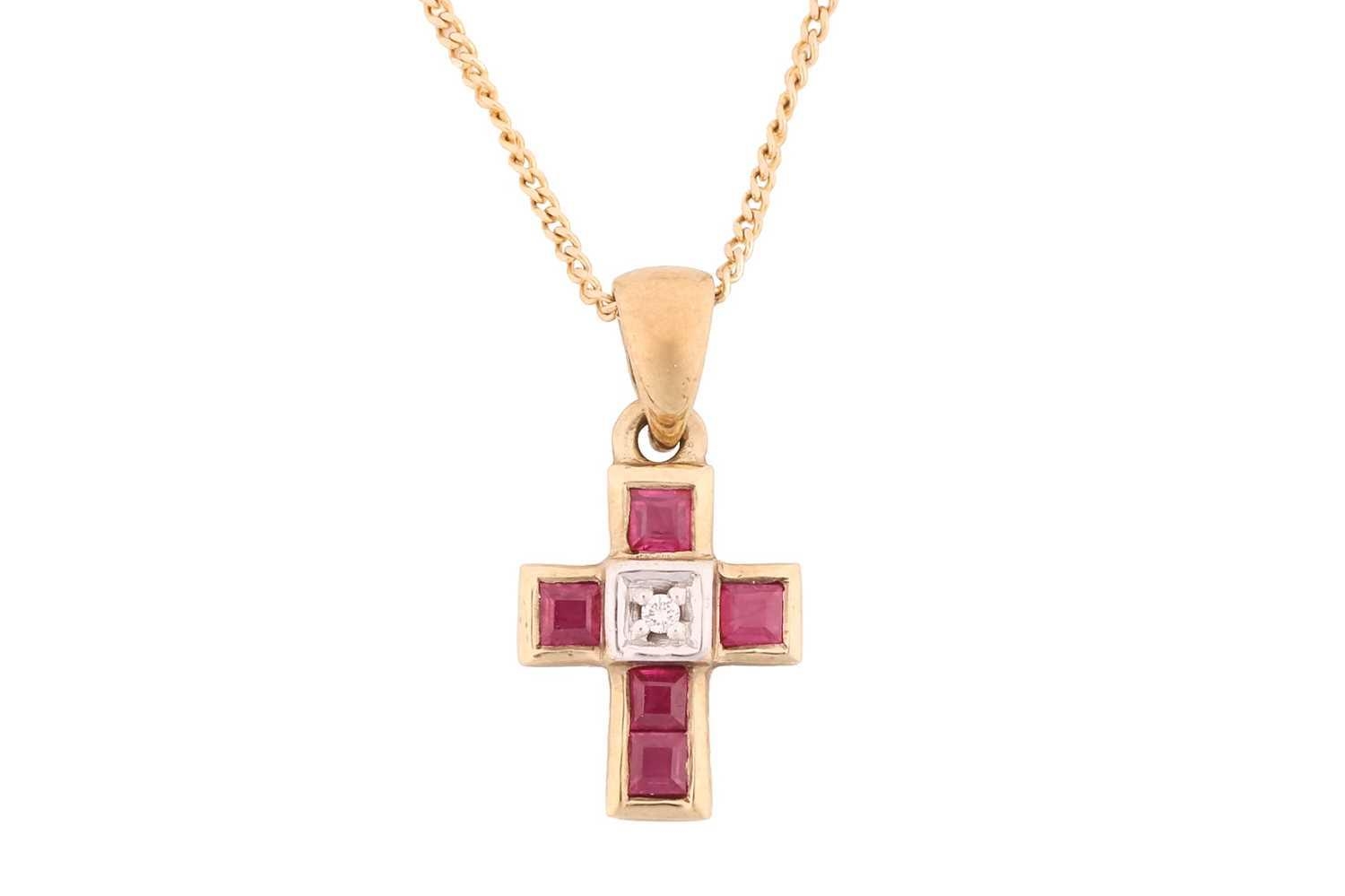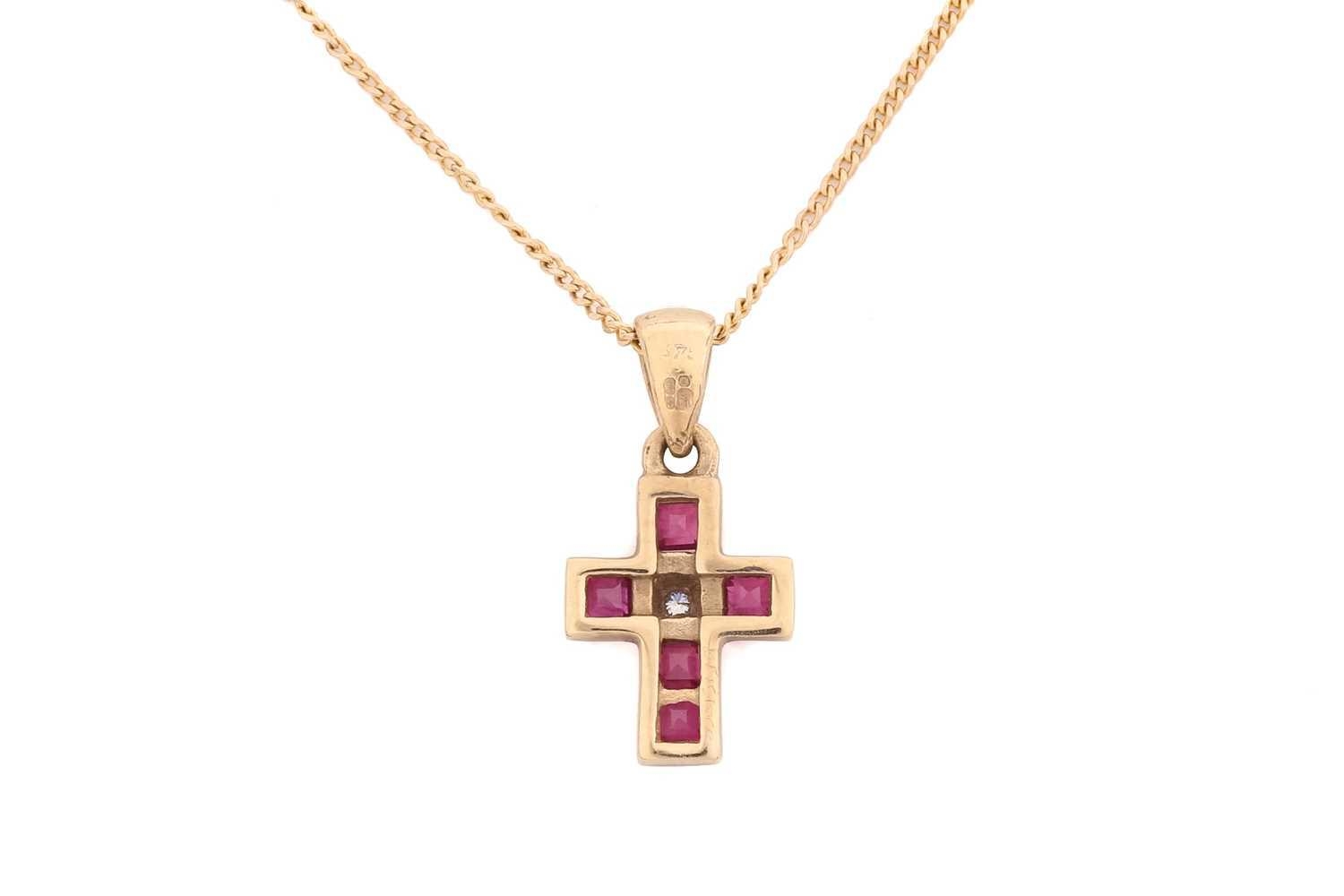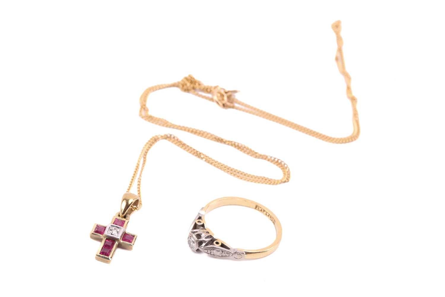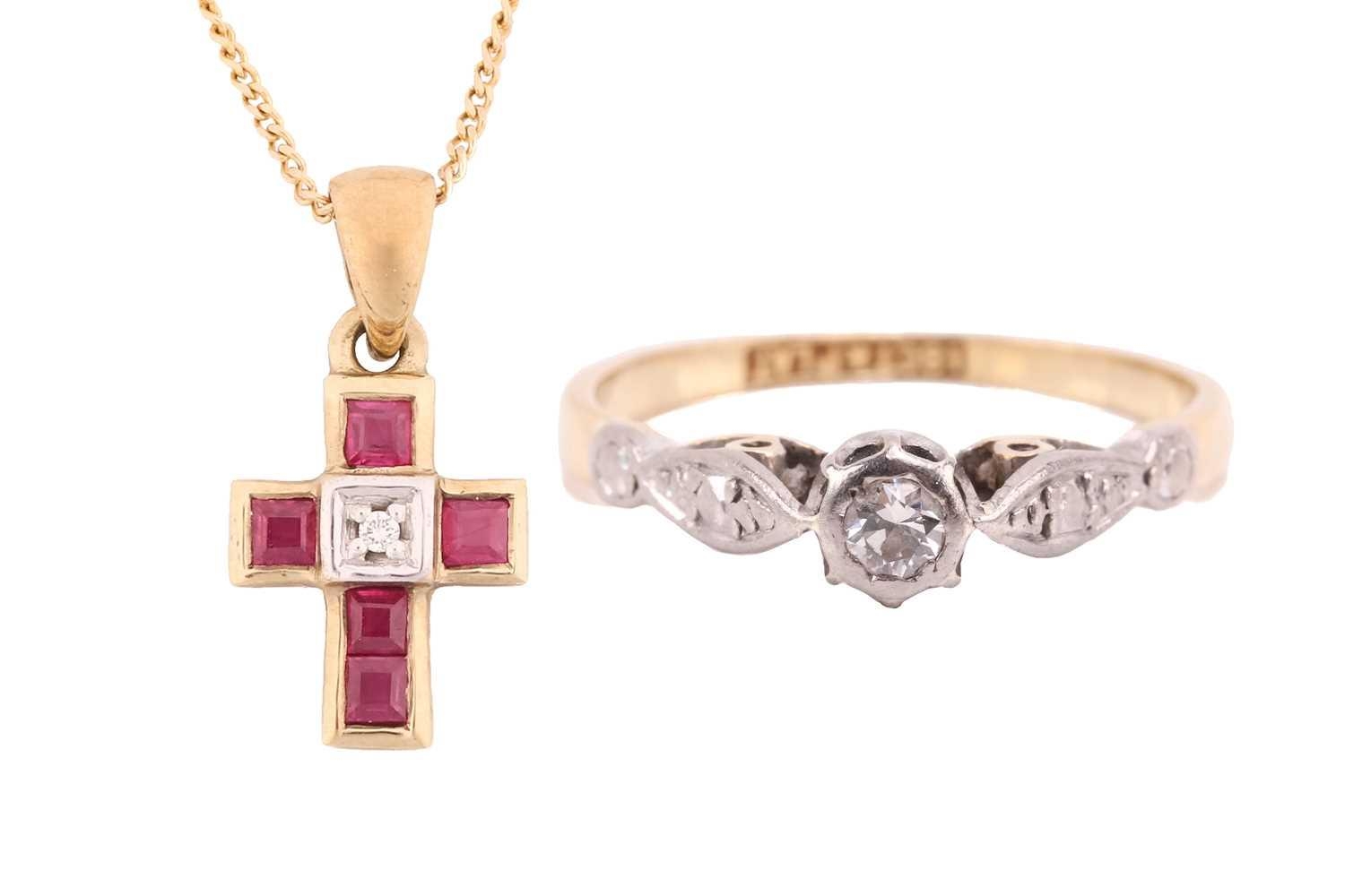 A diamond solitaire ring and a gem-set cross on chain; the ring contains a brilliant-cut diamond in a high-profile illusion mount, to shank marked '18ct&PLAT', size I; together with a synthetic ruby and diamond cross pendant on chain, centred with a brilliant-cut diamond and table-cut synthetic rubies on the arms, to a plain bail, suspending on curb link chain, both with British assay marks for 9ct gold, overall length 47.0 cm; Total weight of items 4.2 grams (2).