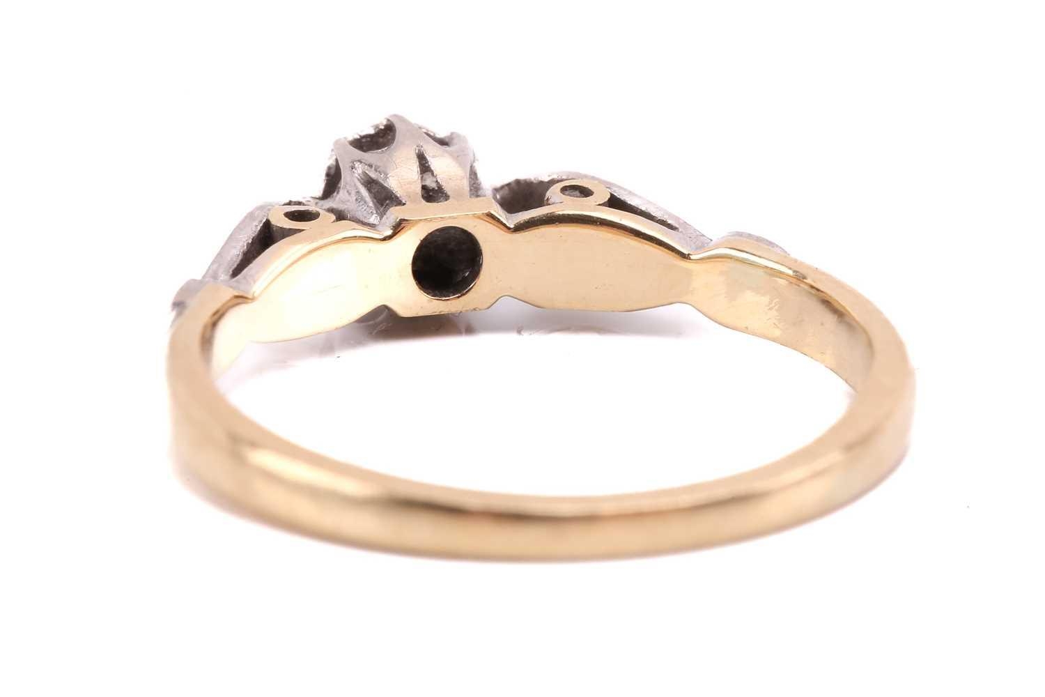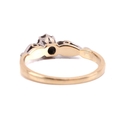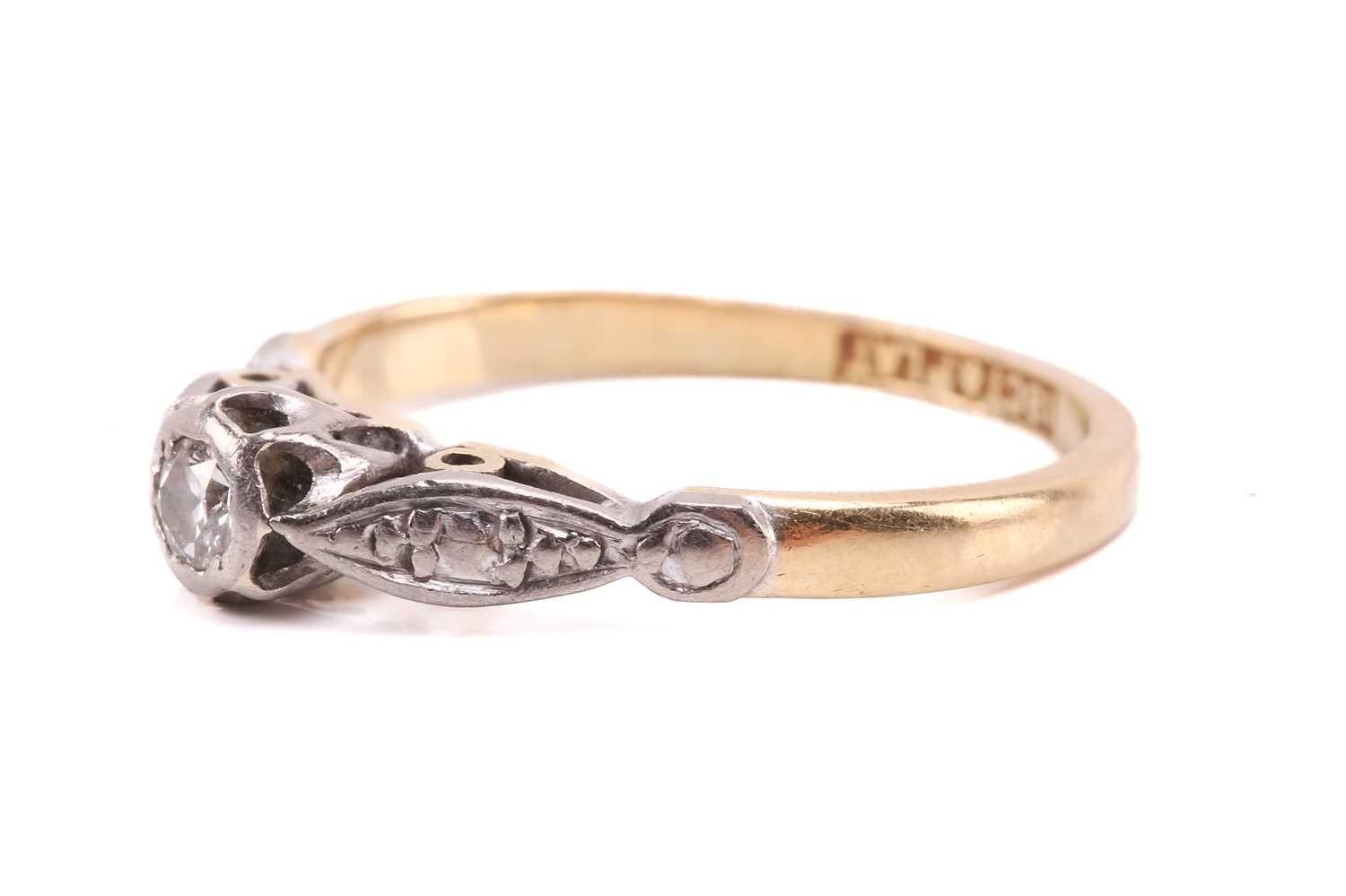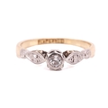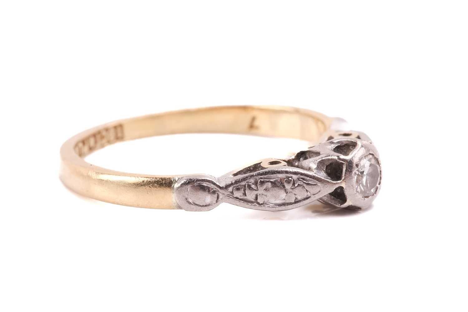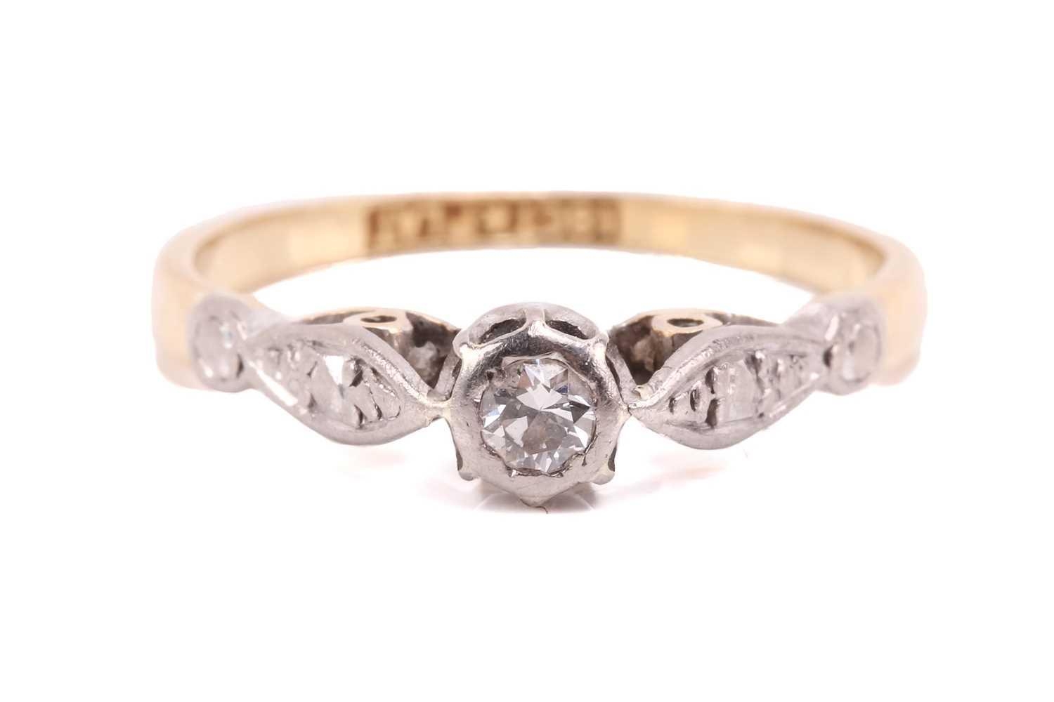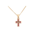 A diamond solitaire ring and a gem-set cross on chain; the ring contains a brilliant-cut diamond in a high-profile illusion mount, to shank marked '18ct&PLAT', size I; together with a synthetic ruby and diamond cross pendant on chain, centred with a brilliant-cut diamond and table-cut synthetic rubies on the arms, to a plain bail, suspending on curb link chain, both with British assay marks for 9ct gold, overall length 47.0 cm; Total weight of items 4.2 grams (2).
