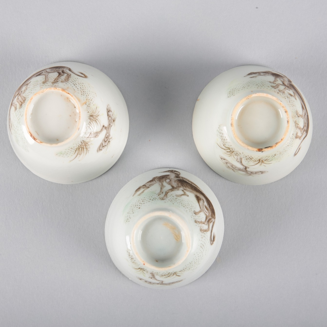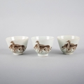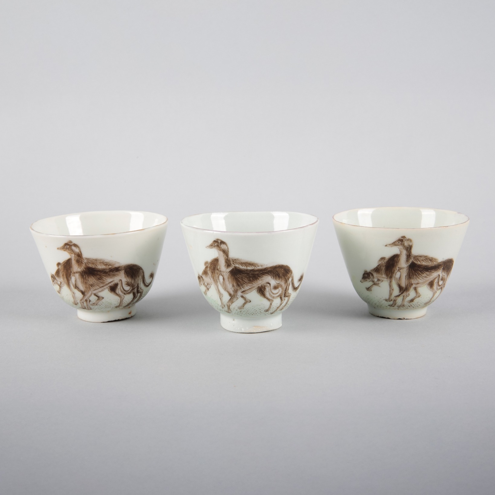 probably Qing dynasty, each of the three cups decorated with a pair of greyhounds, one with head raised alert, the other following a scent, a lingzhi plant to the reverse, two 5cm high, one 5.5cm high (3)