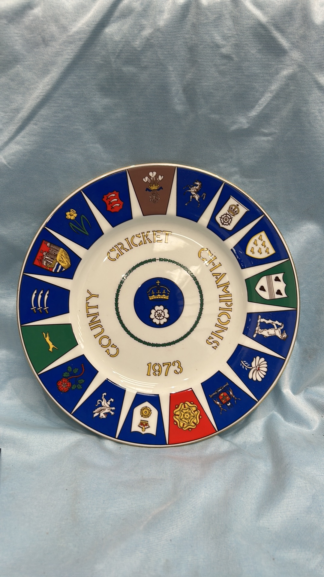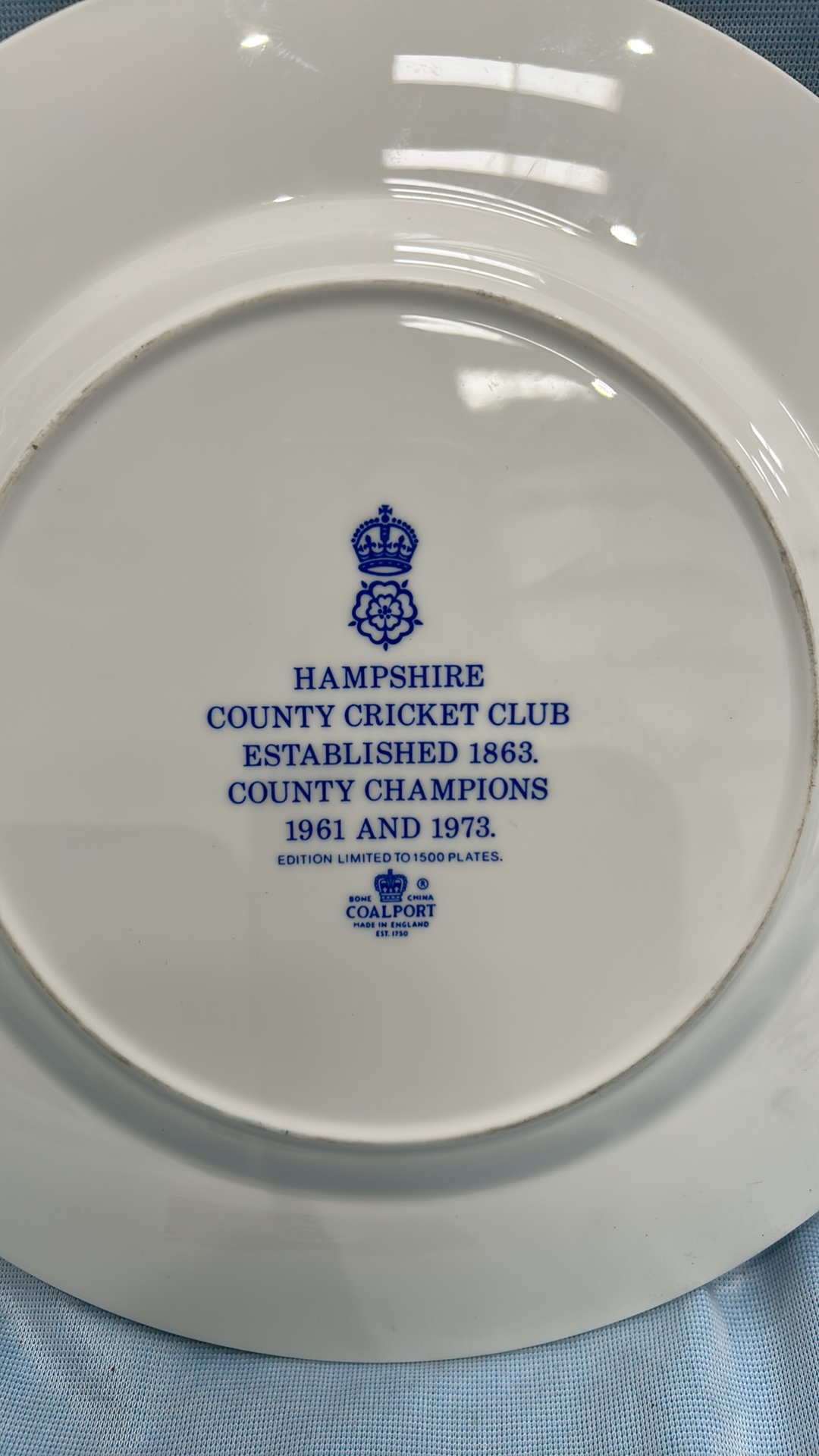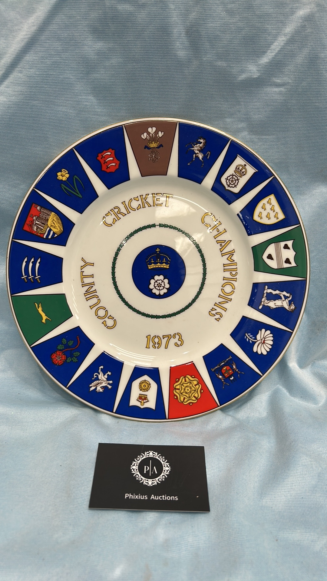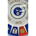 Coalport bone china commemorative plate, ‘County Cricket Champions 1973’, produced for Hampshire County Cricket Club; polychrome county crests, gilt rim. Limited edition of 1,500.