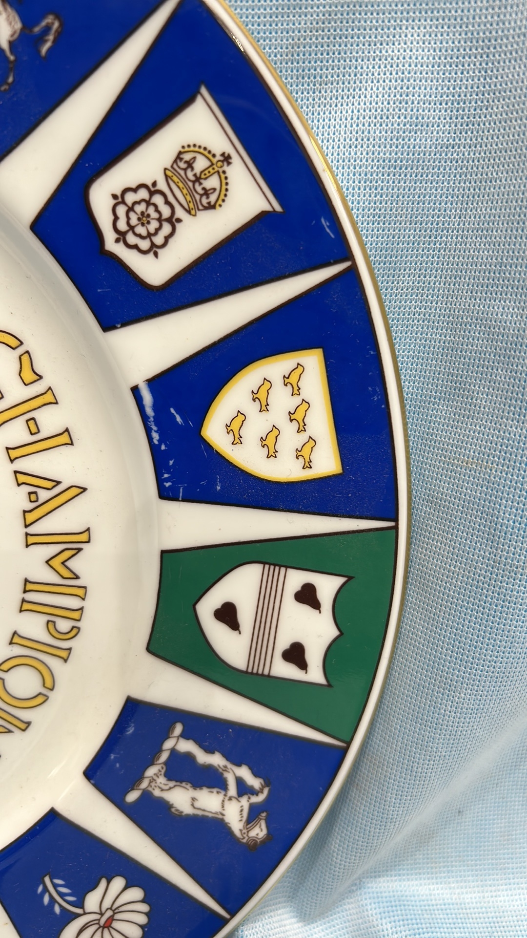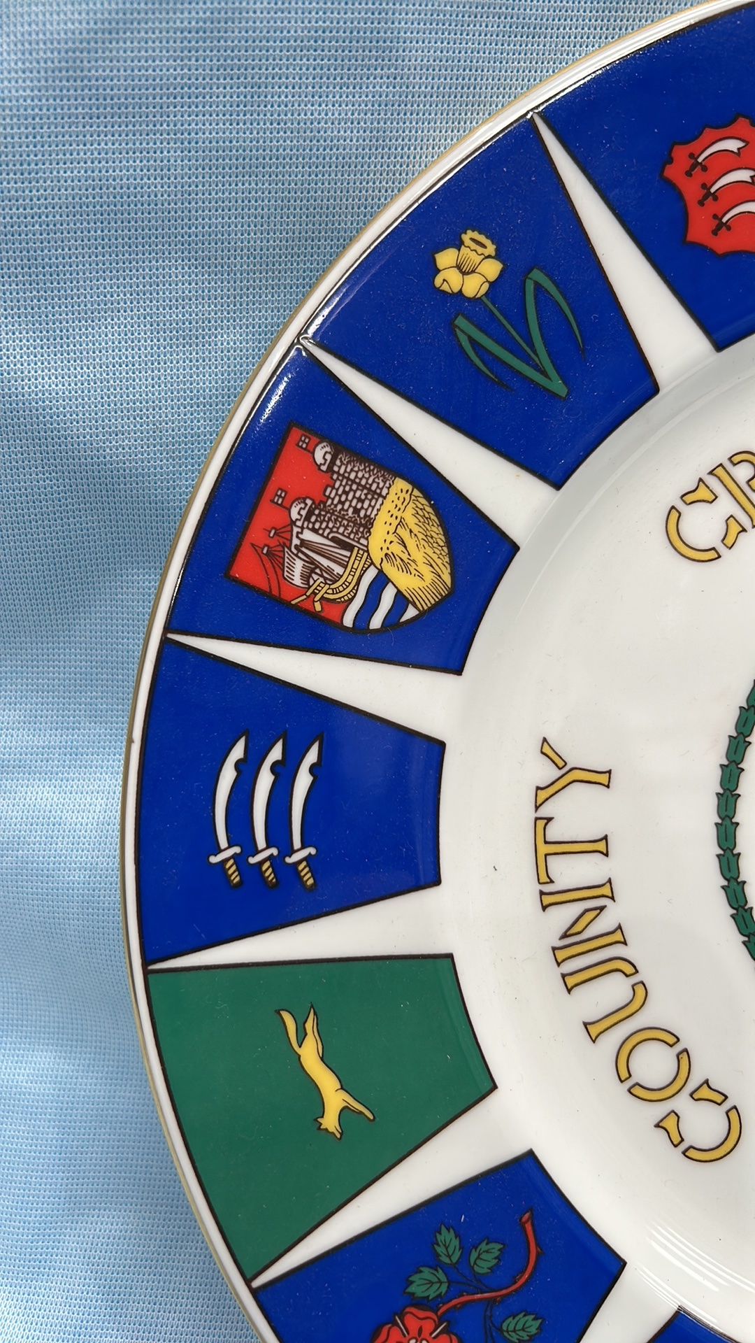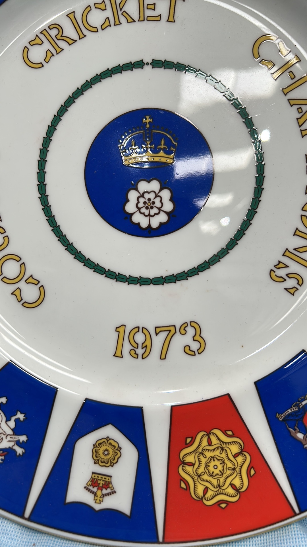 Coalport bone china commemorative plate, ‘County Cricket Champions 1973’, produced for Hampshire County Cricket Club; polychrome county crests, gilt rim. Limited edition of 1,500.