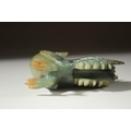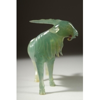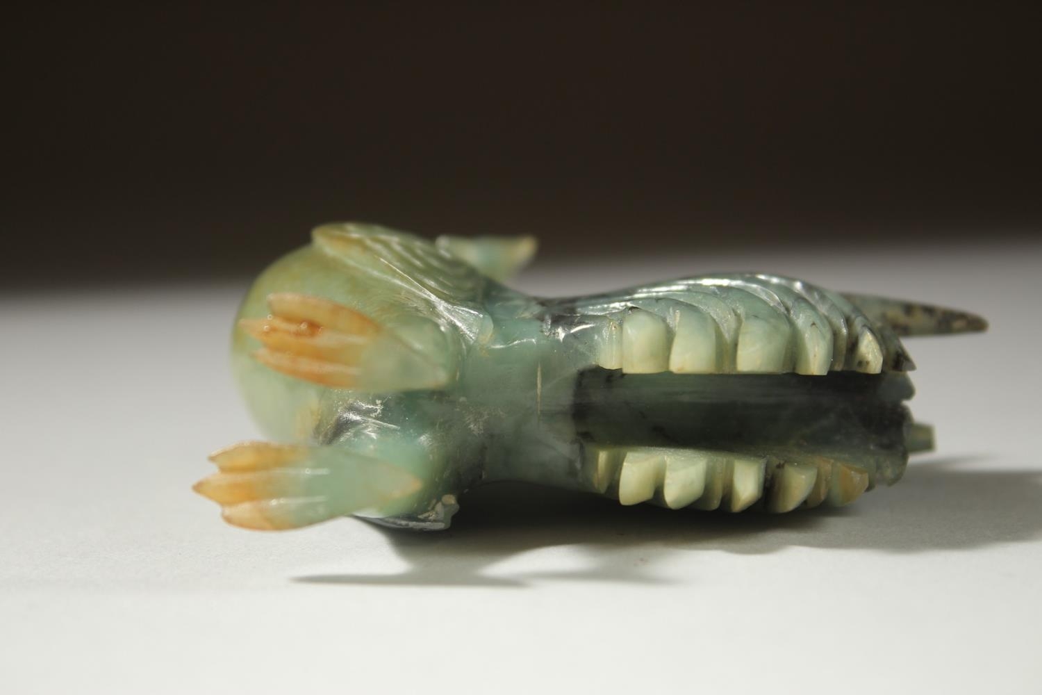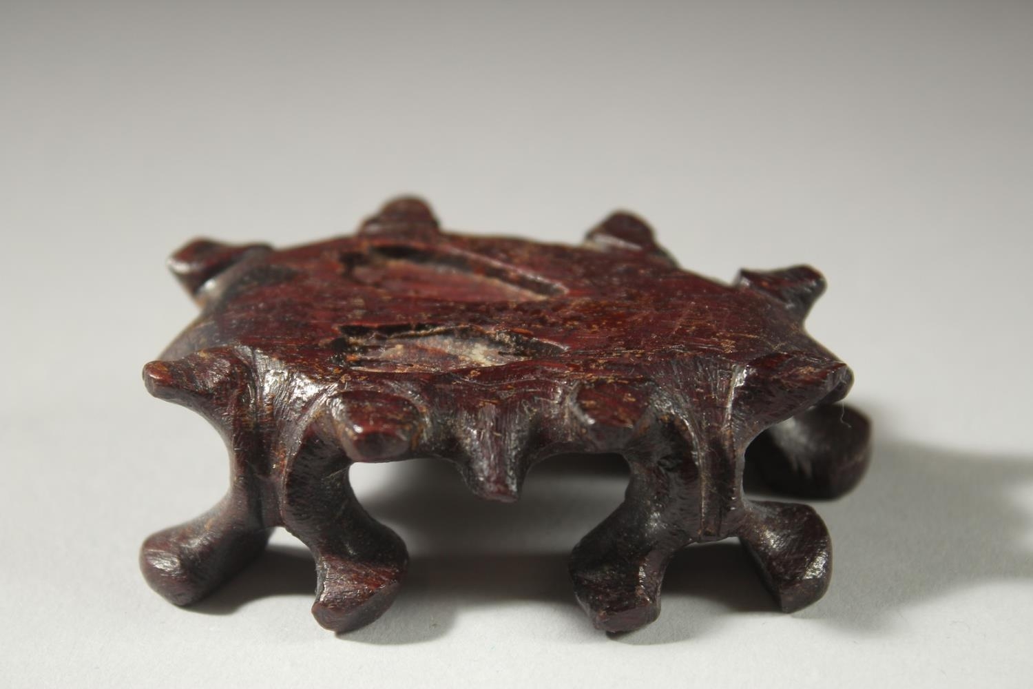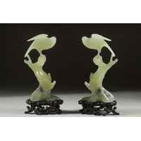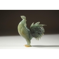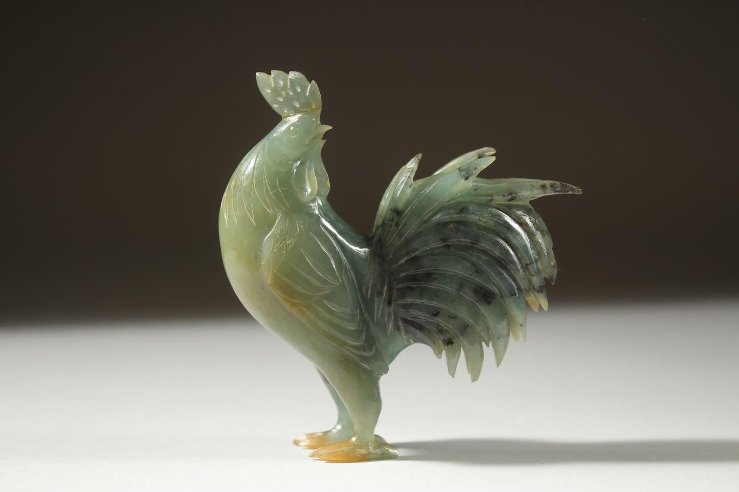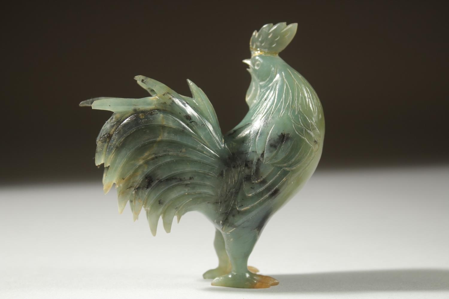 A CARVED JADE FIGURE OF A COCKEREL on a wooden stand, 11cm high (on stand).