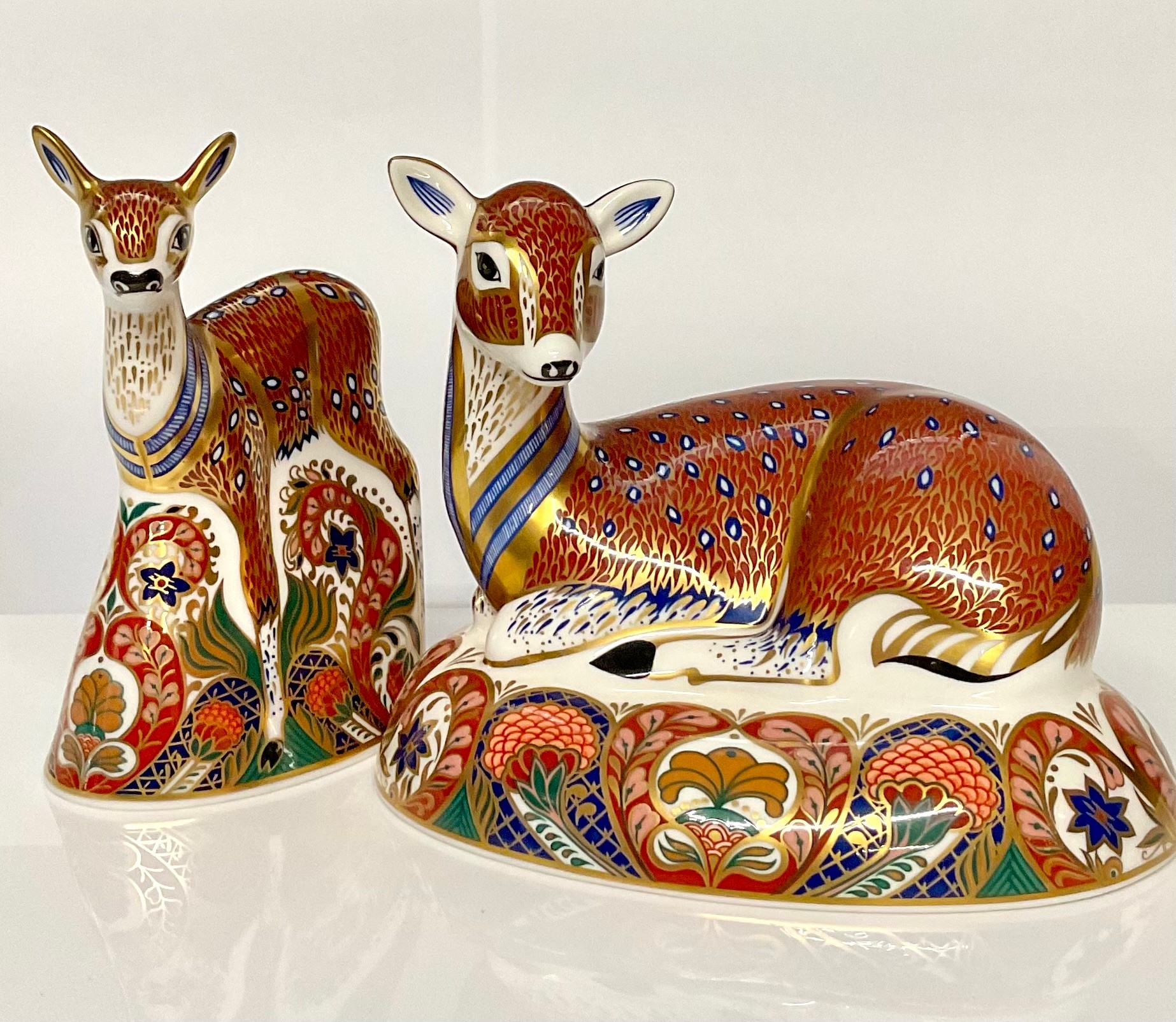 A Royal Crown Derby paperweight, Roe Deer Hind, Collectors Guild exclusive, gold stopper, 16.5cm wide, printed mark in red; another, Fawn, Collectors Guild exclusive, gold stopper, 13.5cm high, printed mark in red (2)