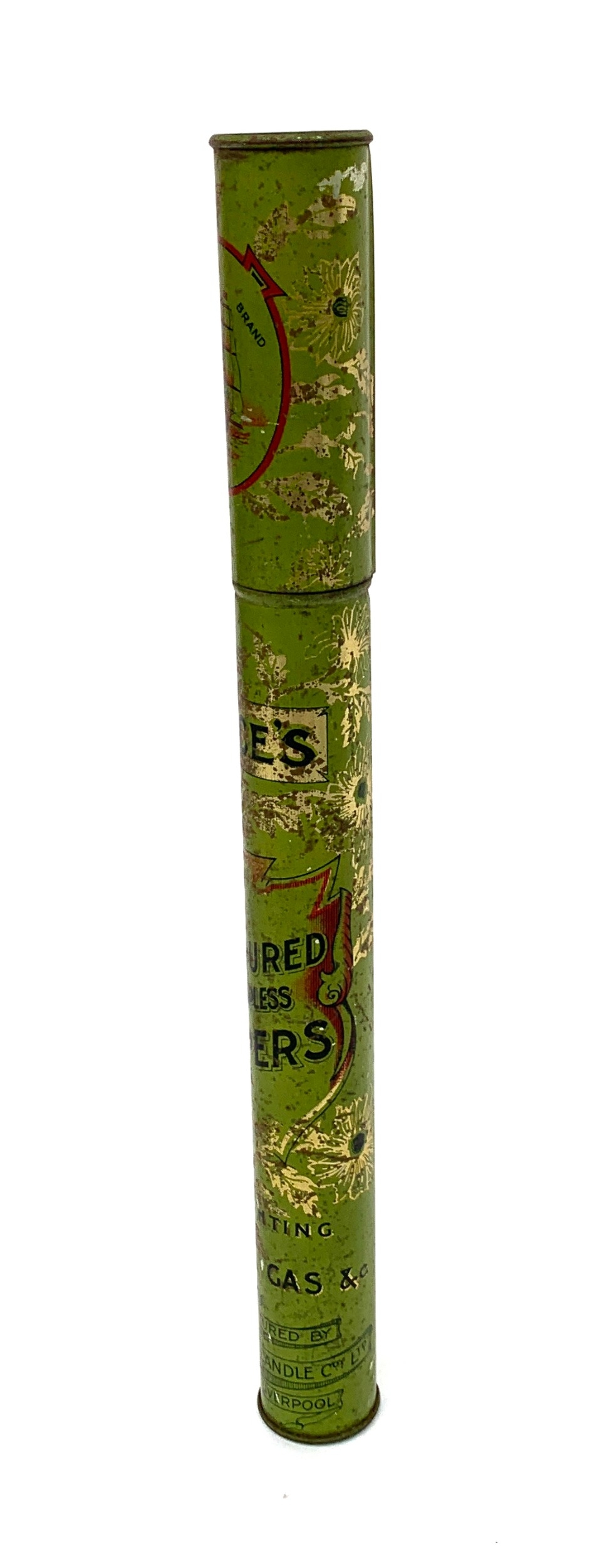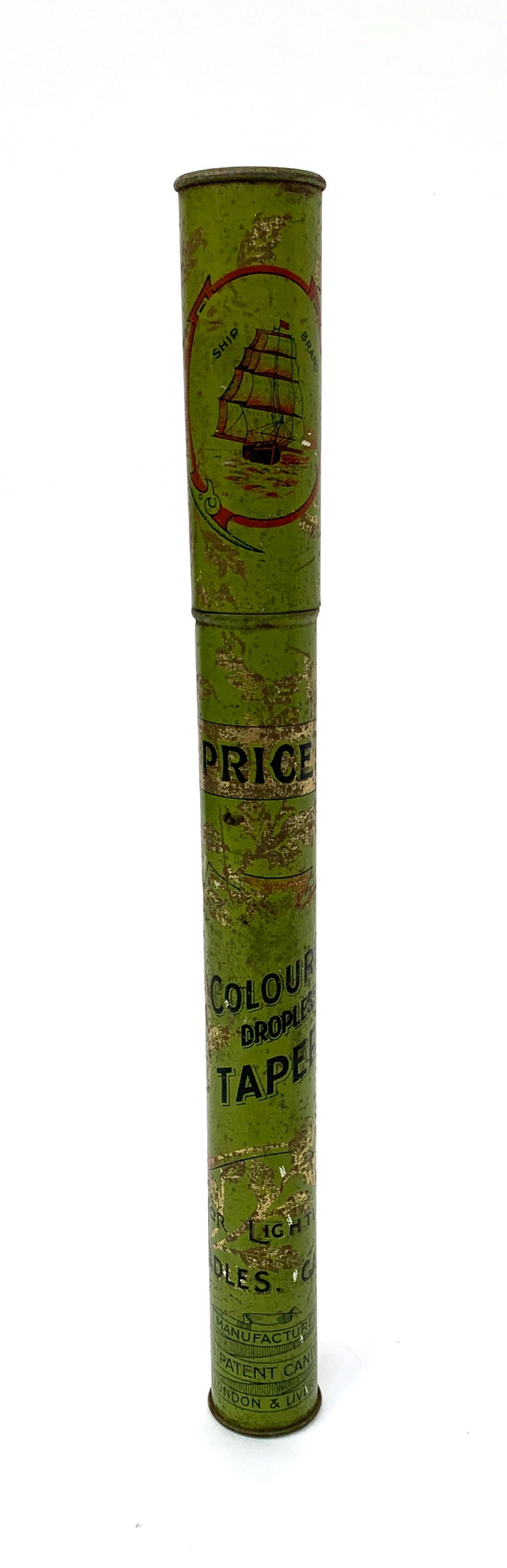 An early 20th century Price's Coloured Dropless Tapers green tin, 31cmH
