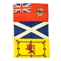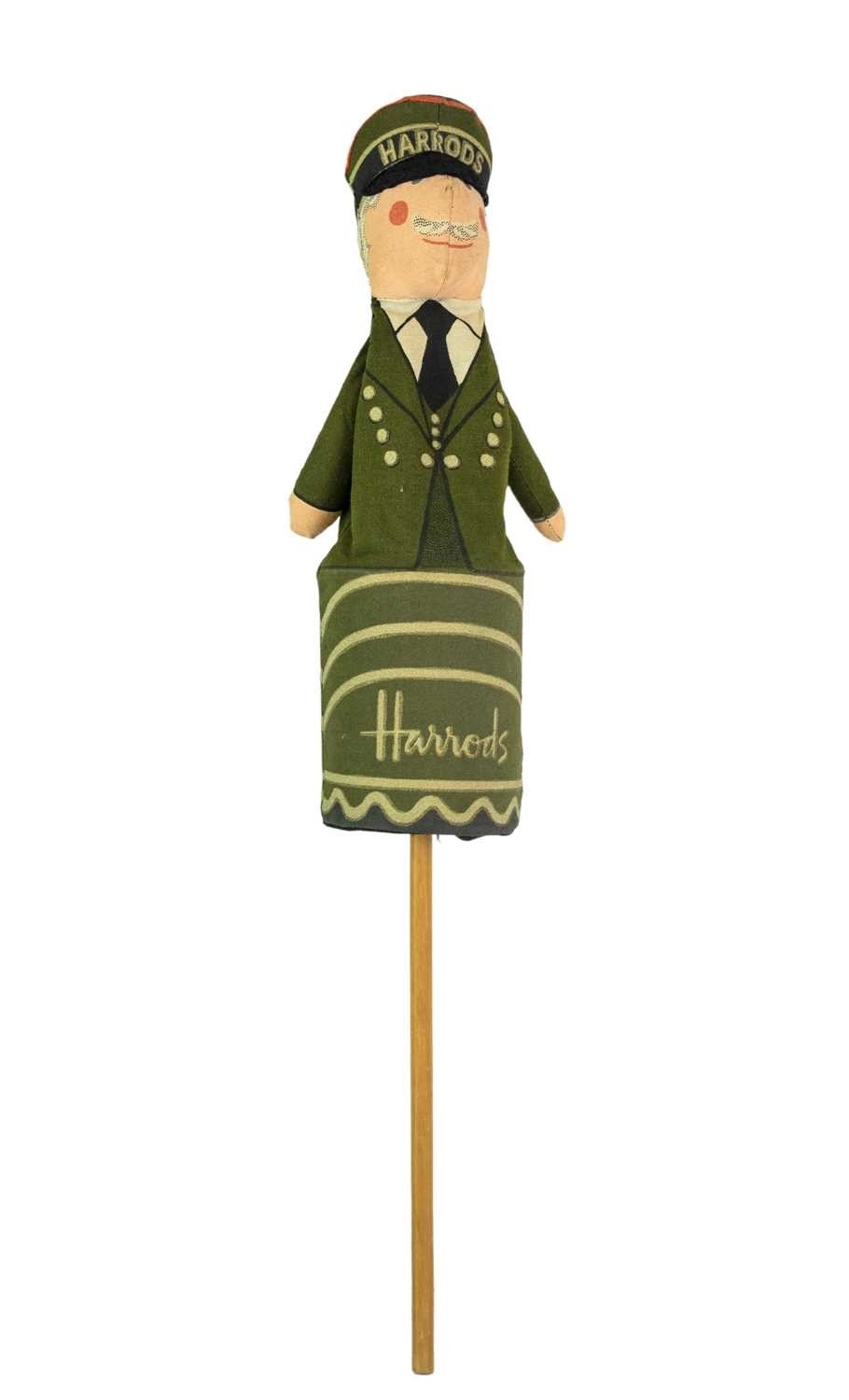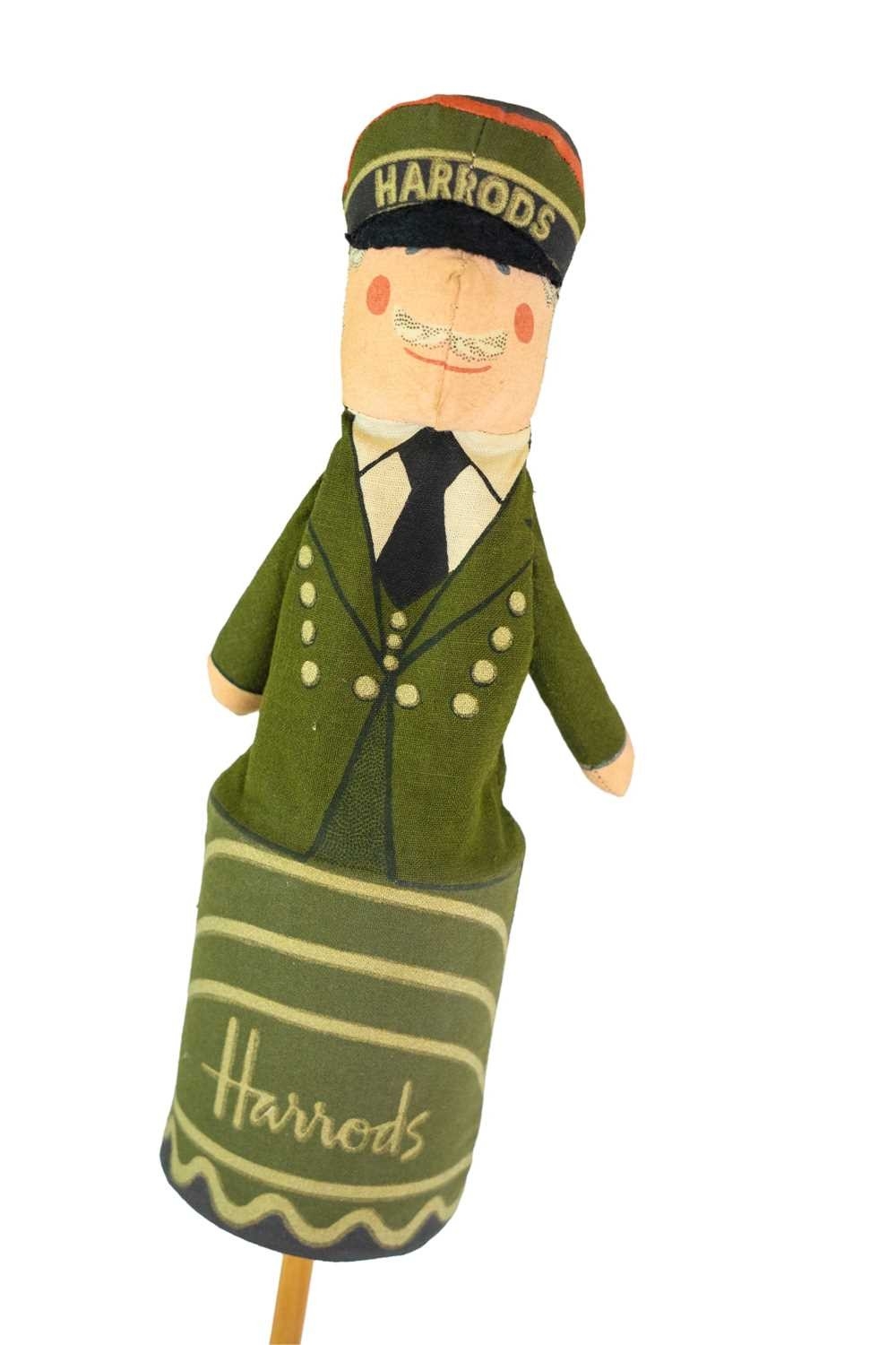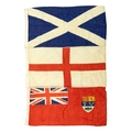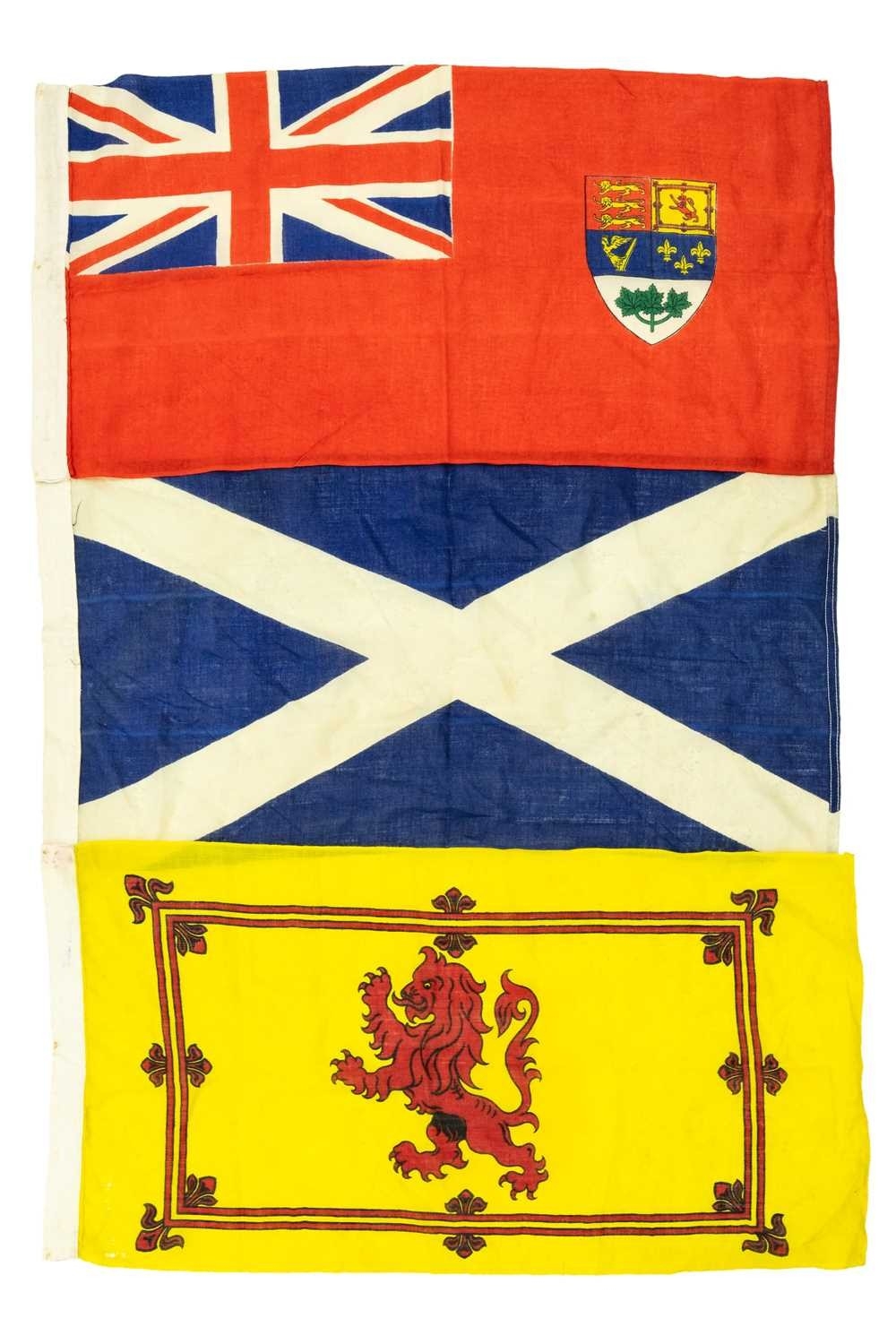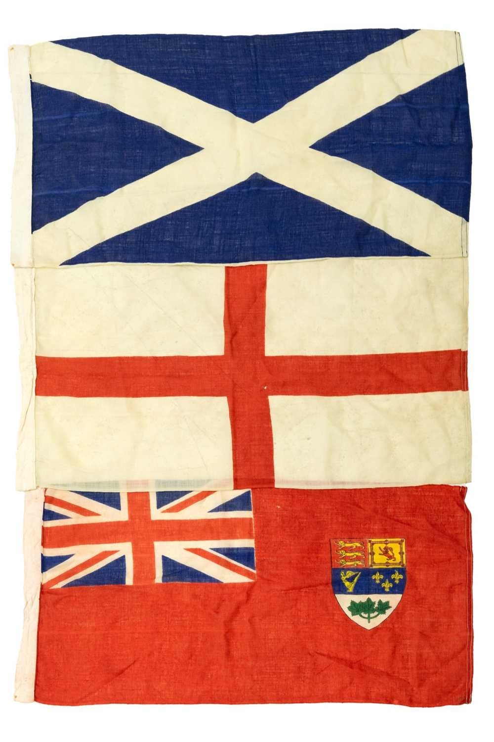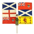 A collection of linen ensigns. Includes two Canadian Red ensigns, two Scottish ensigns, a Scottish rampant lion ensign and a St. George cross ensign, all approx 91cm x 44cm, with a Harrods pop up doorman designed by Anne Wilkinson, and dated 1982 (7).