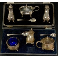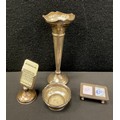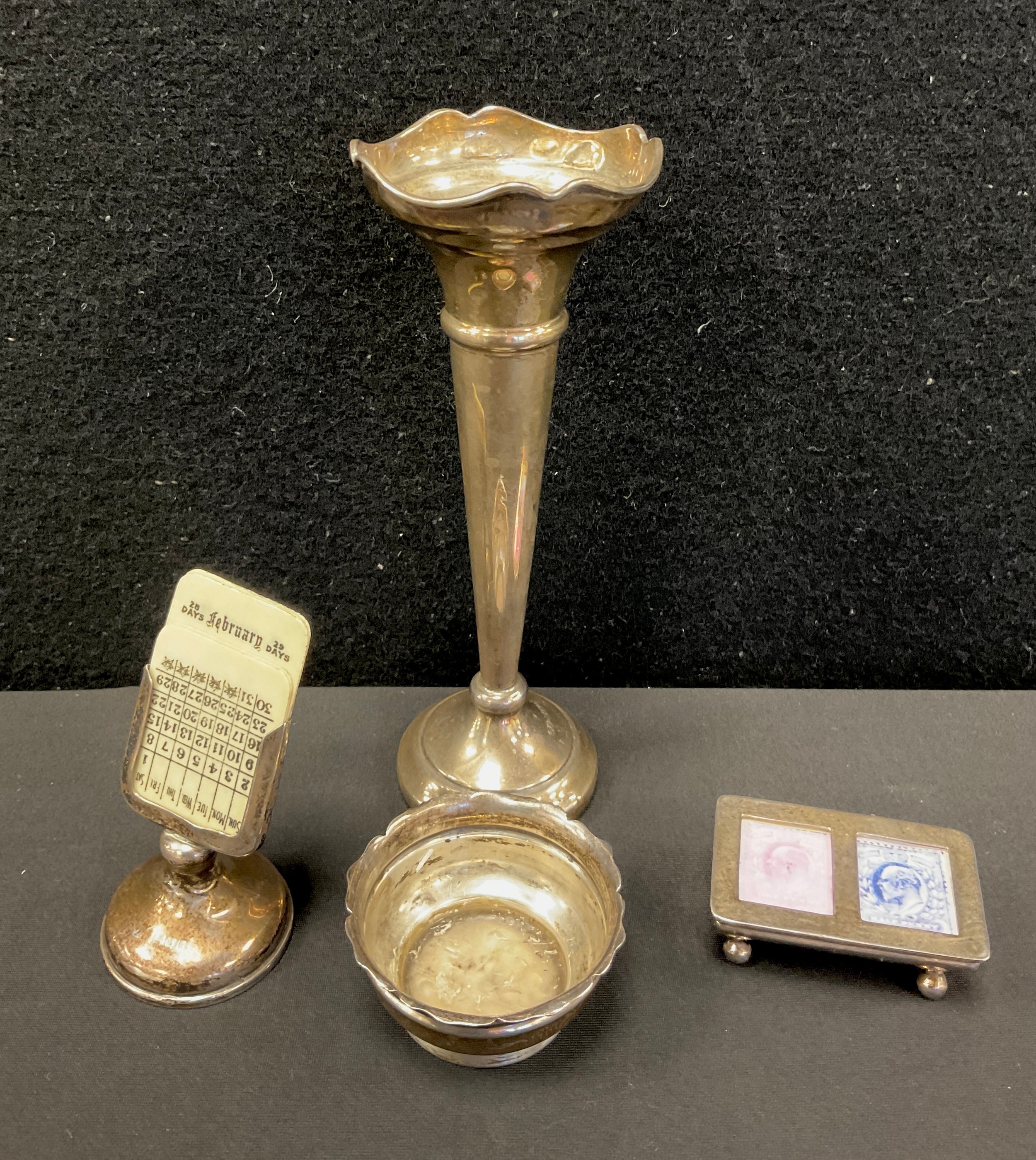 An Edwardian silver table salt, Birmingham 1901; desk calendar, marks worn; stamp case, Sheffield 1976; bud vase with weighted base (4)