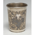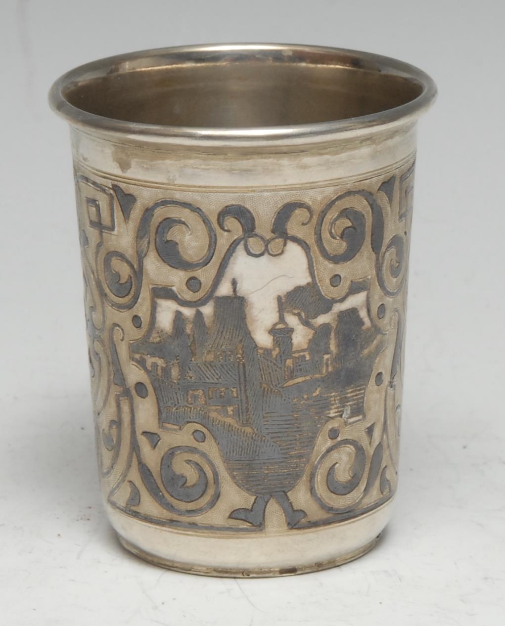 A Russian silver and niello tapered cylindrical beaker, decorated with townscape vignettes and strapwork, 7cm high, Moscow c.1865