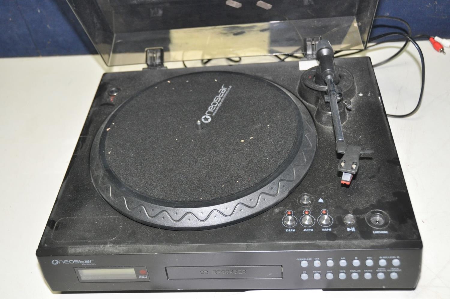 A NEOSTAR NTCD18B MODERN MUSIC PLAYER with turntable, tape, CD recorder, USB and Aux inputs no remote (PAT pass and working)