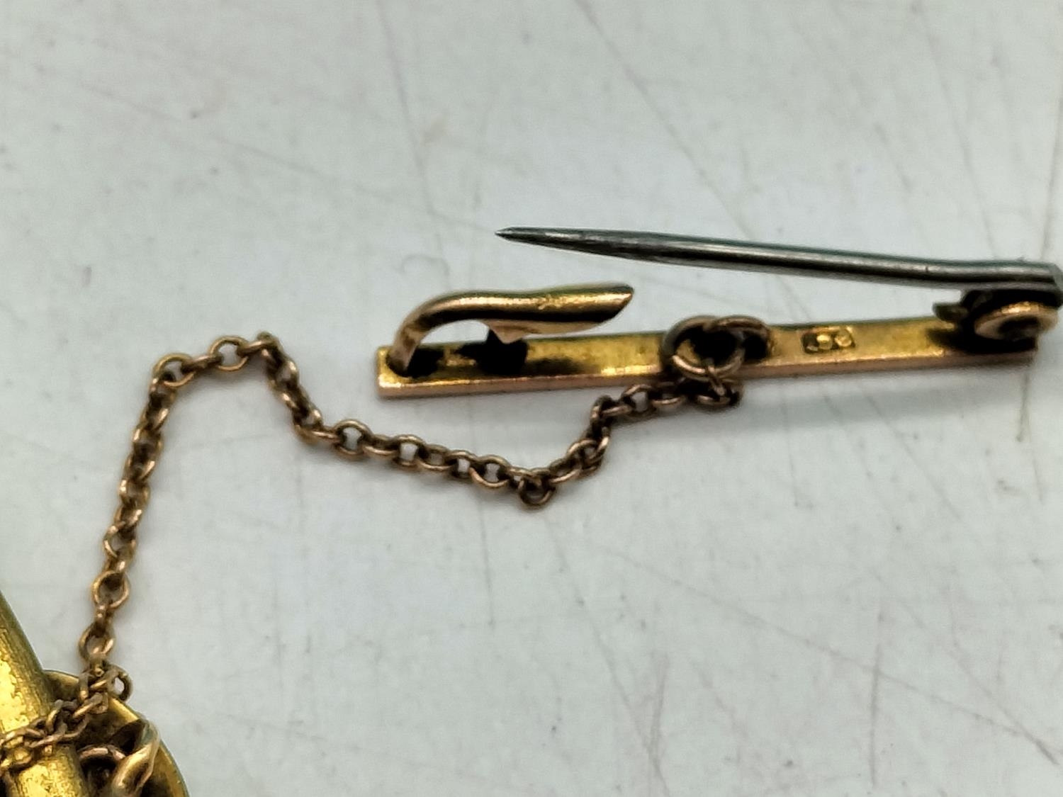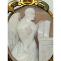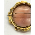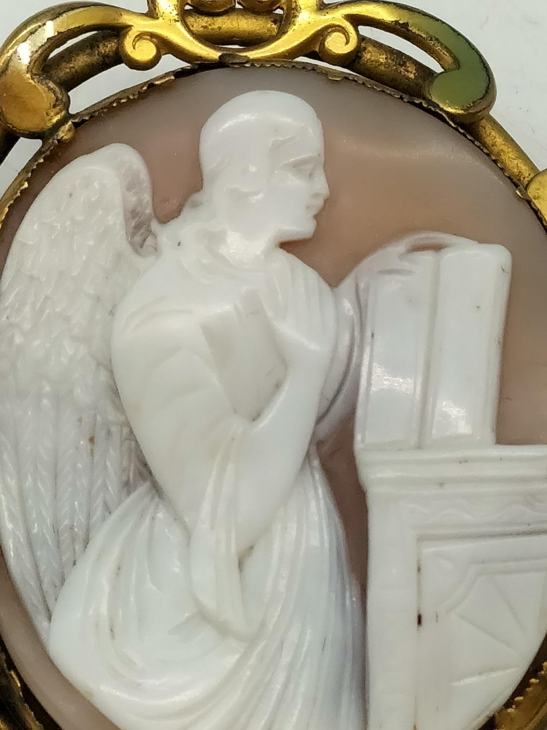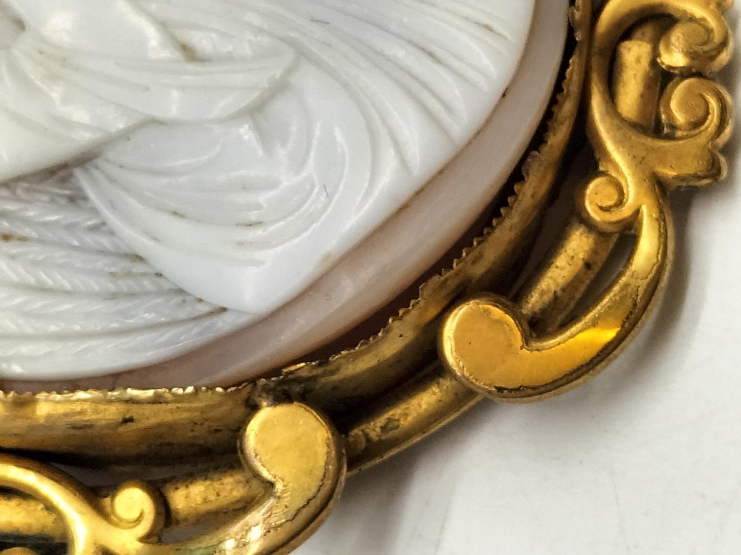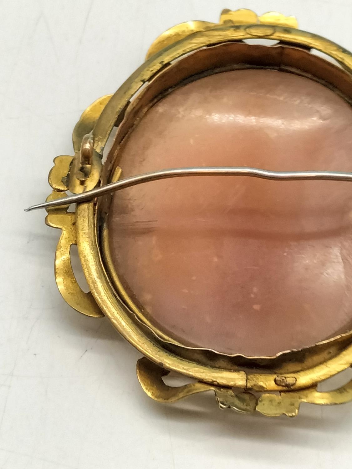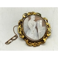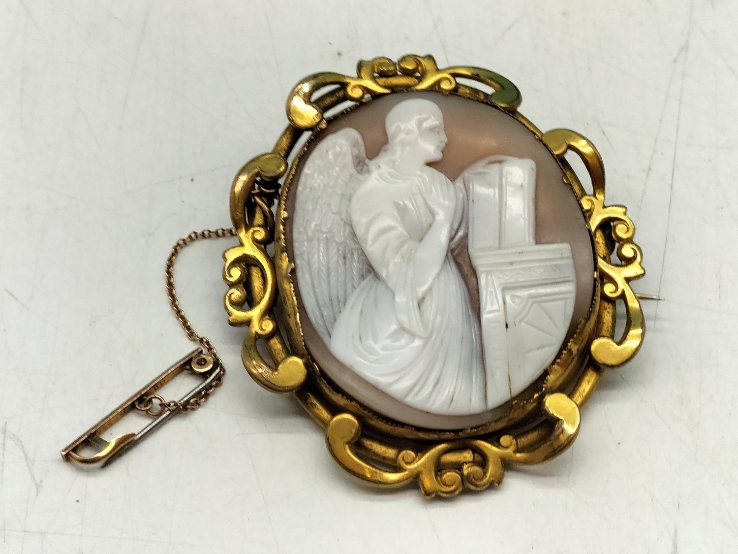 Antique Pinchbeck Large 6cm Cameo Brooch with 9ct Gold Safety Chain and Steel Pin. Some Damage to Mount.