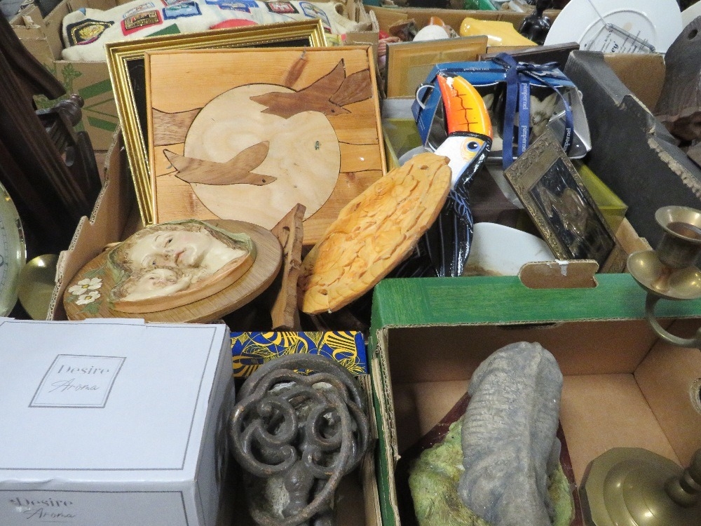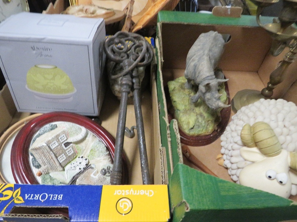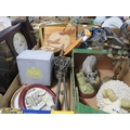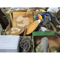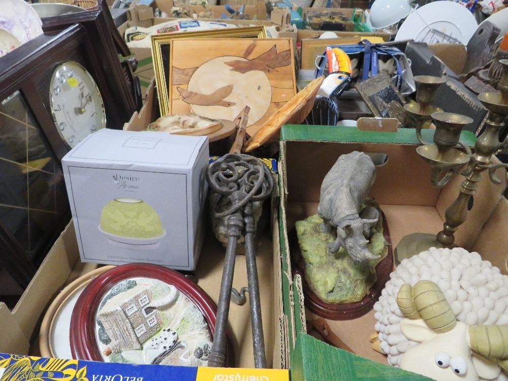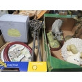 Three trays of collectables to include a candelabra and a clock etc