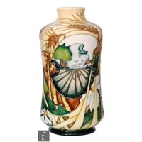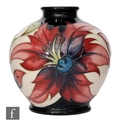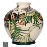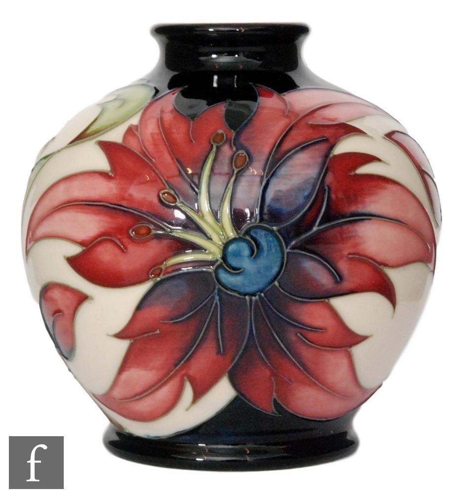 A small Moorcroft Pottery limited edition vase of footed ovoid form with flared collar neck, decorated with swirled flowers and foliage after a design by Rachel Bishop, impressed and painted marks, numbered 19/30, boxed, height 10.5cm.
