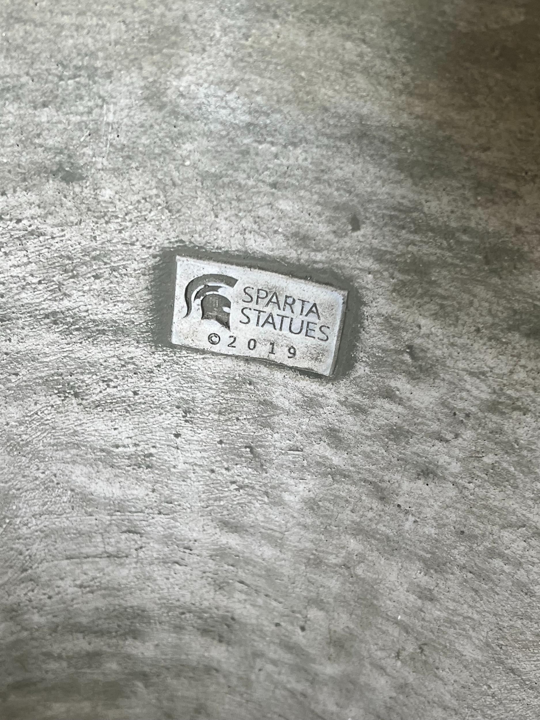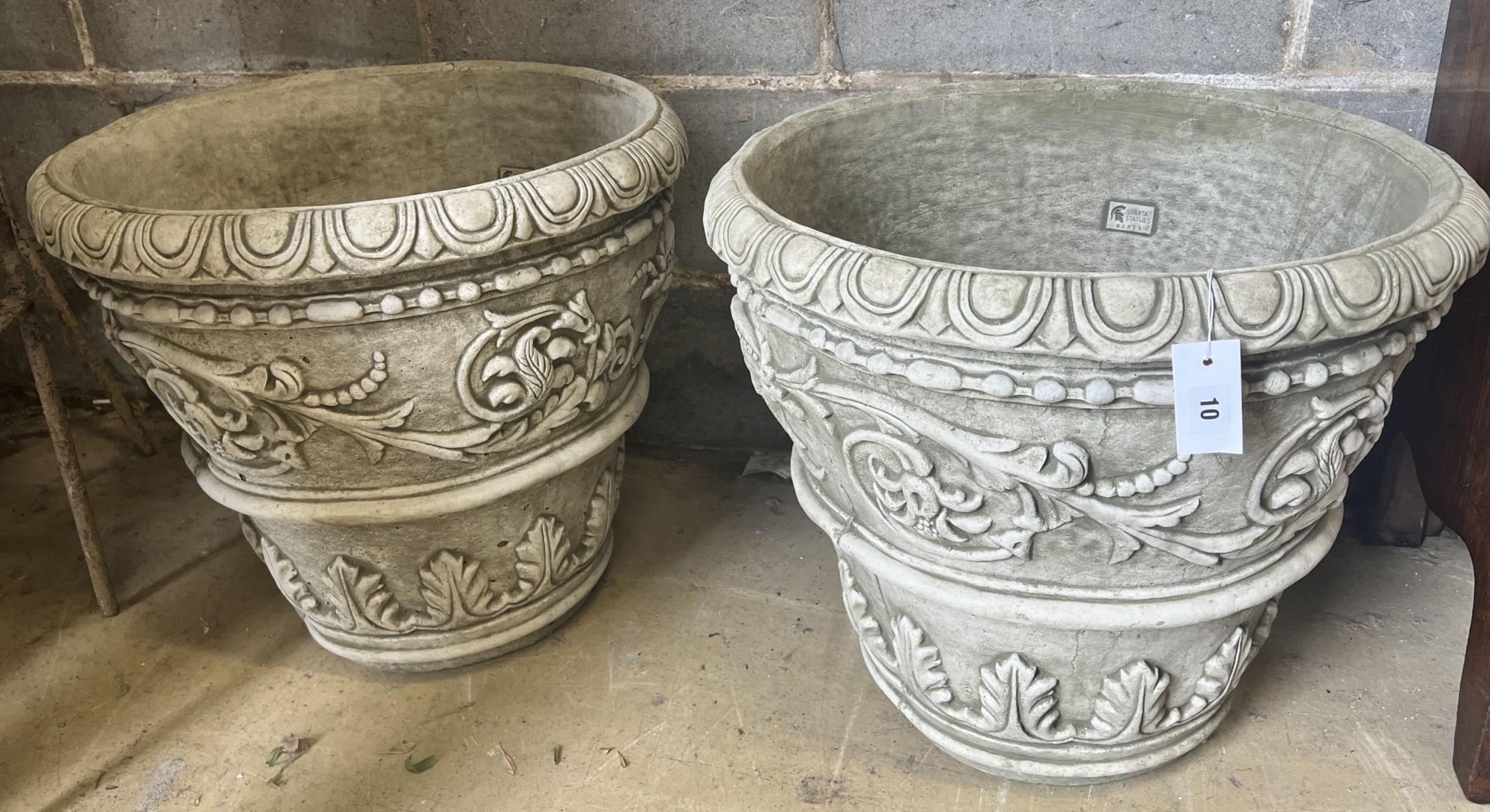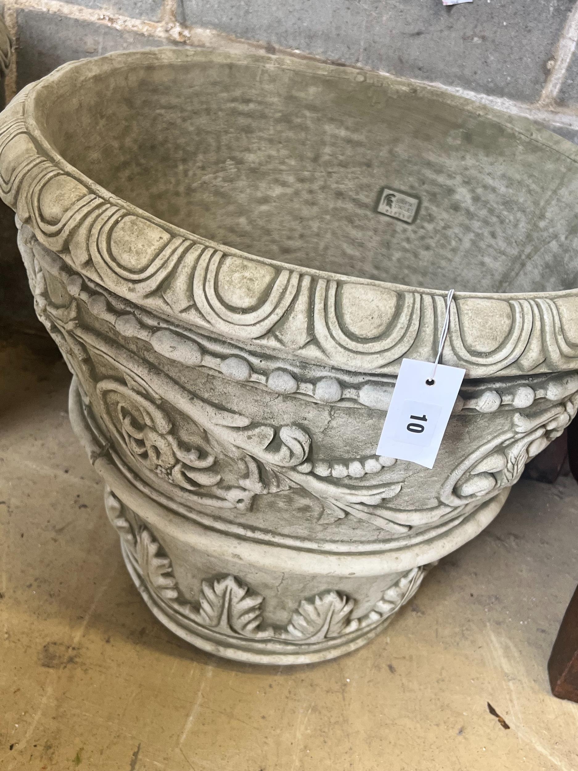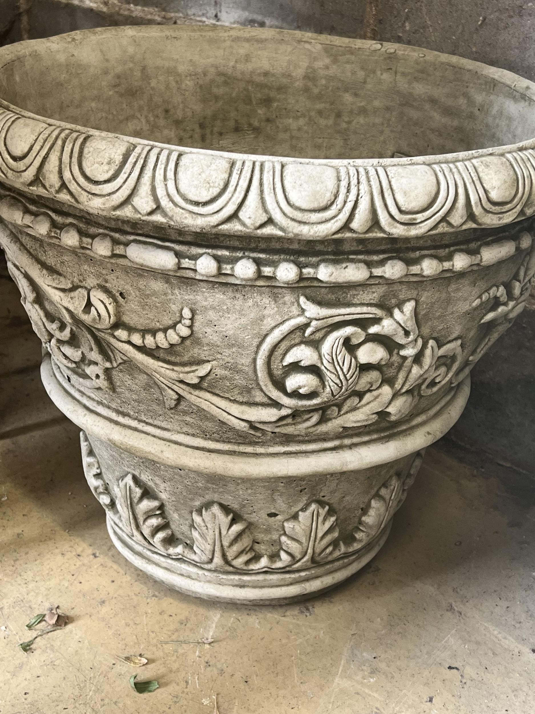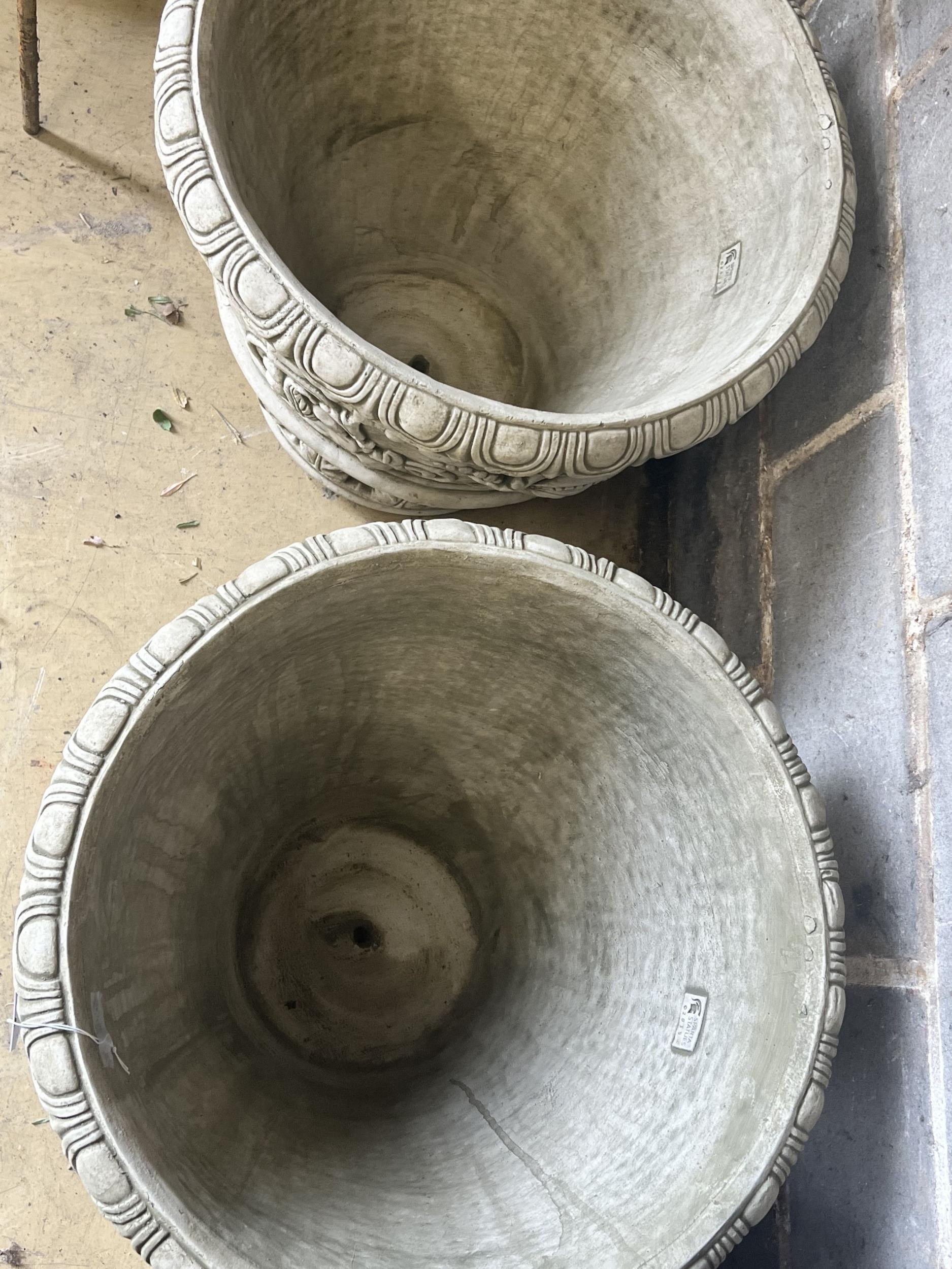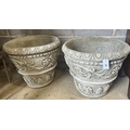 A pair of large reconstituted stone circular garden planters, diameter 55cm height 49cm