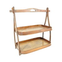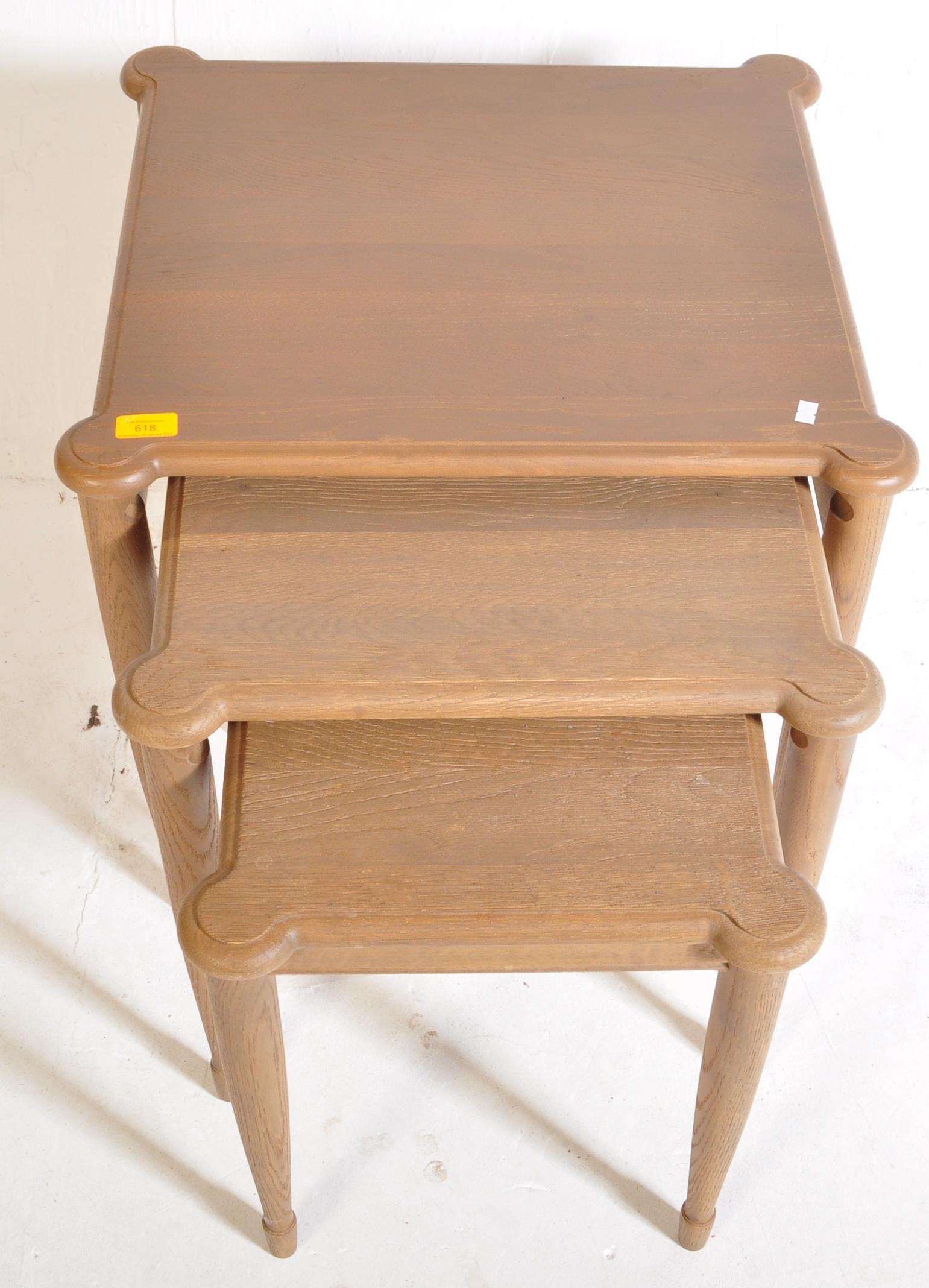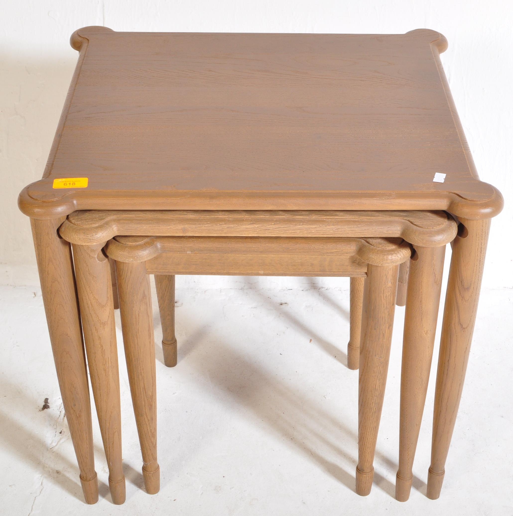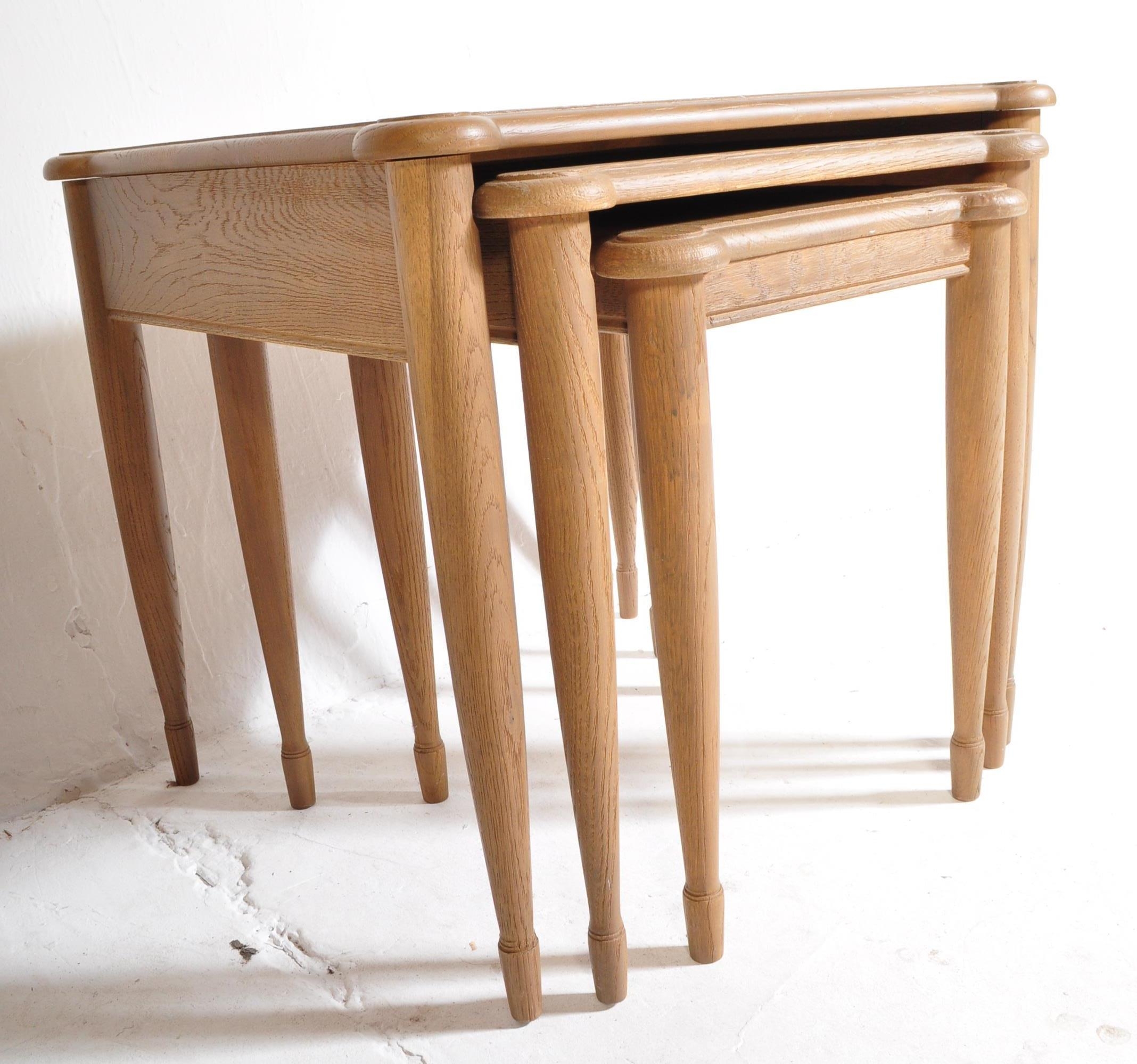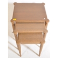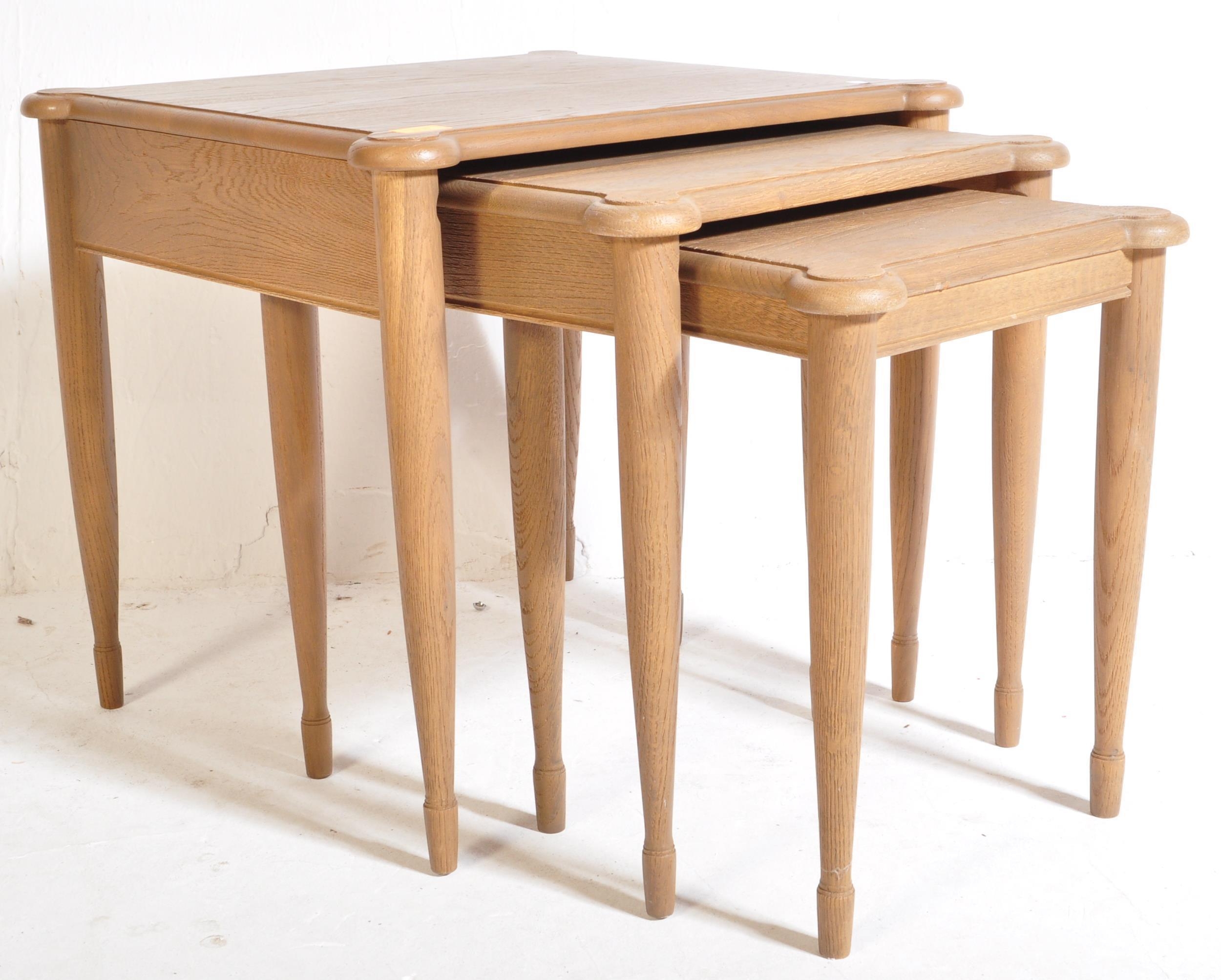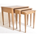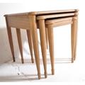 A retro 20th century oak wood nest of graduating tables. The tables being raised on turned and tapering legs with square tops having graduating sizes tabletops.