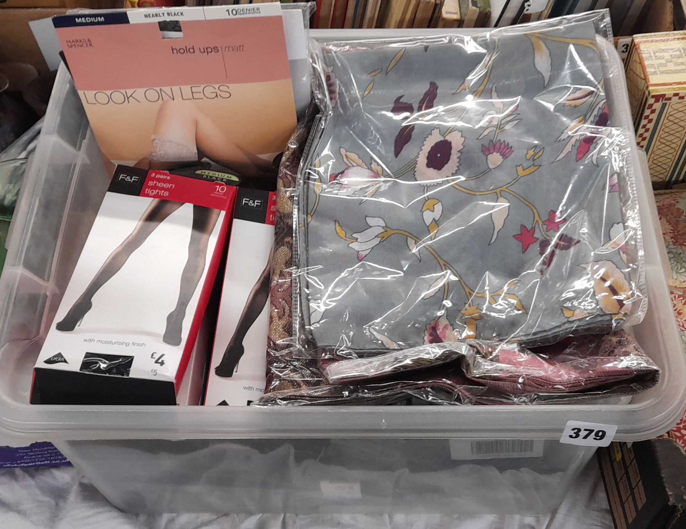 CRATE OF CLUTCH BAG, VARIOUS HOSIERY, PASHMINA