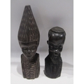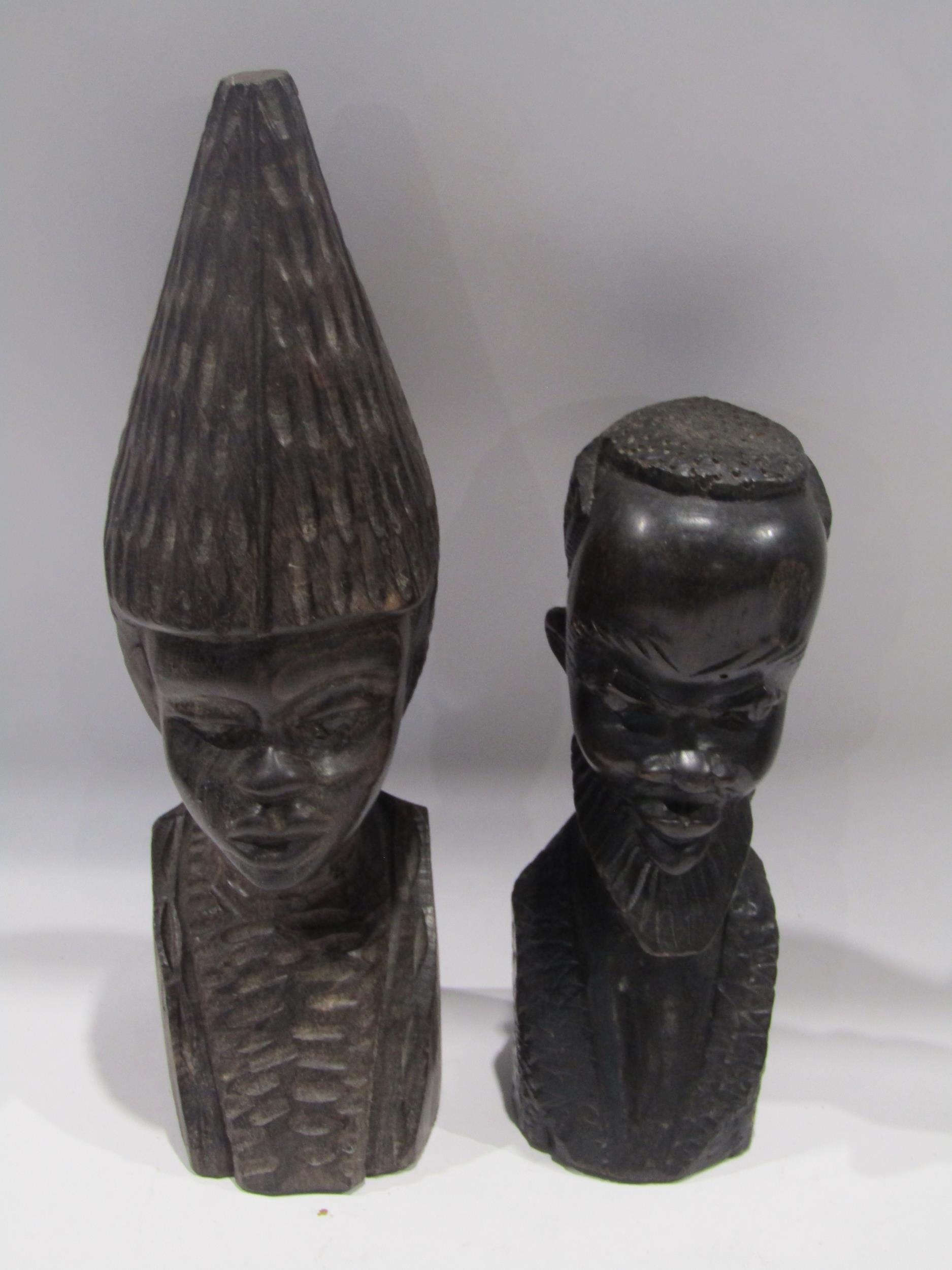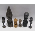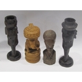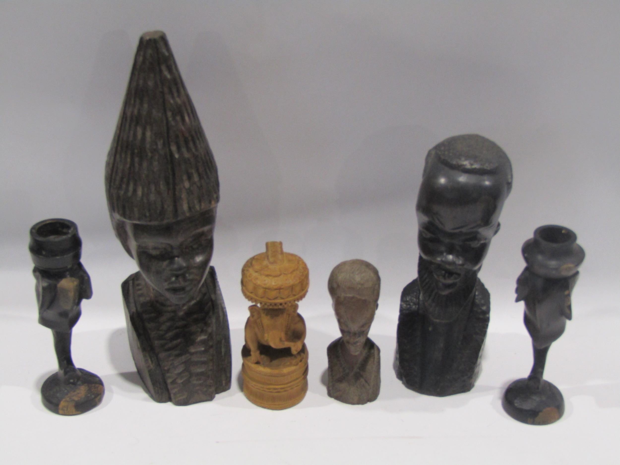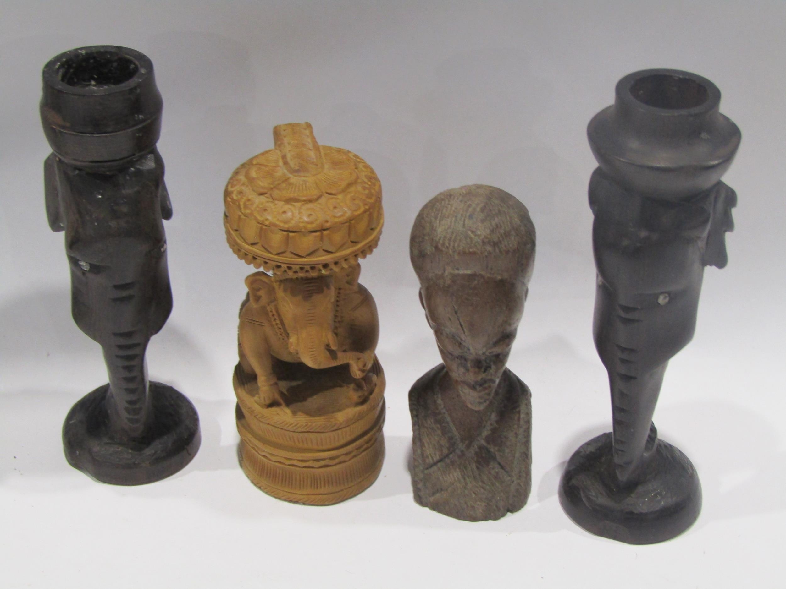 A Selection of African figures, tallest 26cm, and a pair of Elephant head form candlesticks (6)