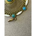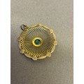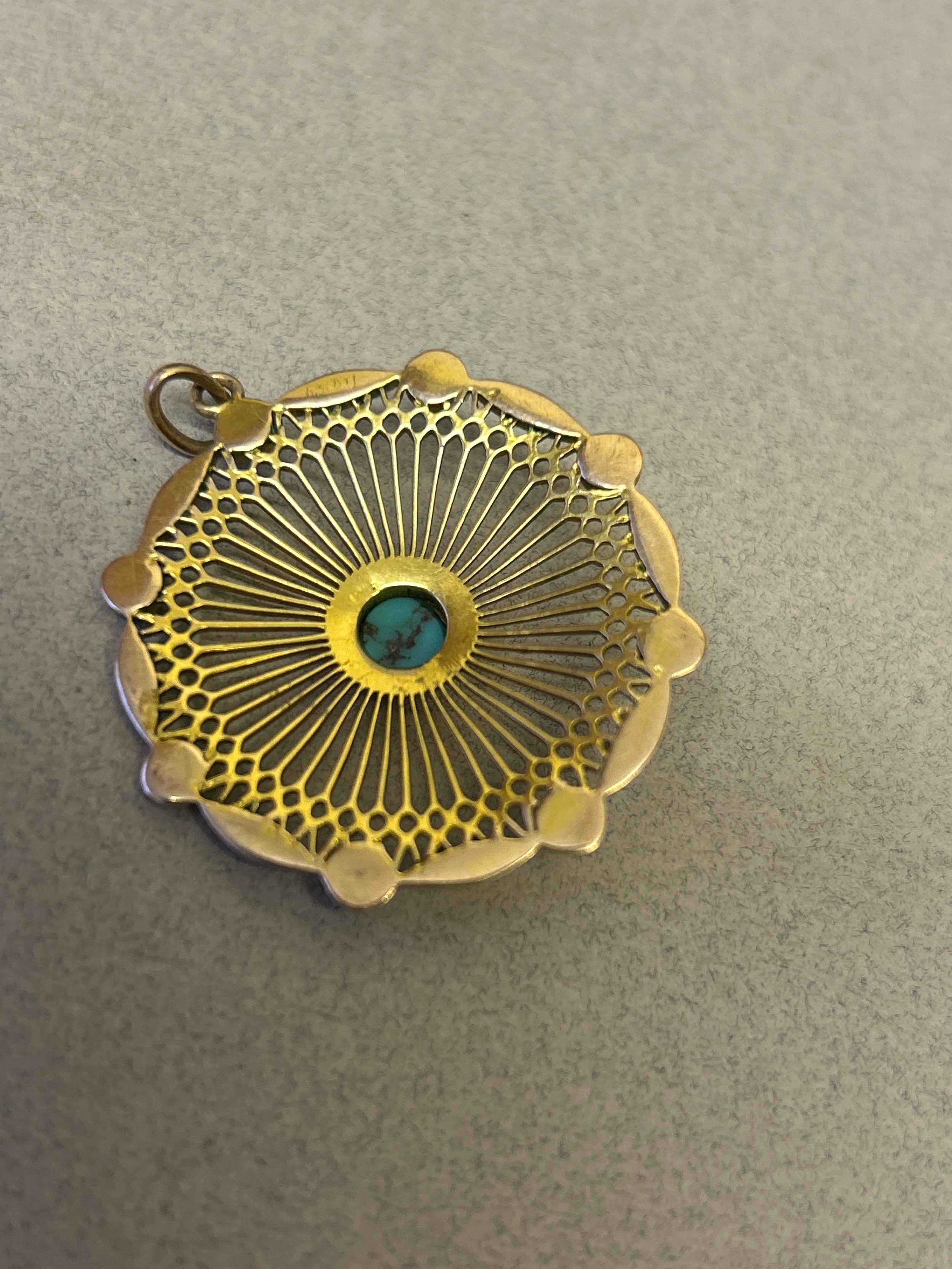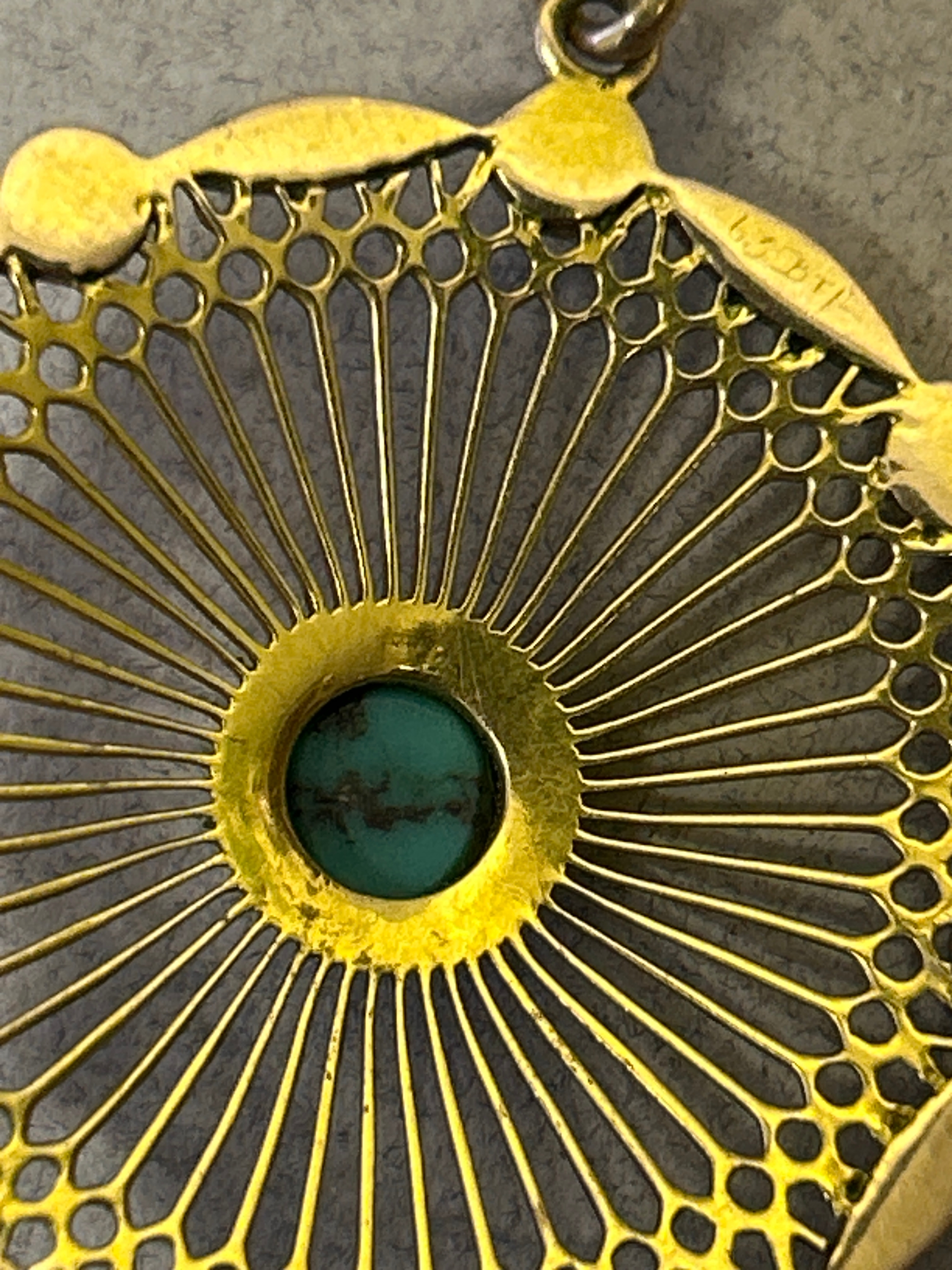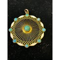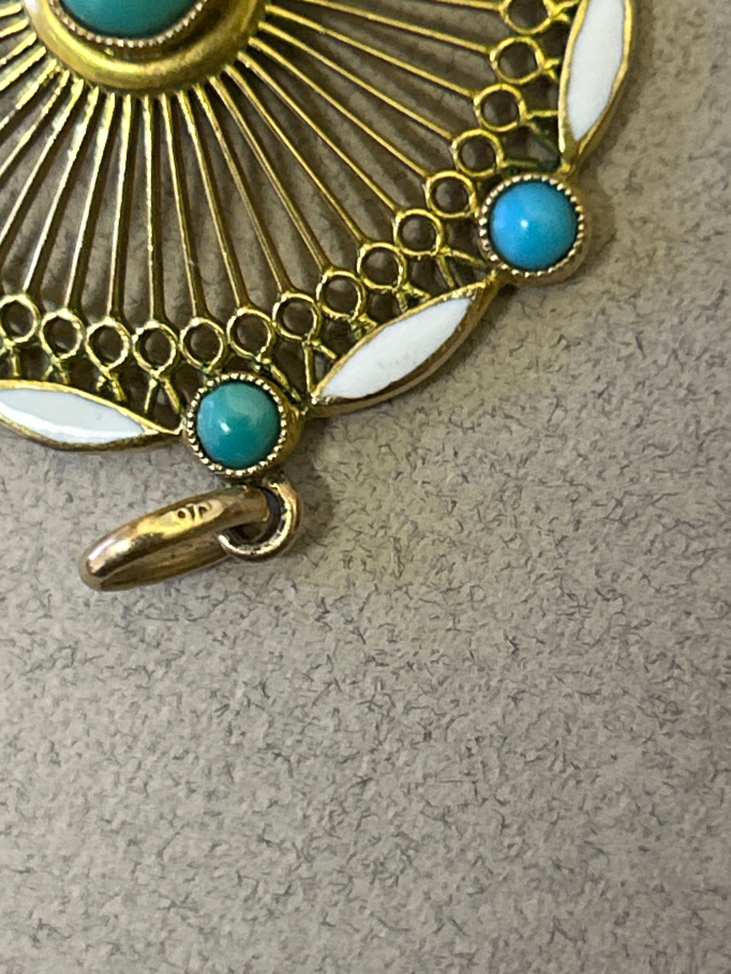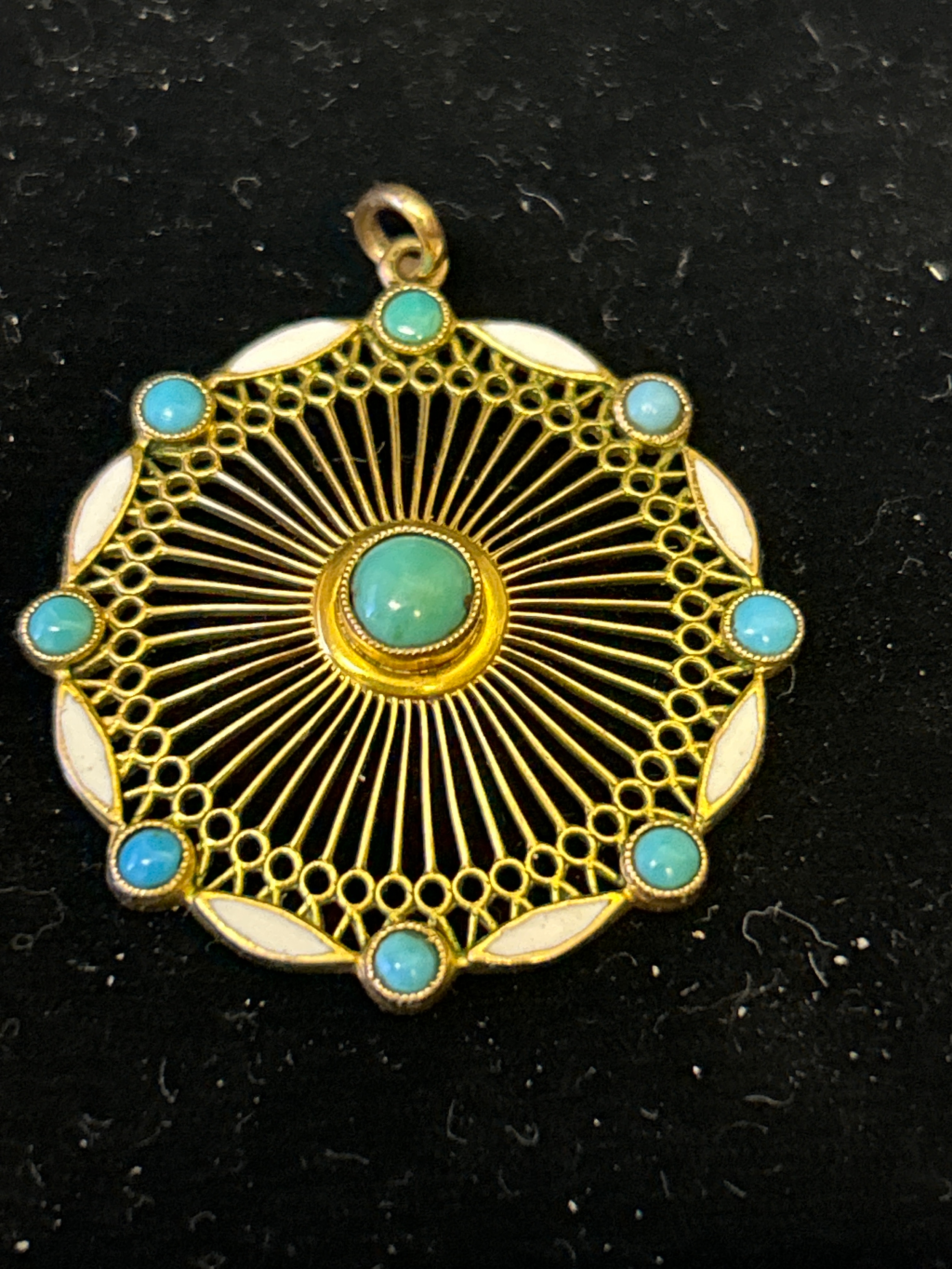A very fine vintage 9ct gold pendant in rose & yellow gold with turquoise cabochons and white enamel detail. Marked 9C to the bail. 3cm dia 3.8 grams