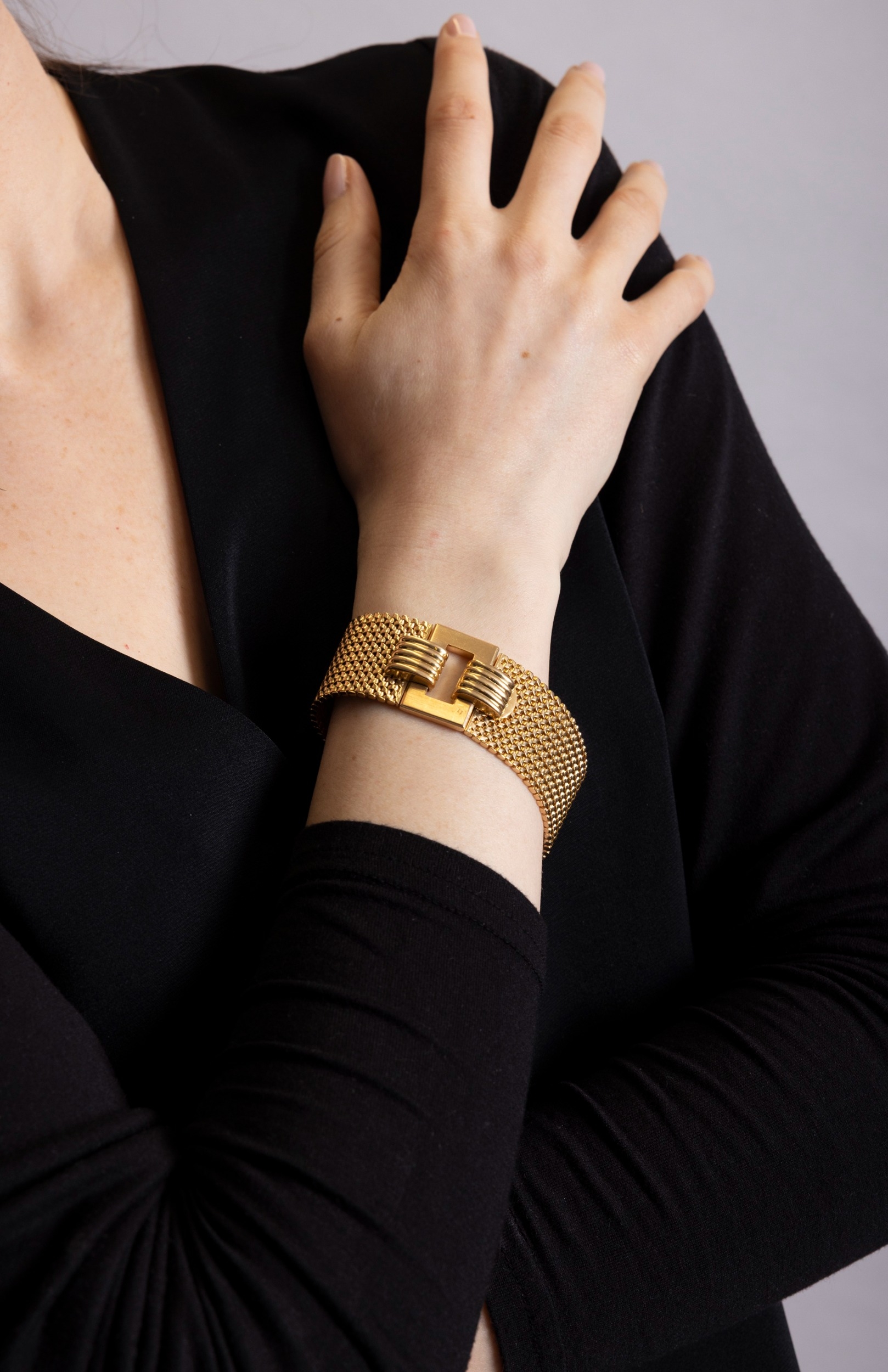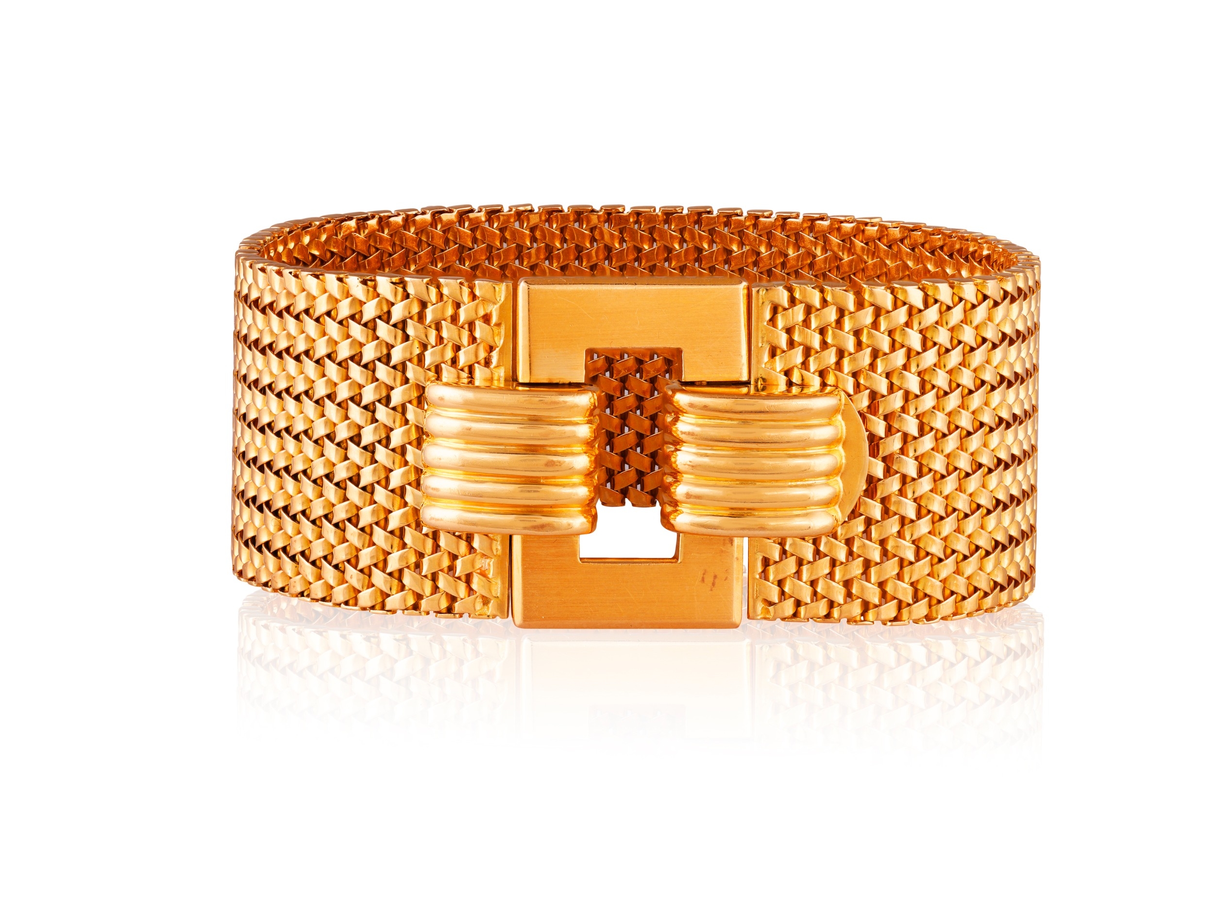BULGARI: A RETRO 18K GOLD BRACELET, CIRCA 1950 The private collection of a Roman Lady (lot 103 to 111) The wide bracelet of woven mesh-link pattern with terminals set with a rectangular buckle-style clasp, with reeded detailing to each side, in 18K gold, signed Bvlgari, Italian registry mark between '1944-1968', length 17.9cm
