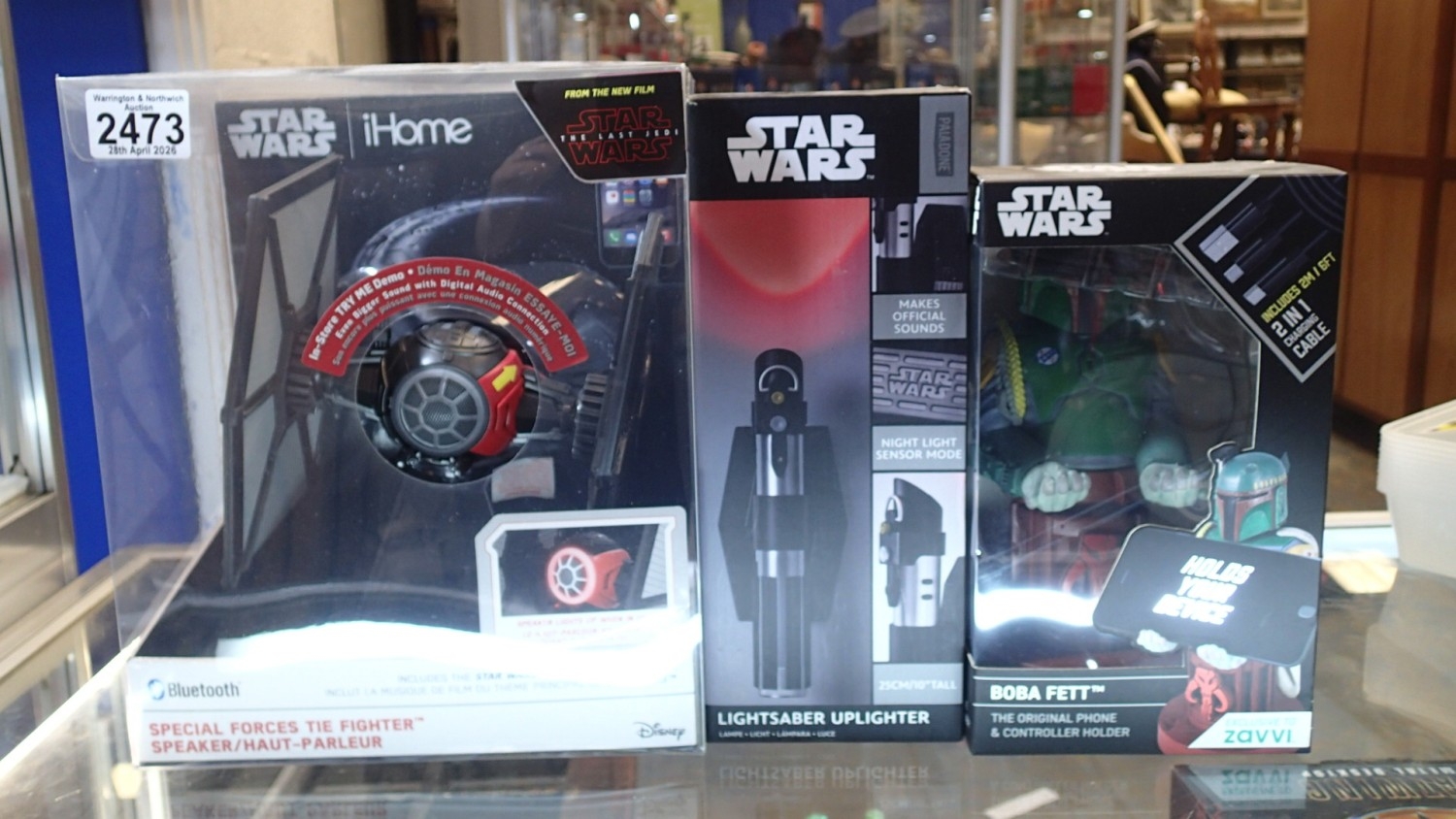 Three mixed Star wars items to include Boba Fett phone/controller holder, lightsabre uplighter and Special Forces Tie Fighter Bluetooth speaker. UK P&P Group 2 (£24+VAT for the first lot and £5+VAT for subsequent lots)