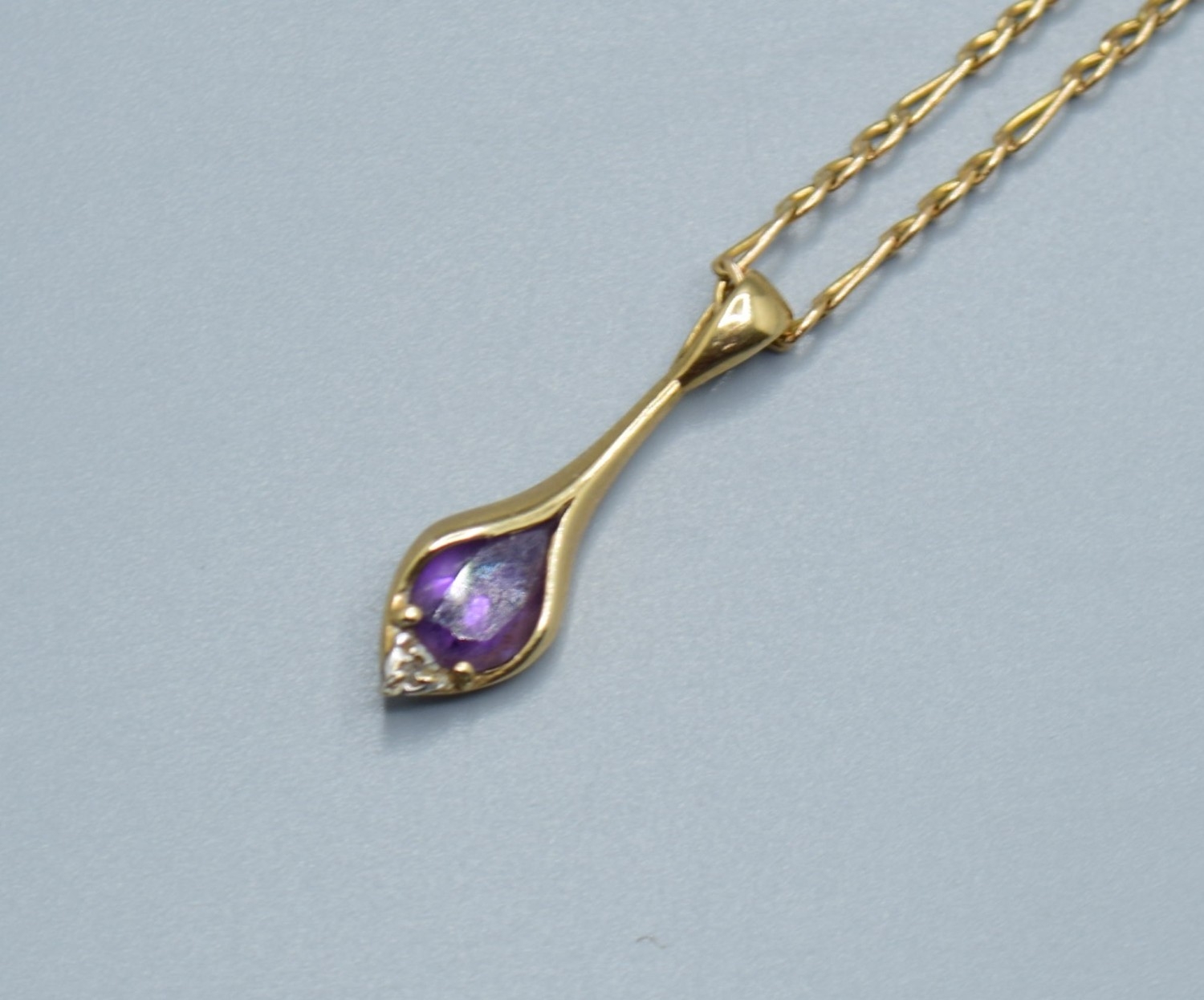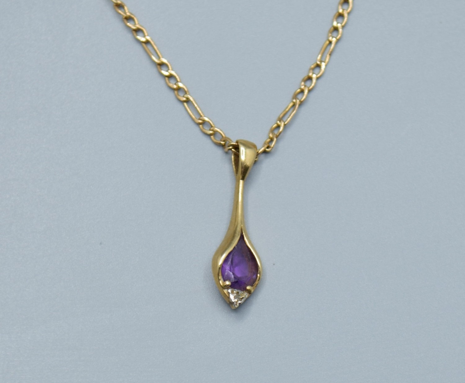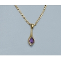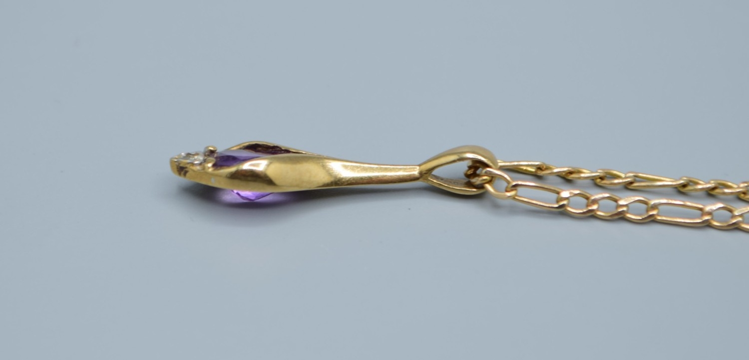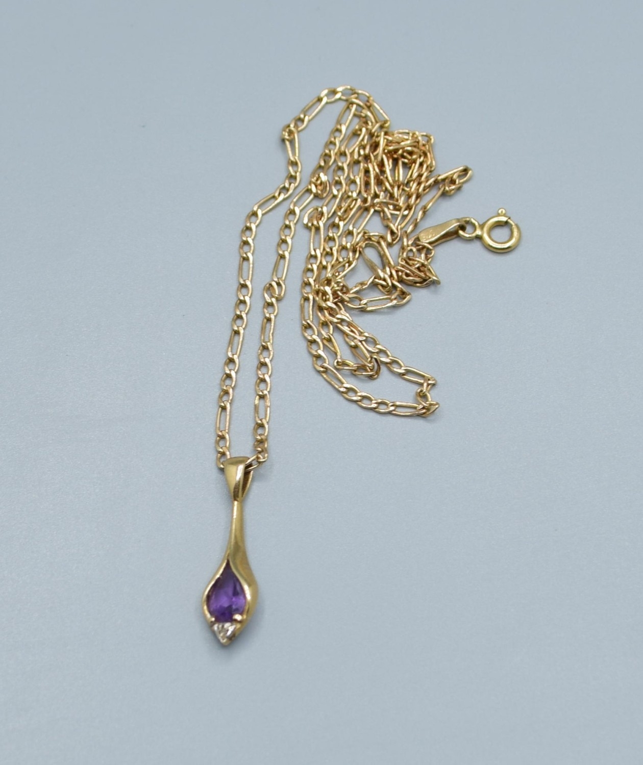 9ct gold Amethyst and accent Diamond tear drop pendant, pendant being 2.4cm drop on a 9ct gold figaro neck chain 56cm long, 2.4grams