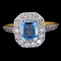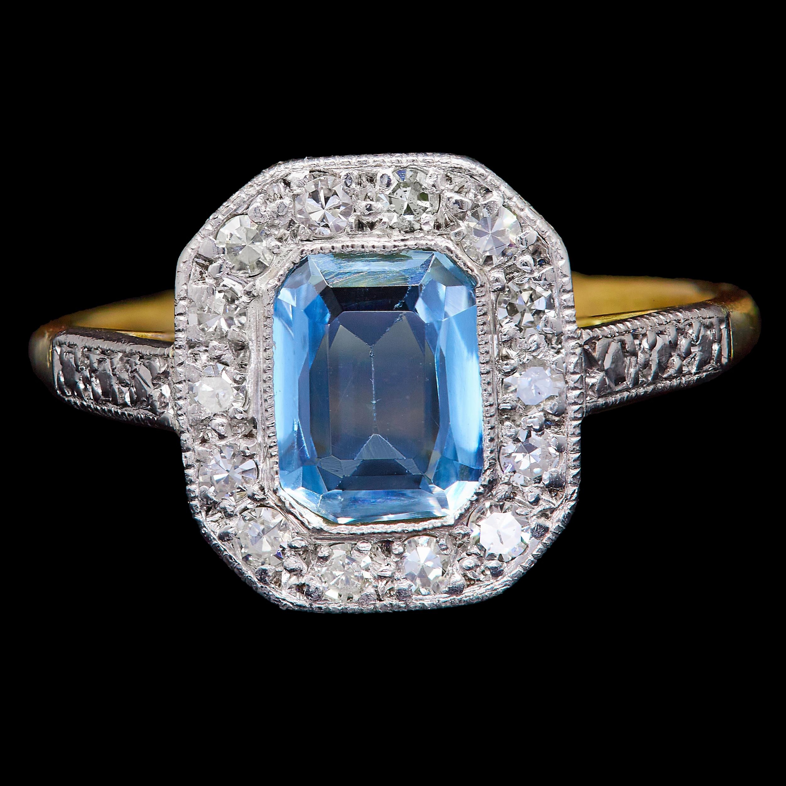 AQUAMARINE AND DIAMOND DRESS RING, in 18 ct. gold and platinum. Set with a central aquamarine of approx. 0.81 ct. Flanked with diamonds and diamonds on the shoulders, totalling approx. 0.40 ct. Size N. 3.5 grams.