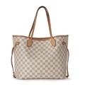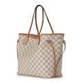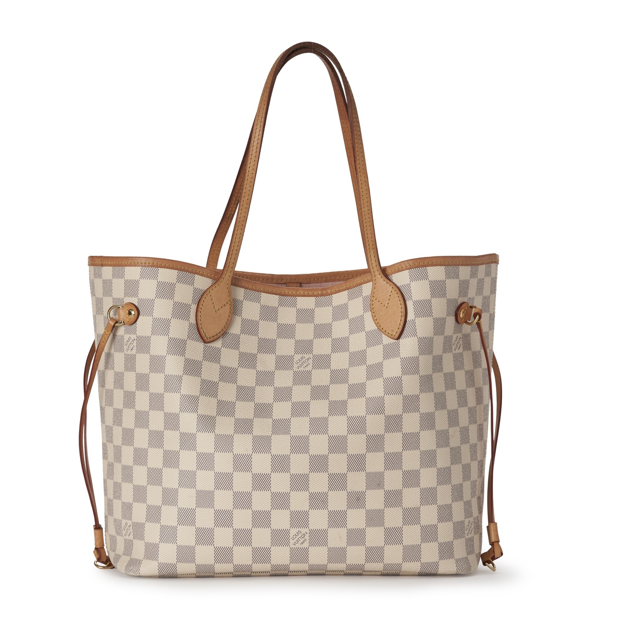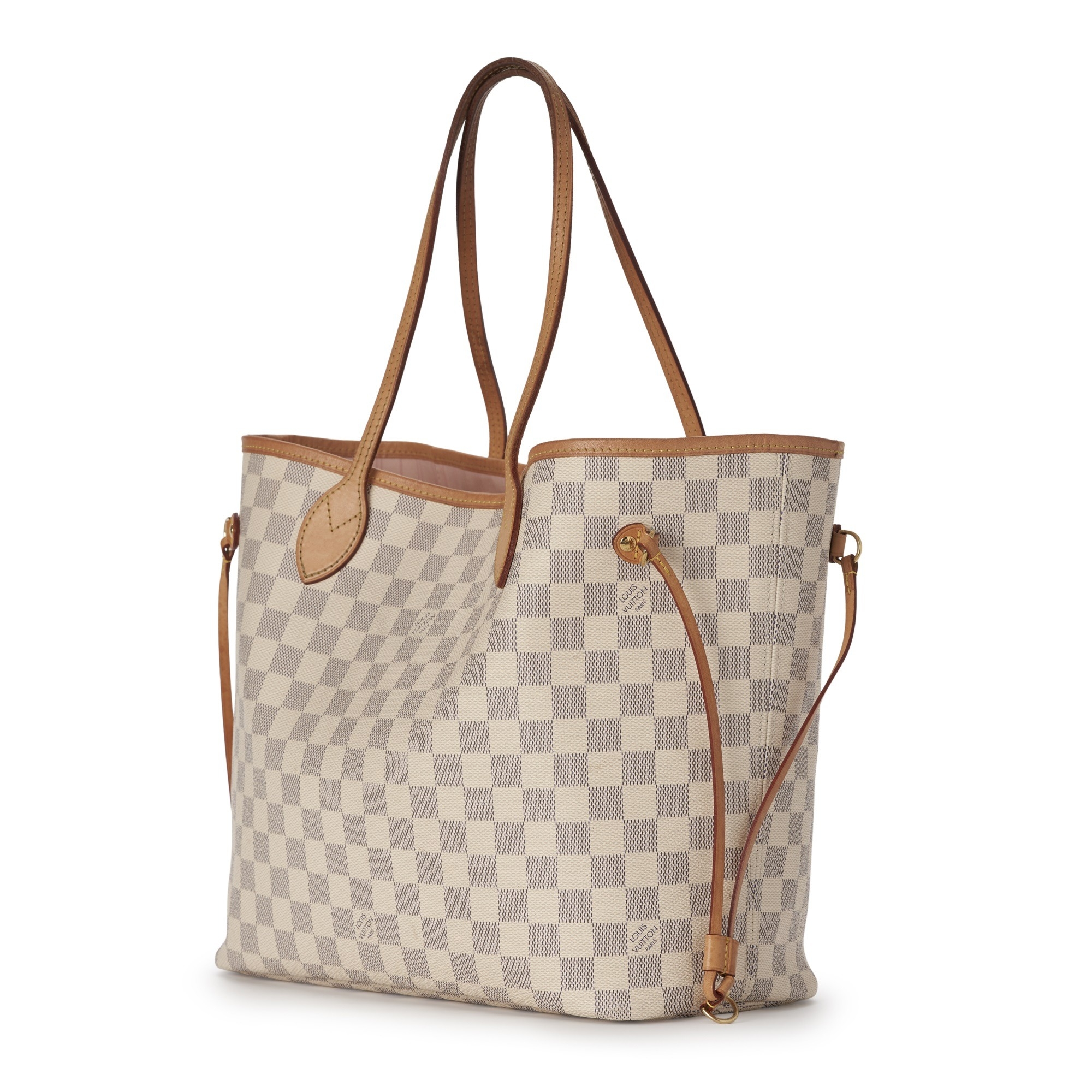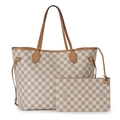 Louis Vuitton, a damier azur Neverfull MM handbag w/pouch, designed vachetta tan leather trim, dual slim leather handles, adjustable leather side laces, lobster-claw clip fastening, and a pink canvas lined interior, together with a matching pouch, measuring 16 by 28 by 32cm