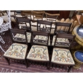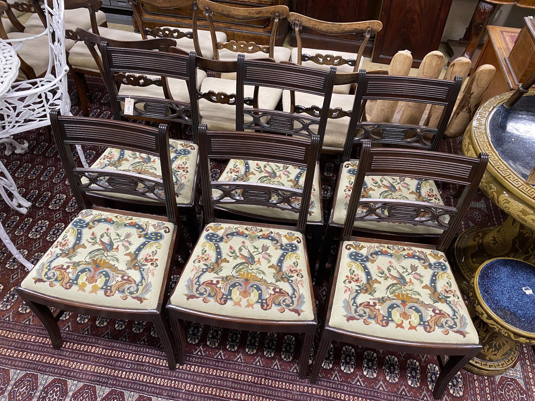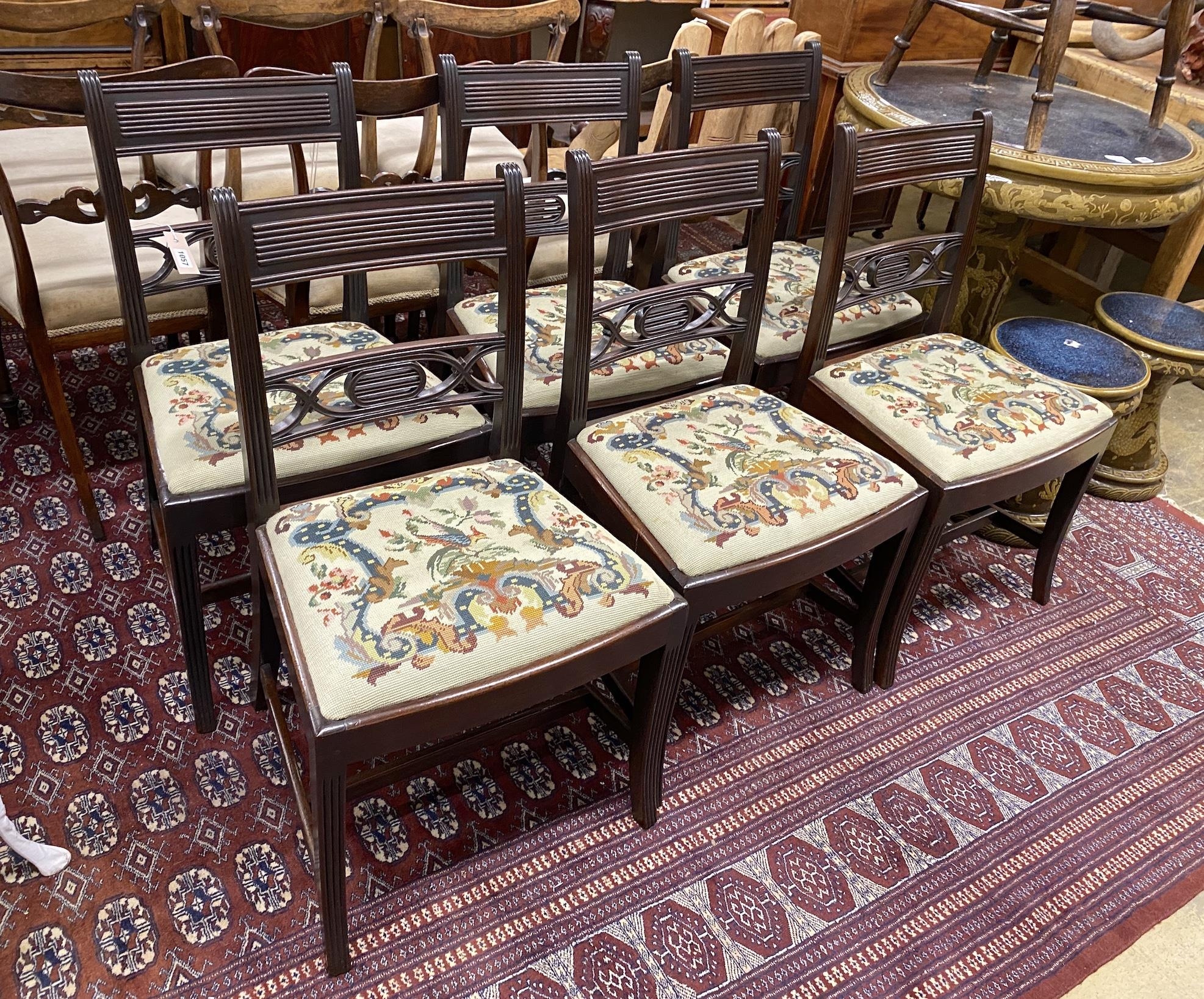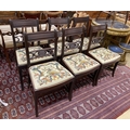A set of six George IV mahogany dining chairs with tapestry drop in seats, height 85cm
