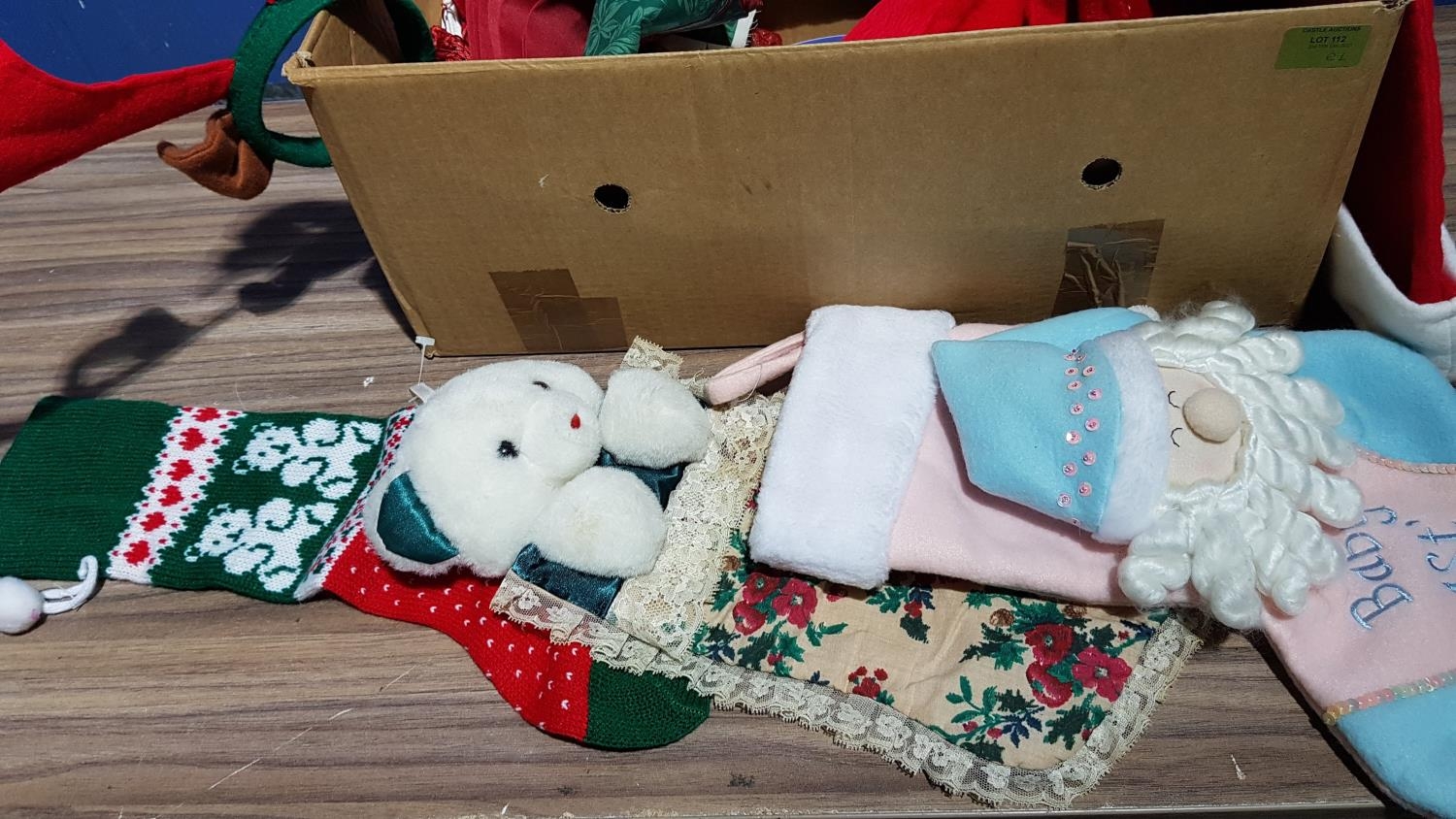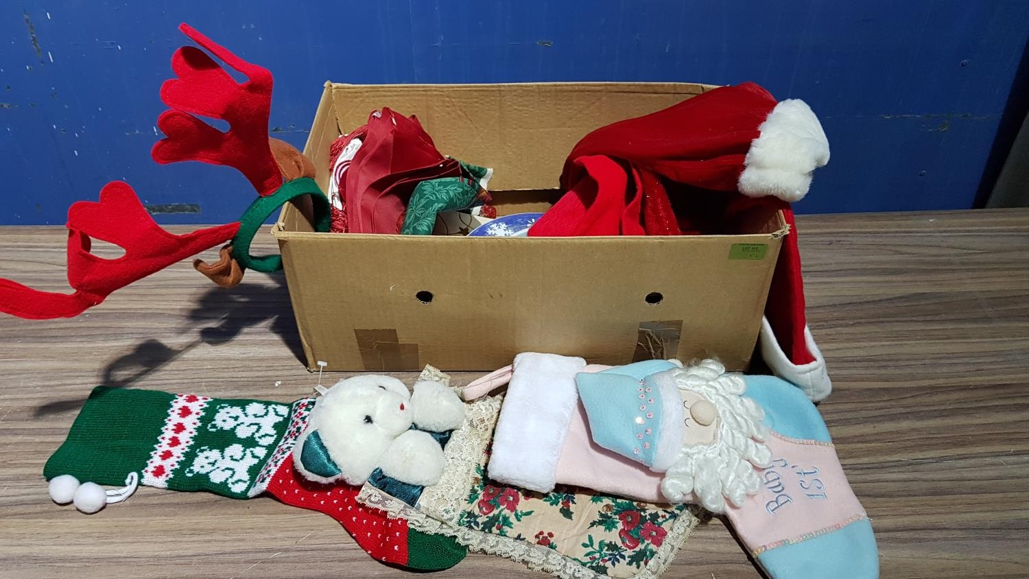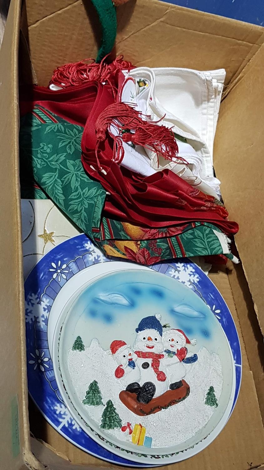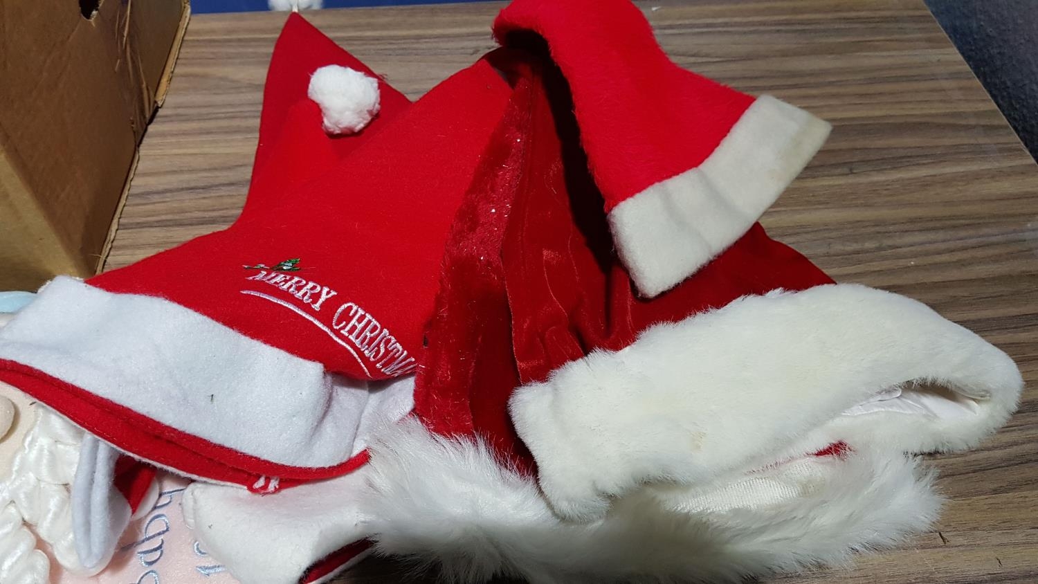Christmas Decorations; 4 x Christmas Plates, 4 x Christmas Stockings, 6 x Santa Hats, Assorted Christmas Linen