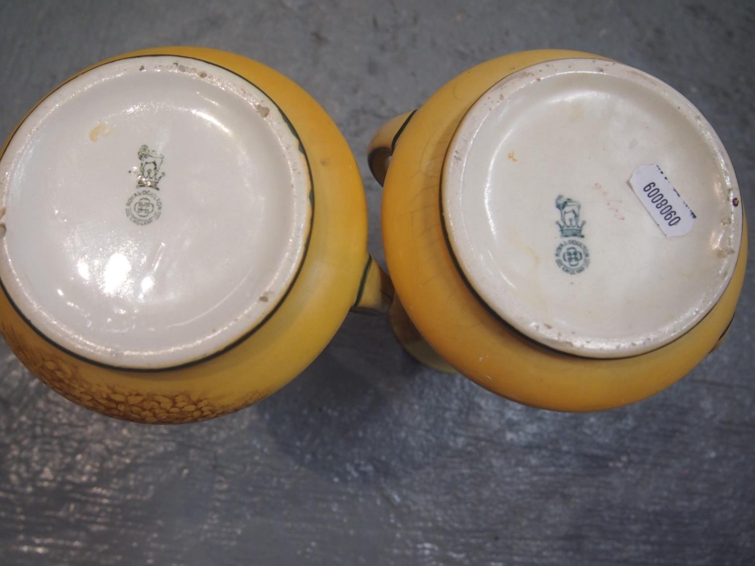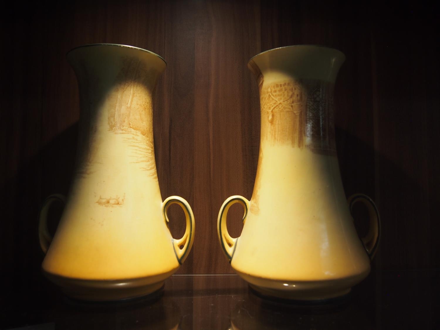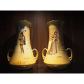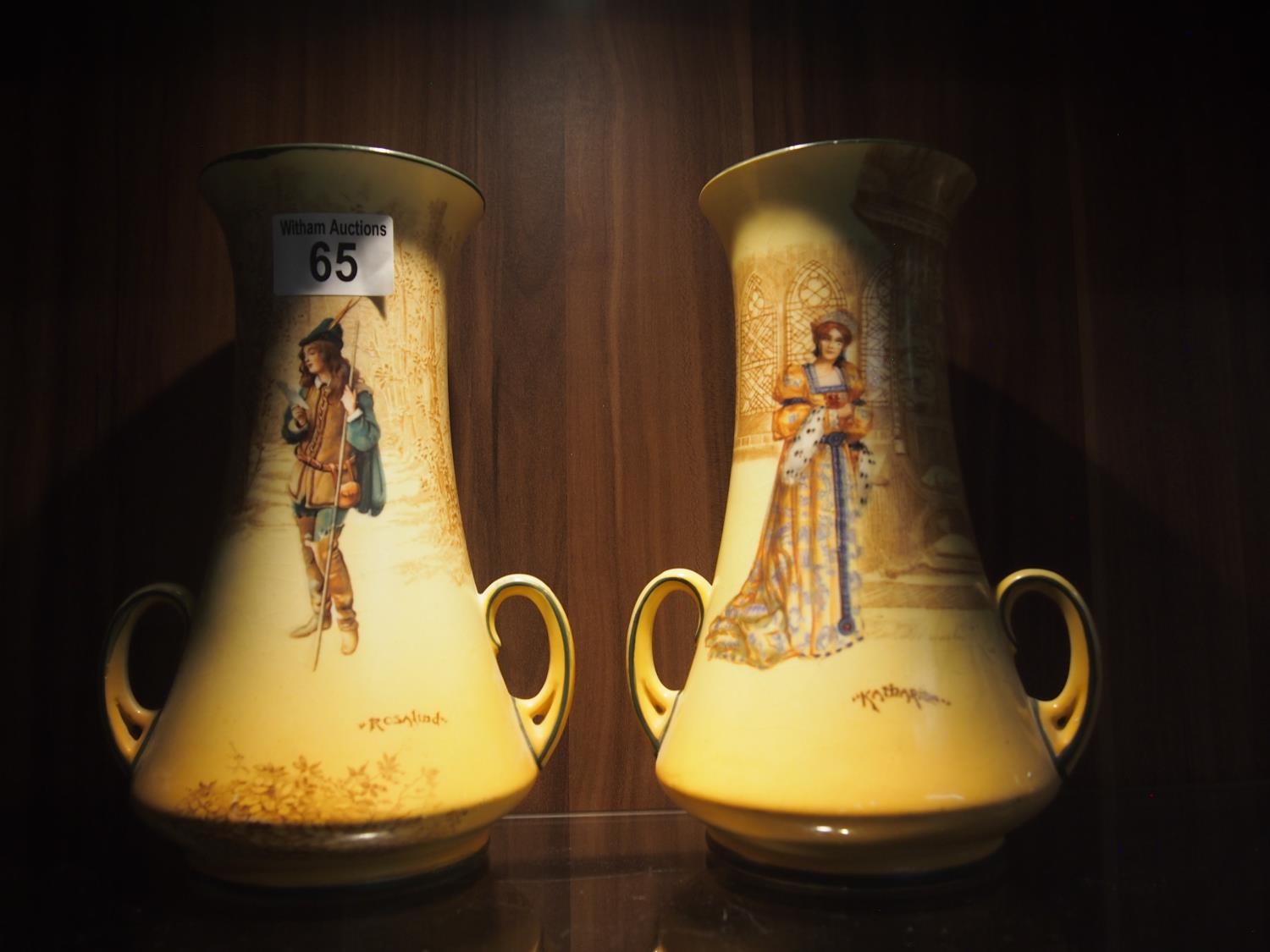 Two antique Royal Doulton Shakespearean series ceramic twin handled tapered flare vases, 'Rosalind' 7382 impressed to base and 'Katharine' stamped ??82
