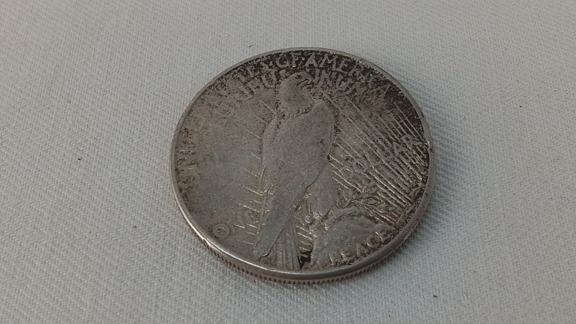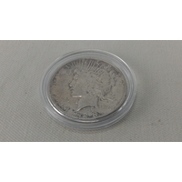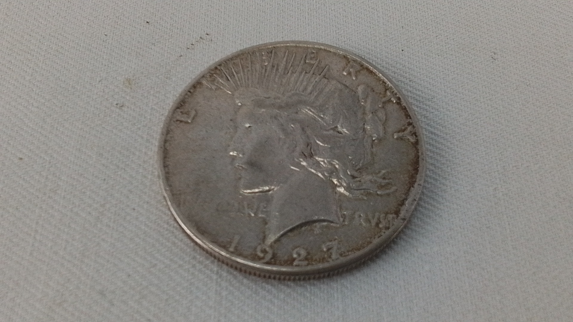 One United States Peace silver dollar coin, dated 1927, with Liberty head obverse and eagle reverse with radiating sunburst and legend "UNITED STATES OF AMERICA".