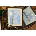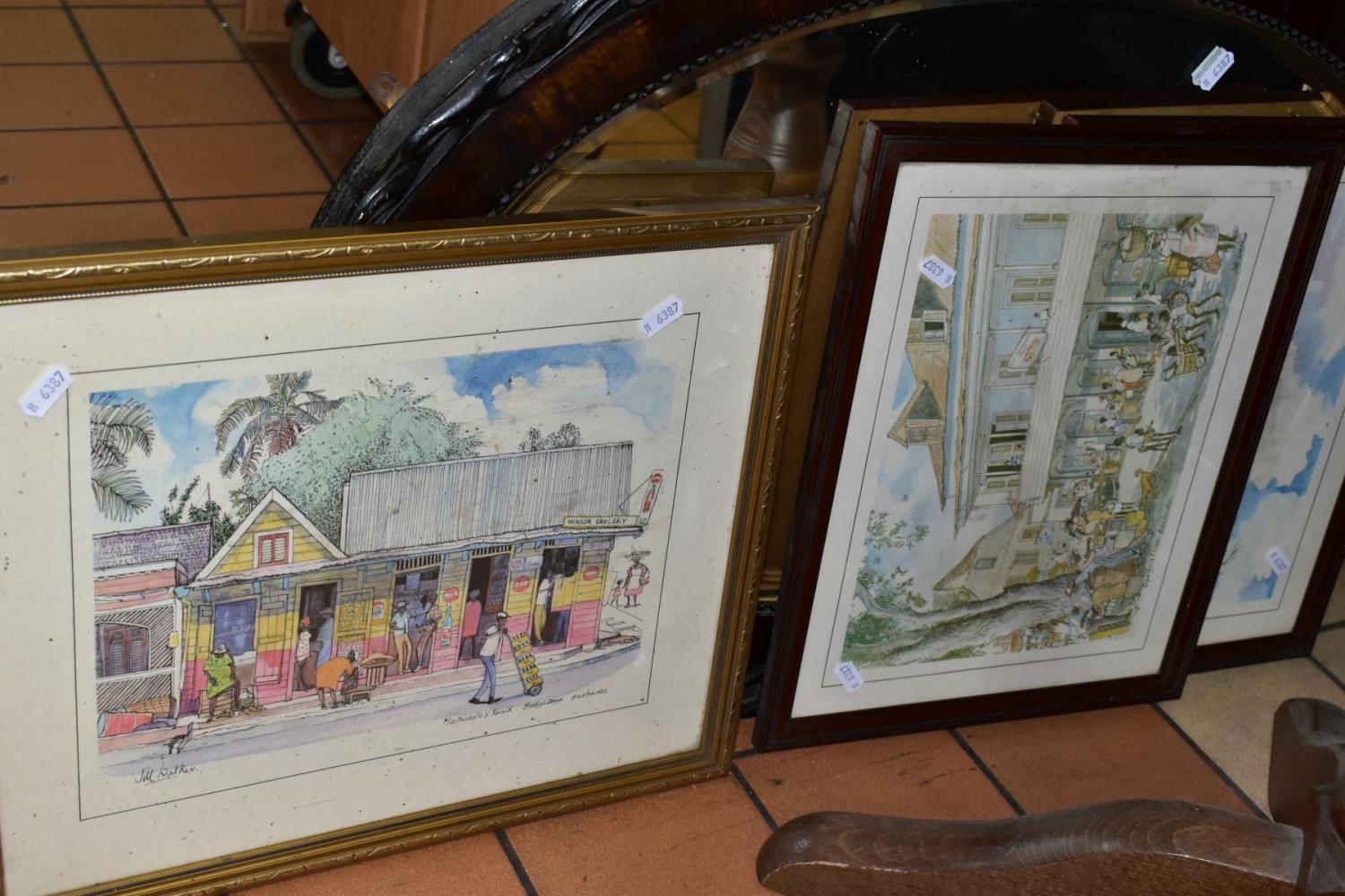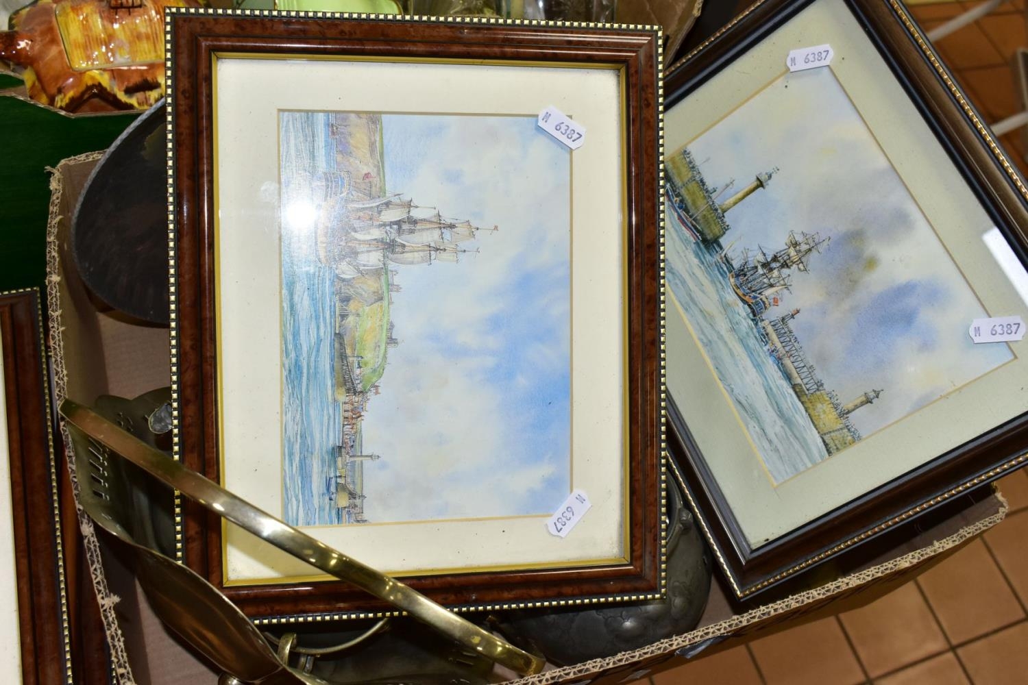 TWO BOXES AND LOOSE SUNDRY ITEMS, ETC, to include a pair of Staffordshire dogs, Royal Winton and Carlton Ware dish and bowl, three ceramic platters, Japanese Satsuma teapot in the form of an Elephant, pewter wares, crucifix, candlestick, maritime and coastal prints, Victorian oval framed mirror and and modern rectangular mirror, size approximately 85cm x 61cm
