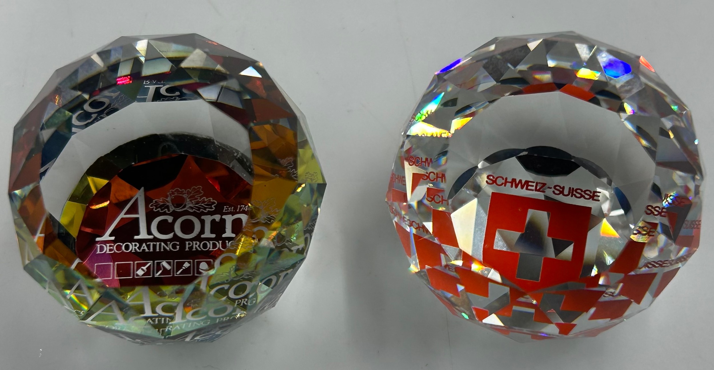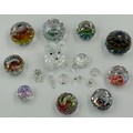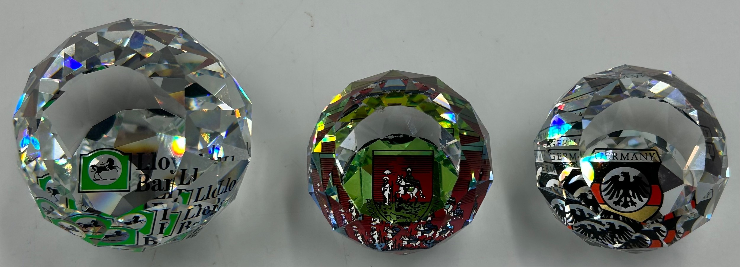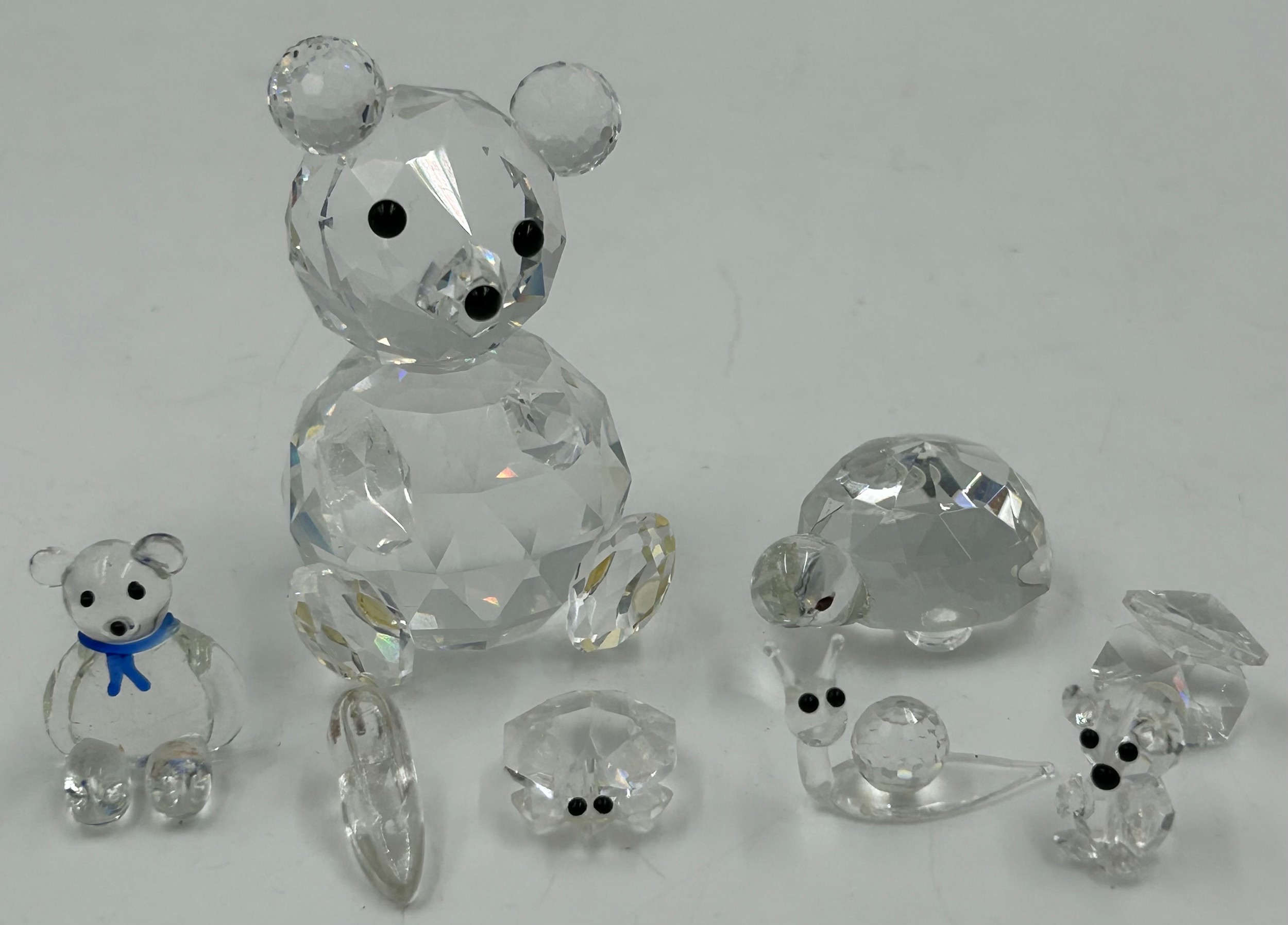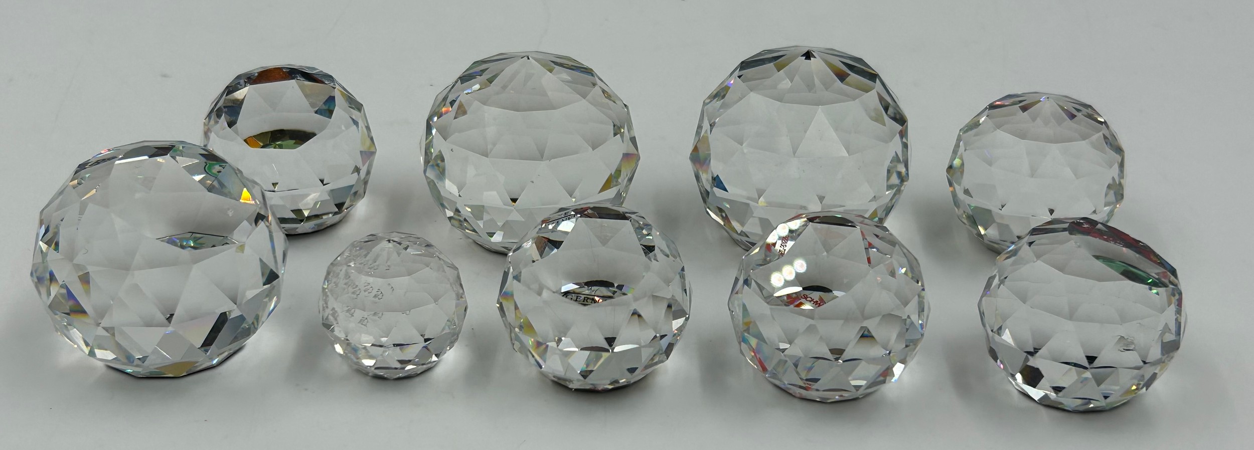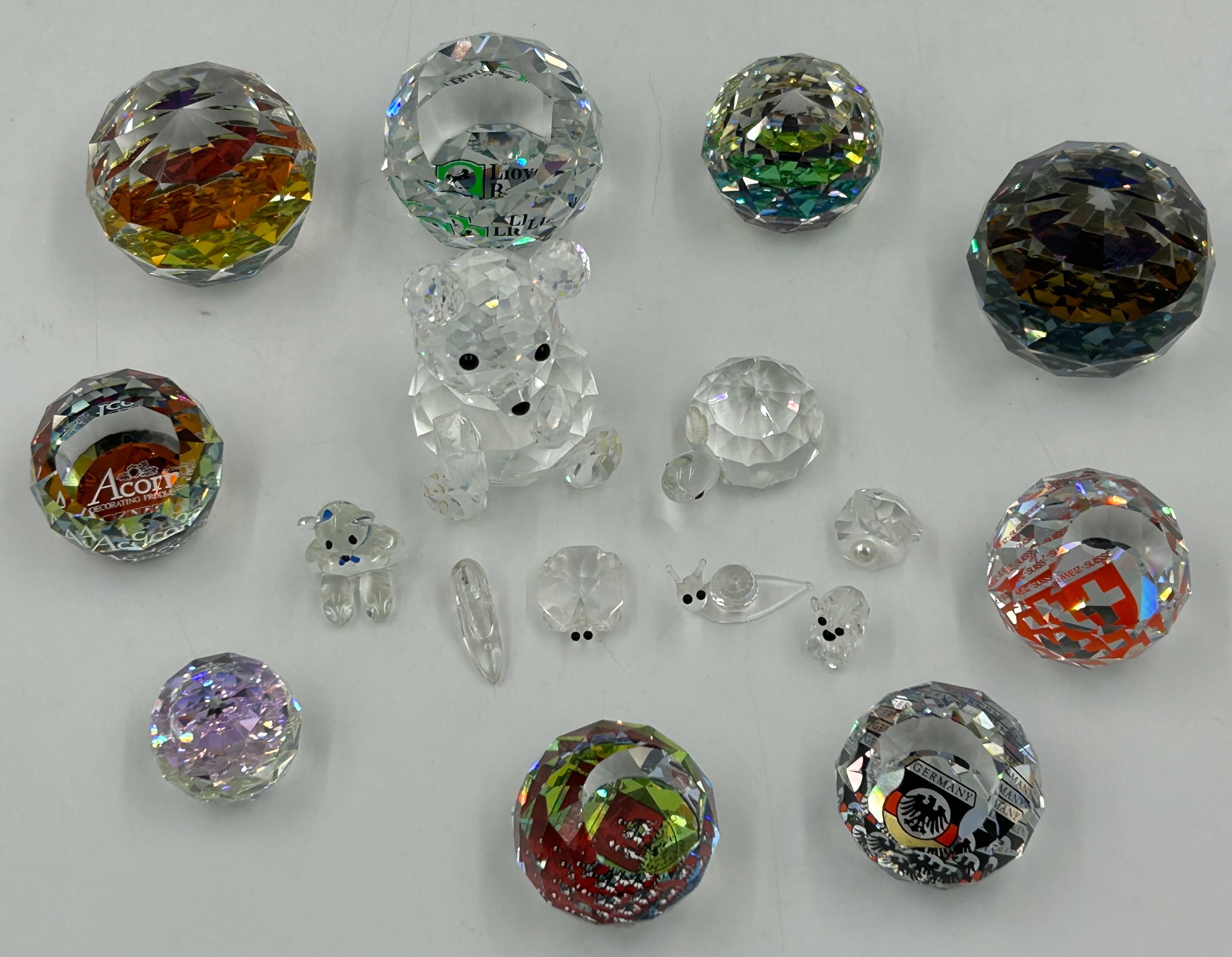 Swarovski Crystal Glass to include nine vitrail paperweights, largest 5cm h, 5 with logos Lloyds Bank, Germany etc together with other small Swarovski figures tortoise, bear etc. (17)