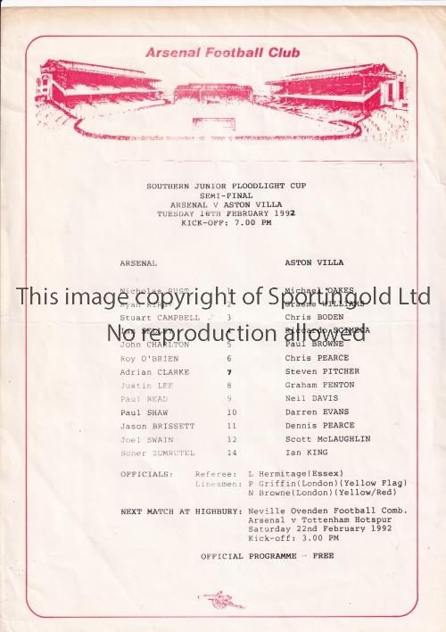 ARSENAL Single sheet programme for the home Southern Junior Floodlight Cup Semi-Final v Aston Villa 18/2/1992, horizontal crease. Generally good