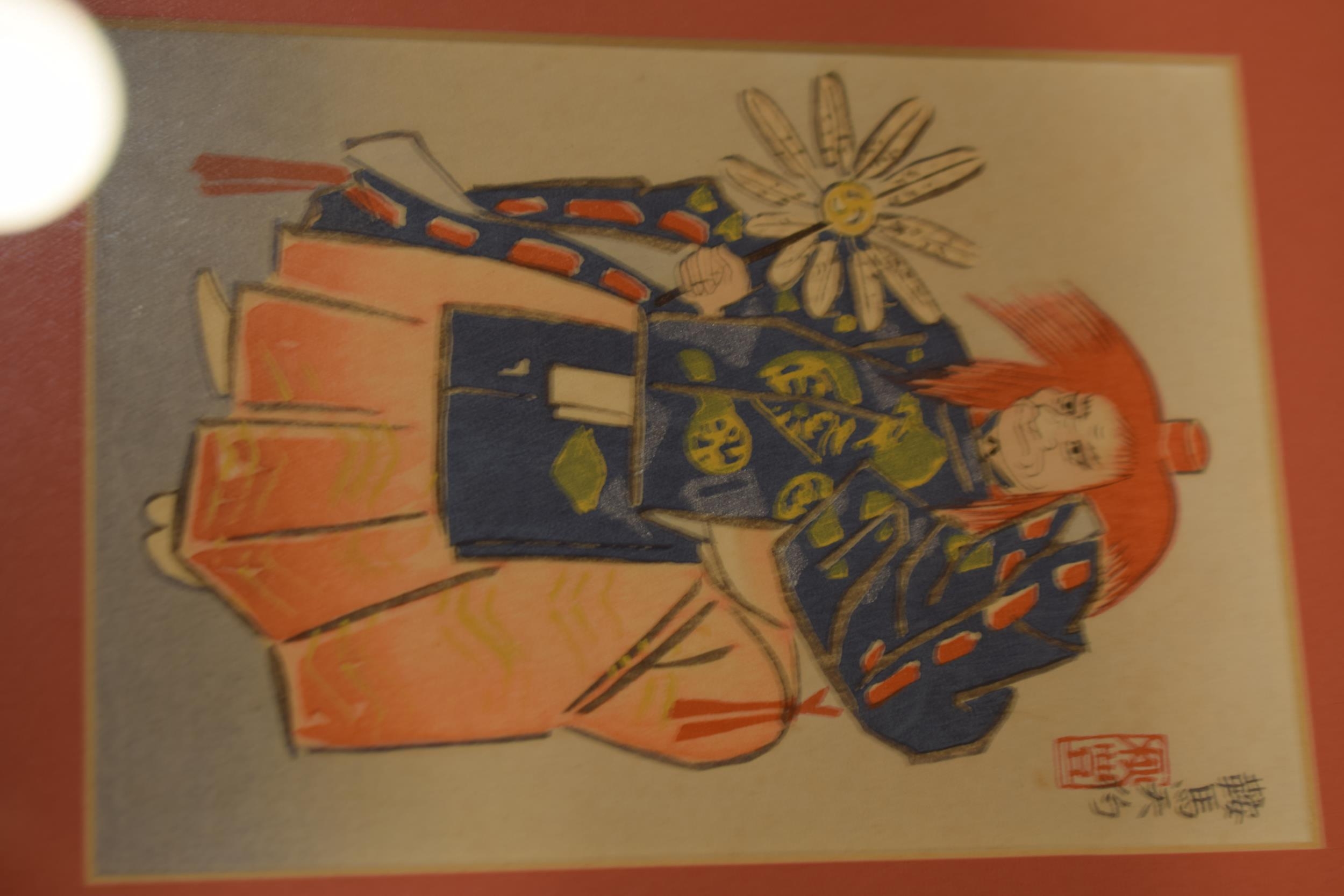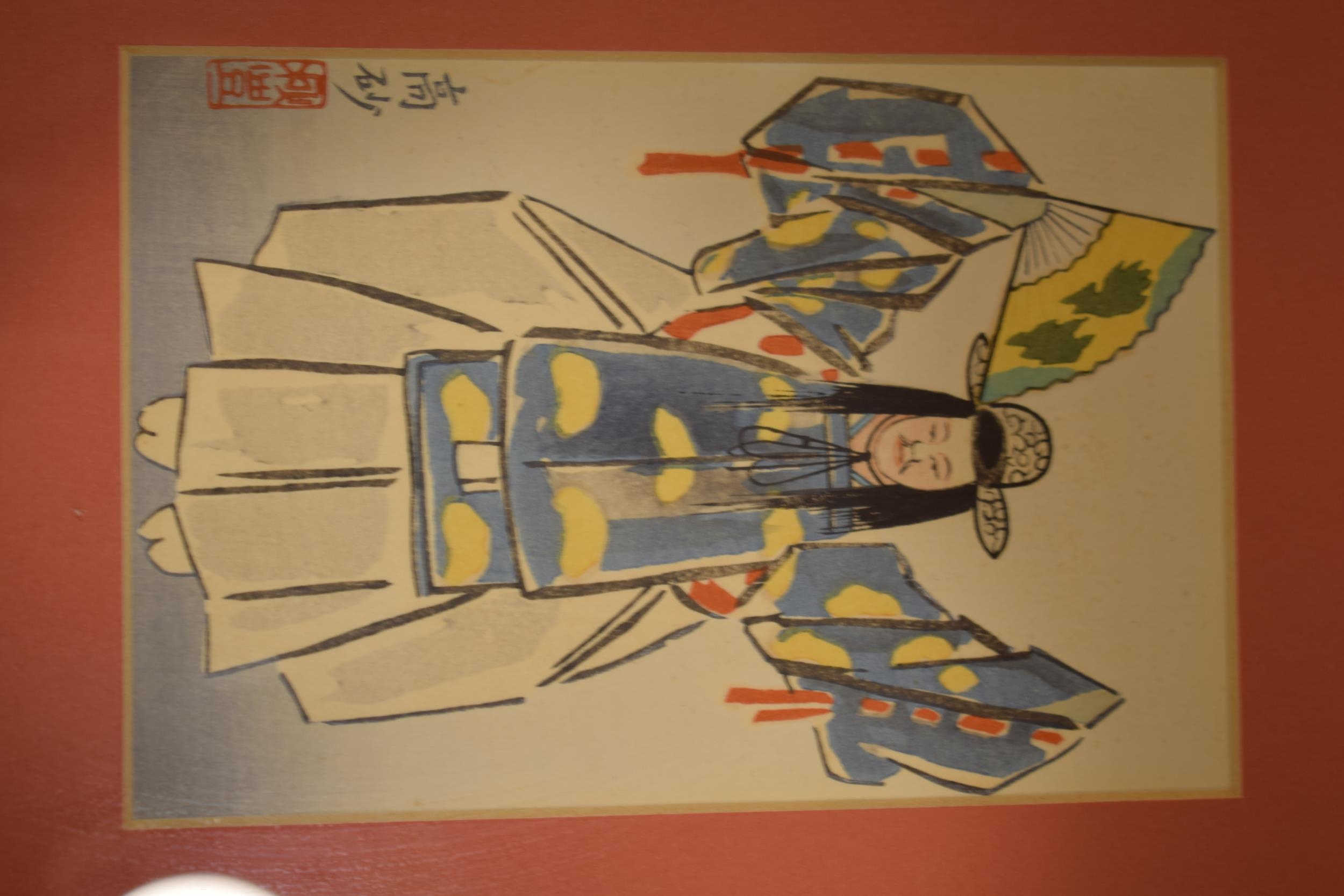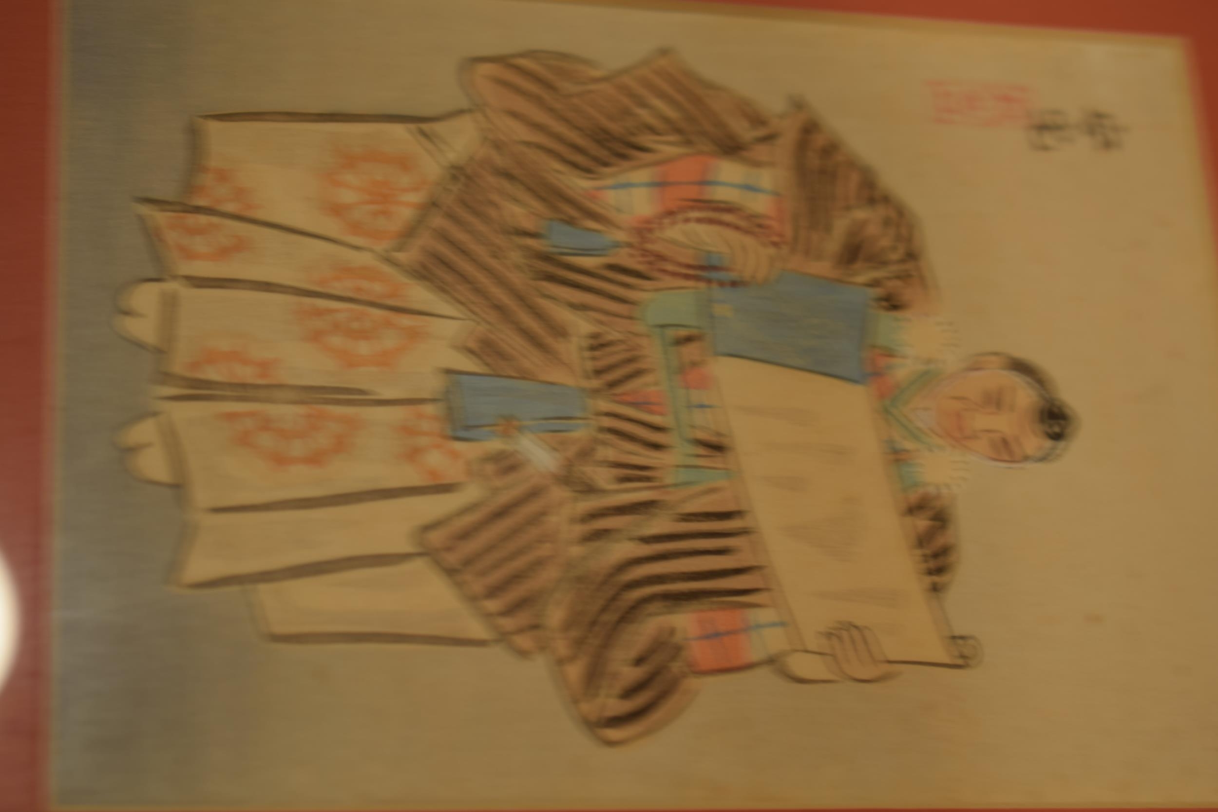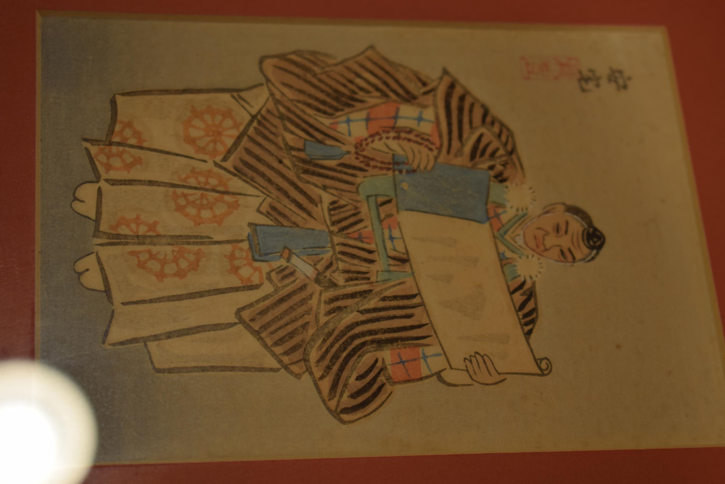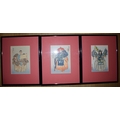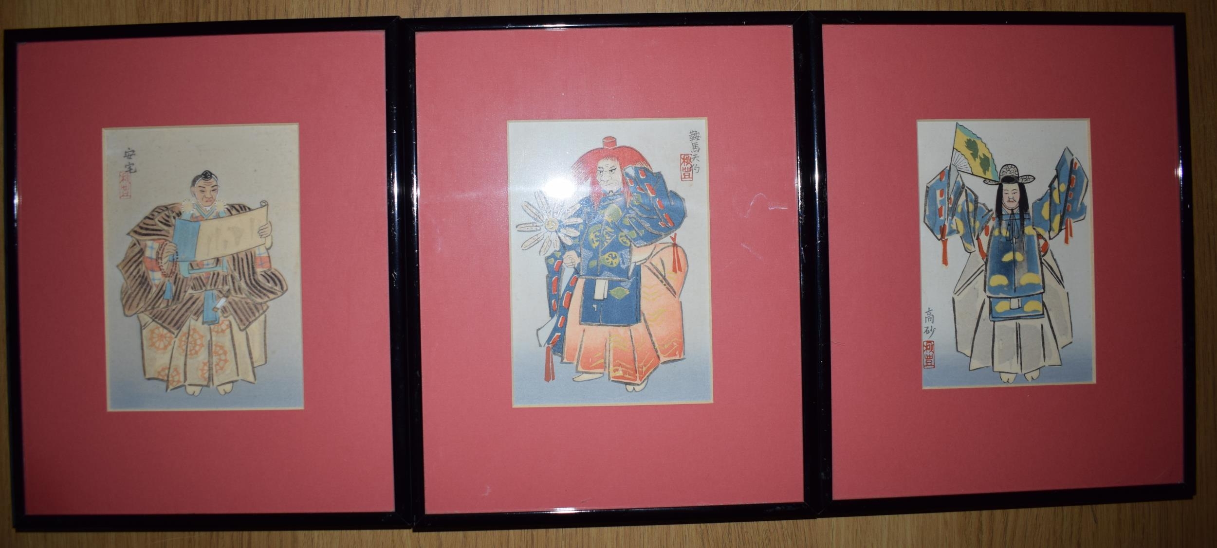 Three framed oriental watercolour art works in red mounts and black lacquer frames. 21 x 26cm (3)
