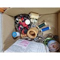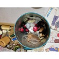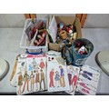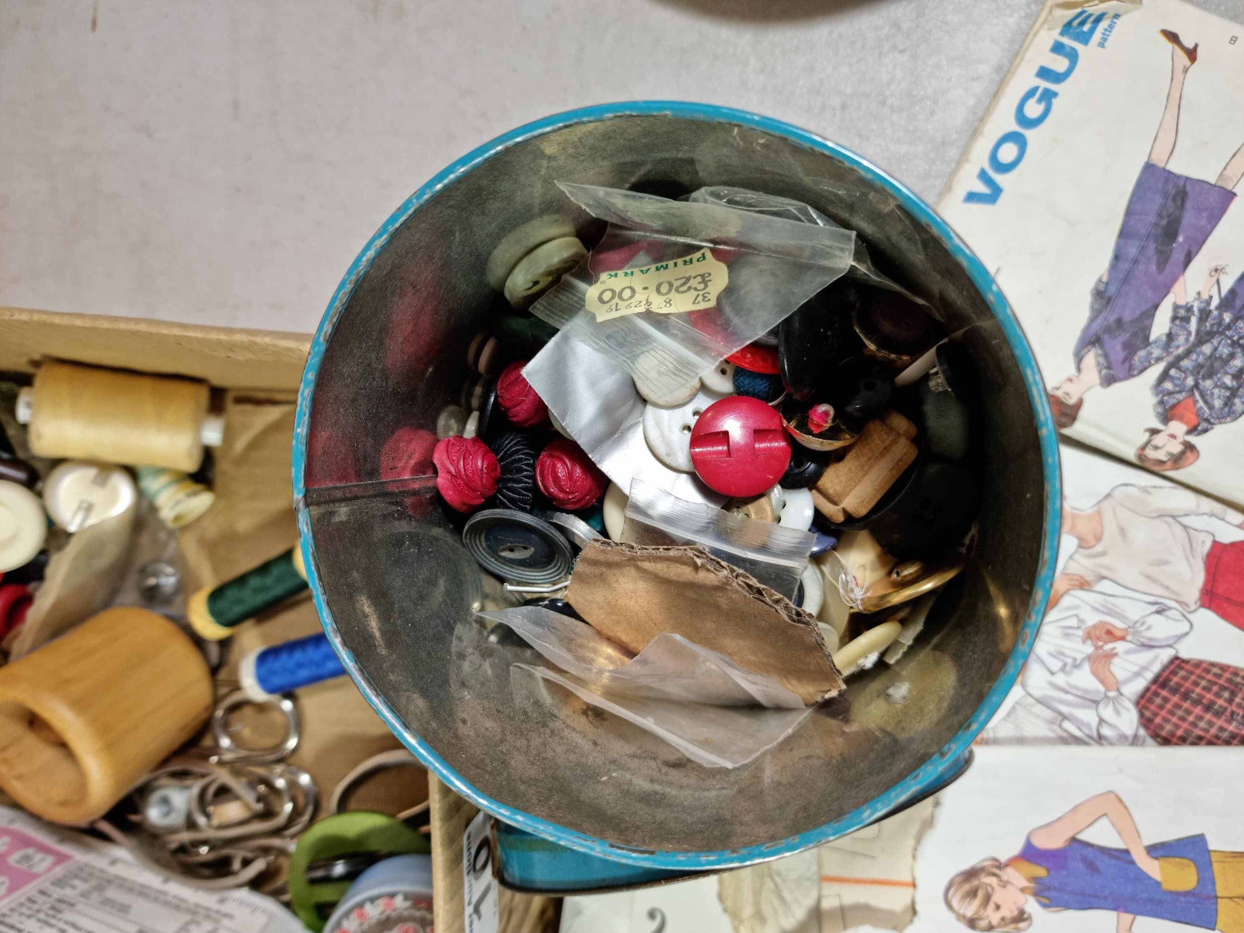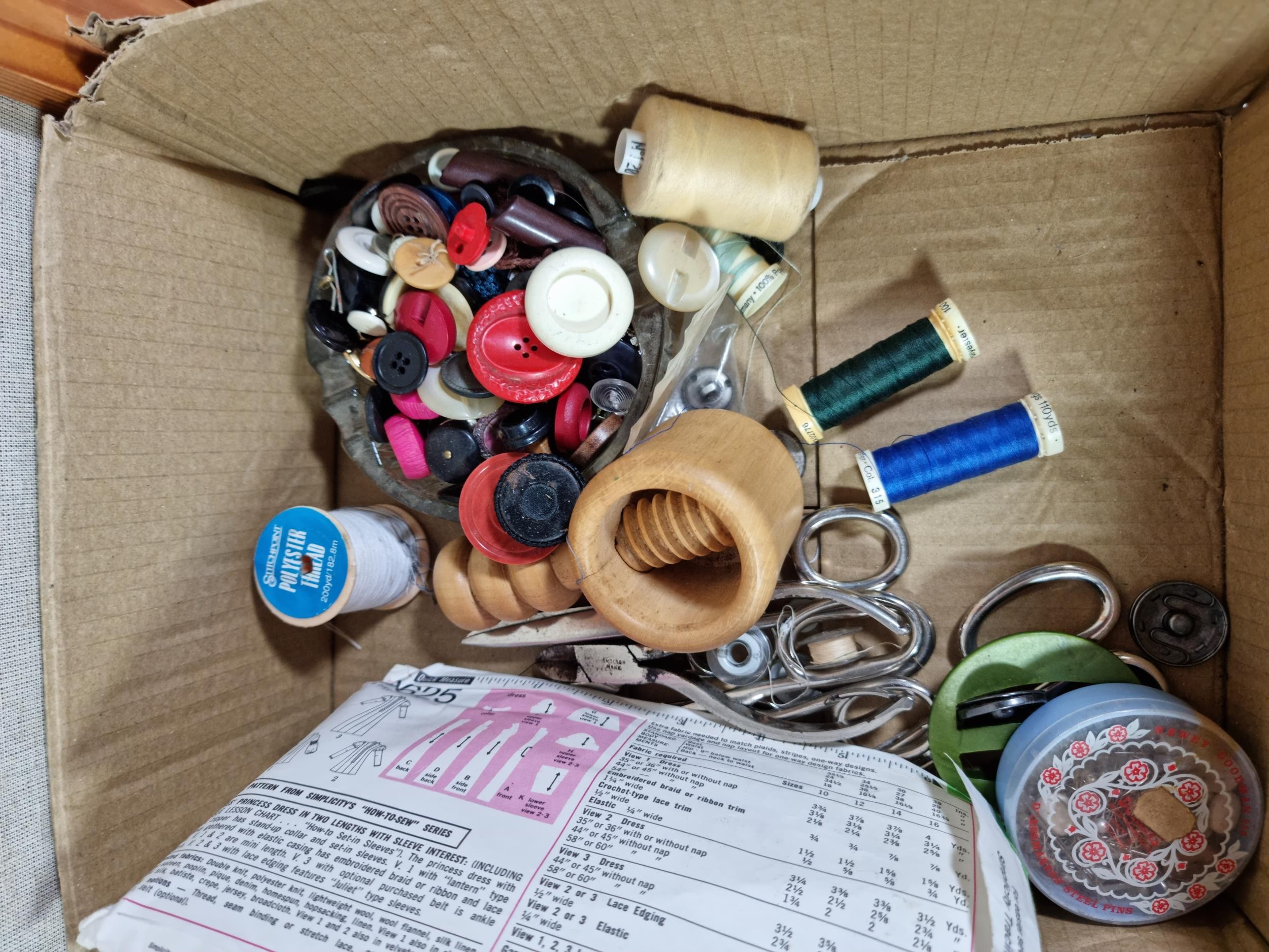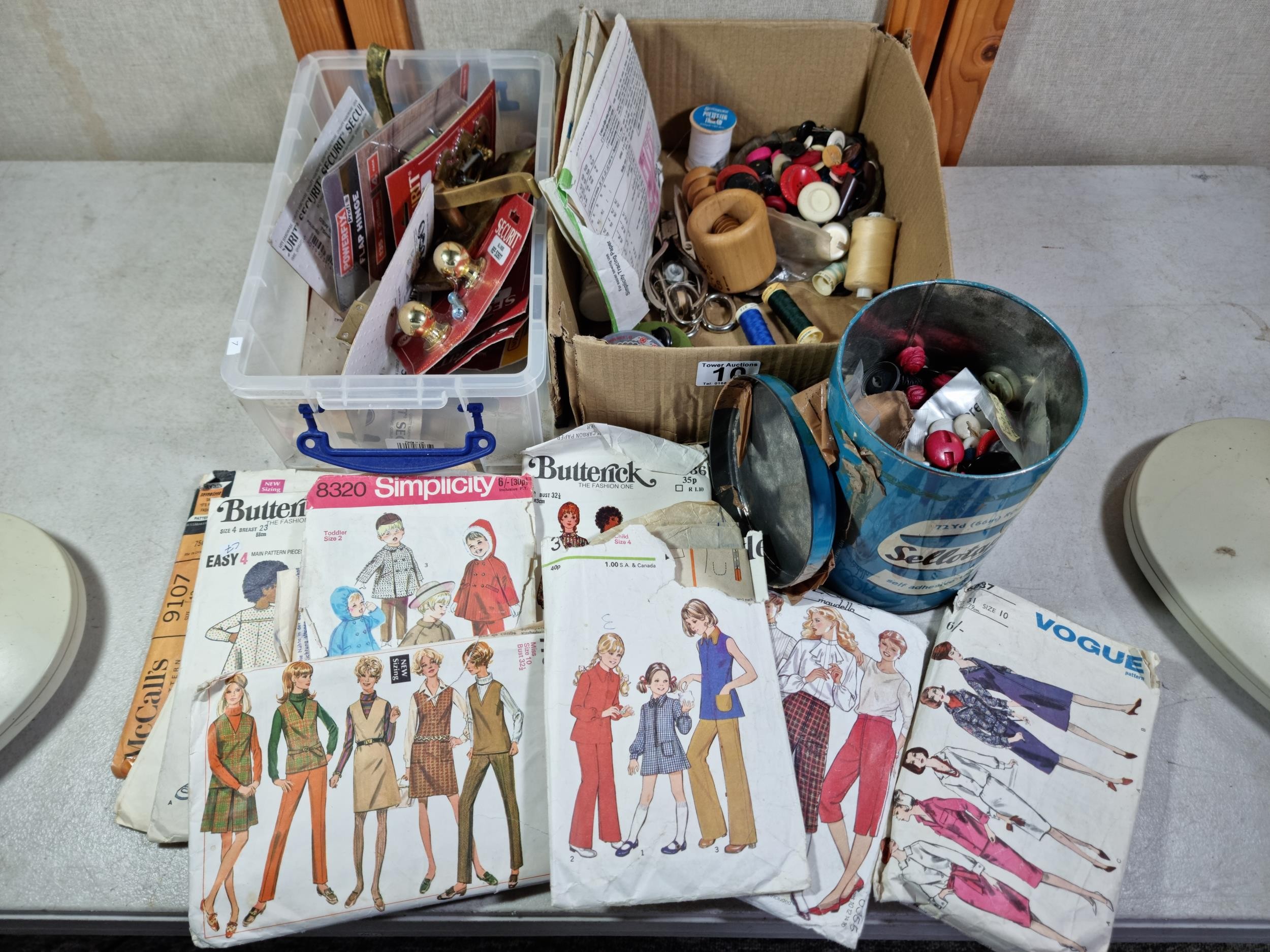 A large selection of brass door furniture and sewing accessories to include, handles and doorknobs and a large selection of buttons and vintage McCall's clothing patterns.