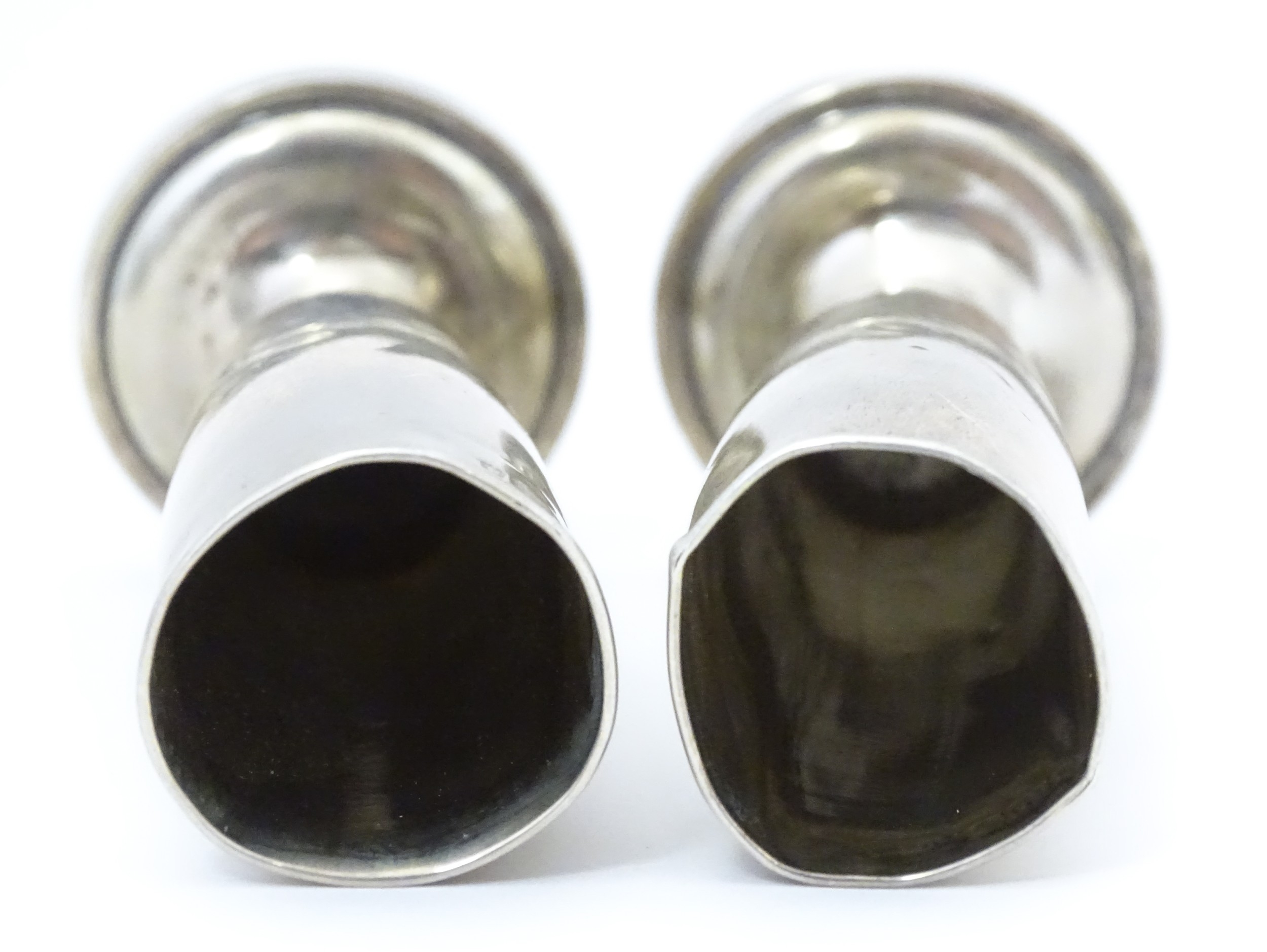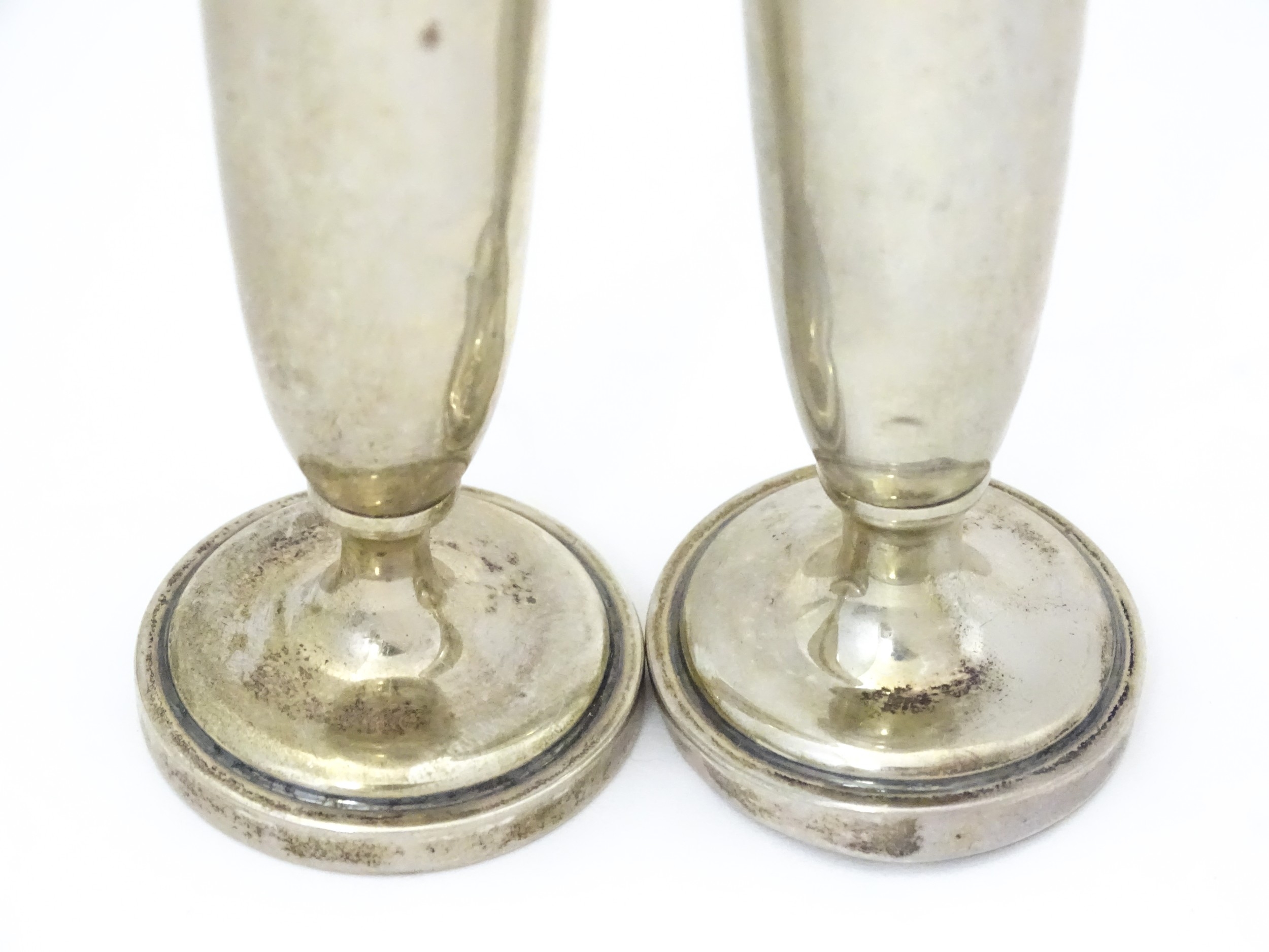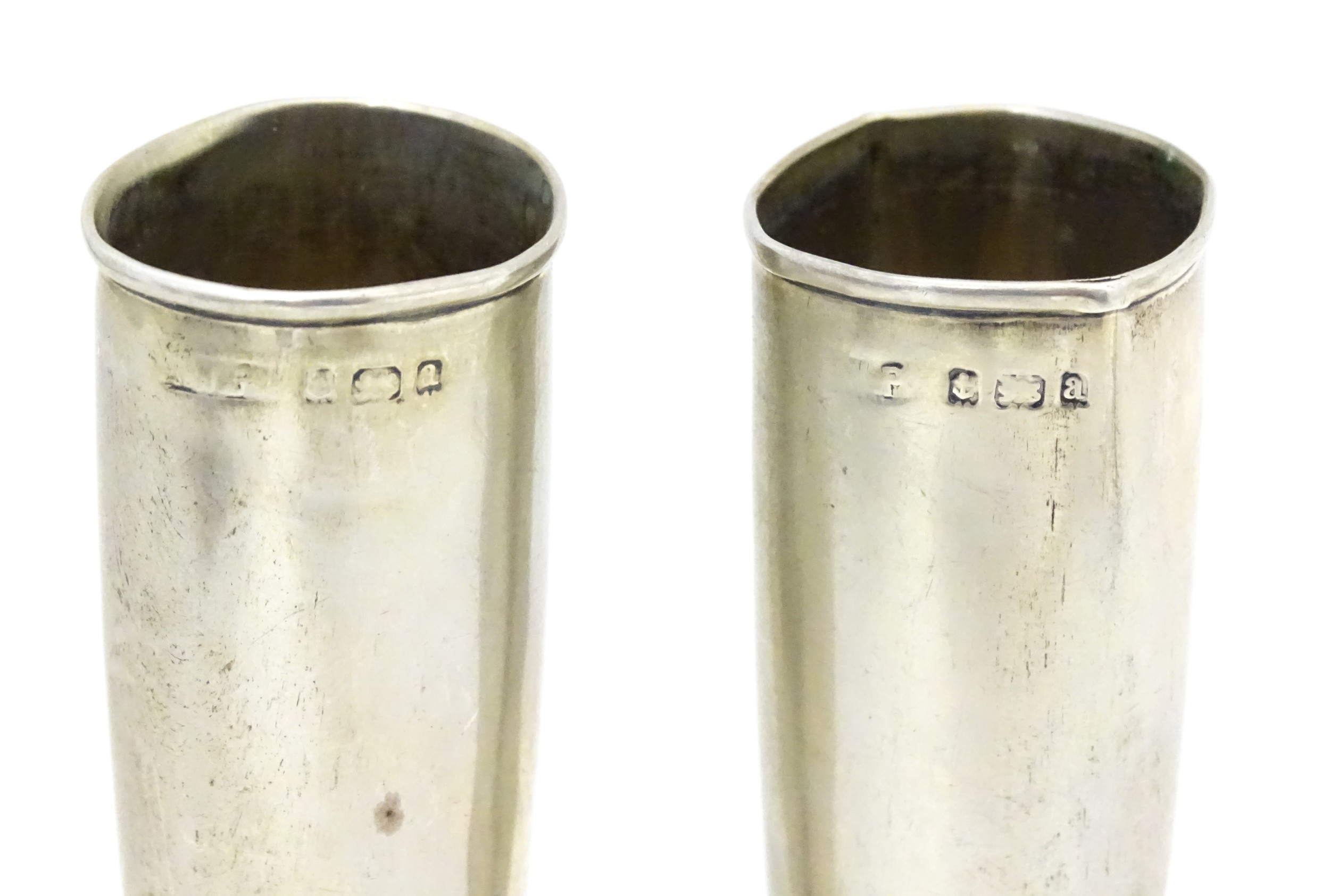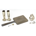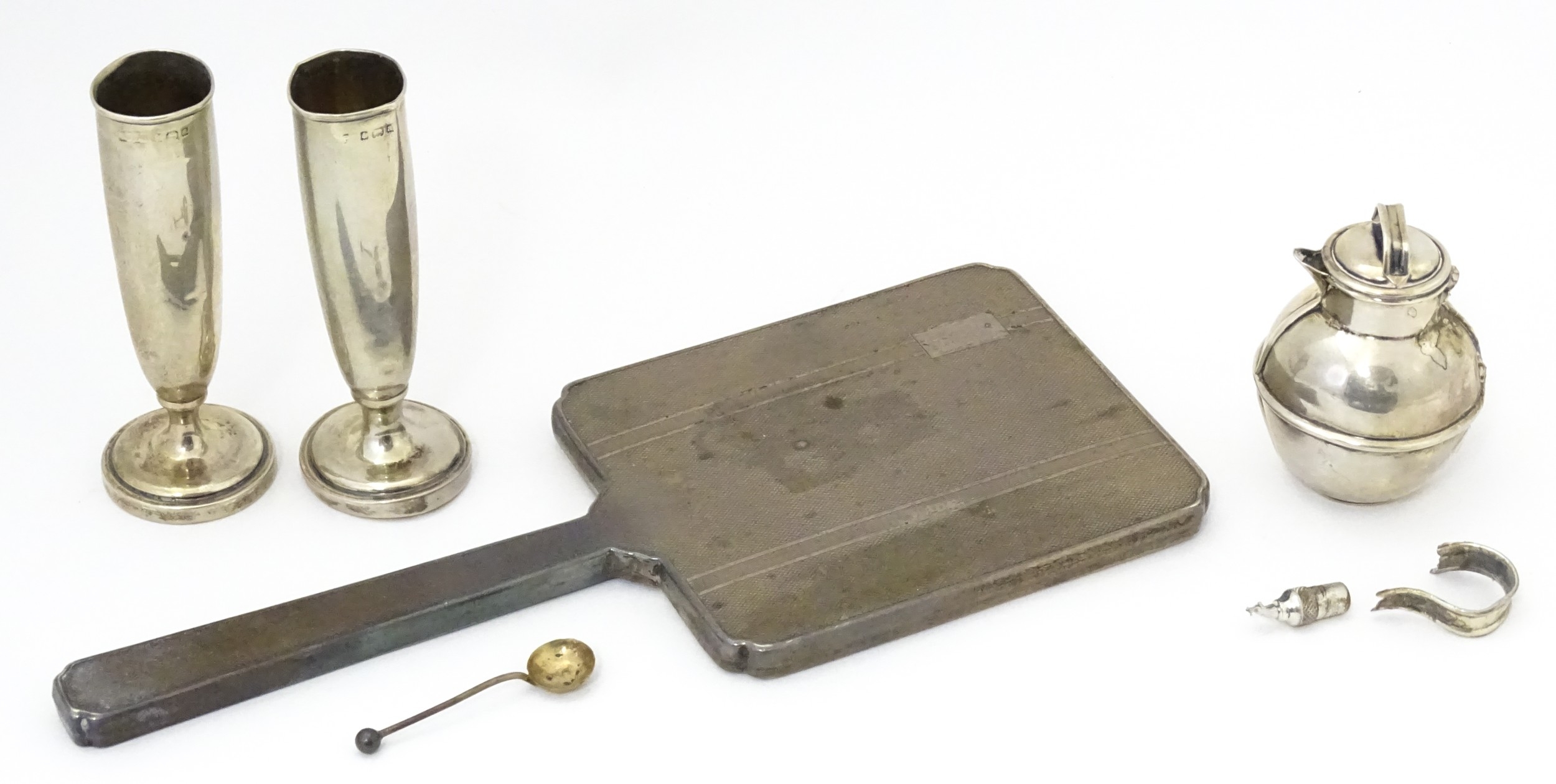 Assorted silver items to include a pair of spill vases hallmarked Birmingham 1900, a salt spoon, Jersey cream jug, and a silver handled mirror. Hand mirror approx. 9 3/4" long (5)