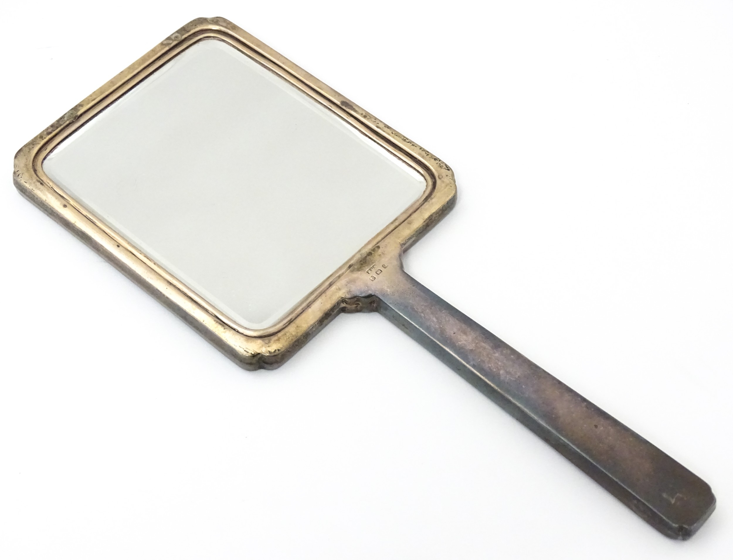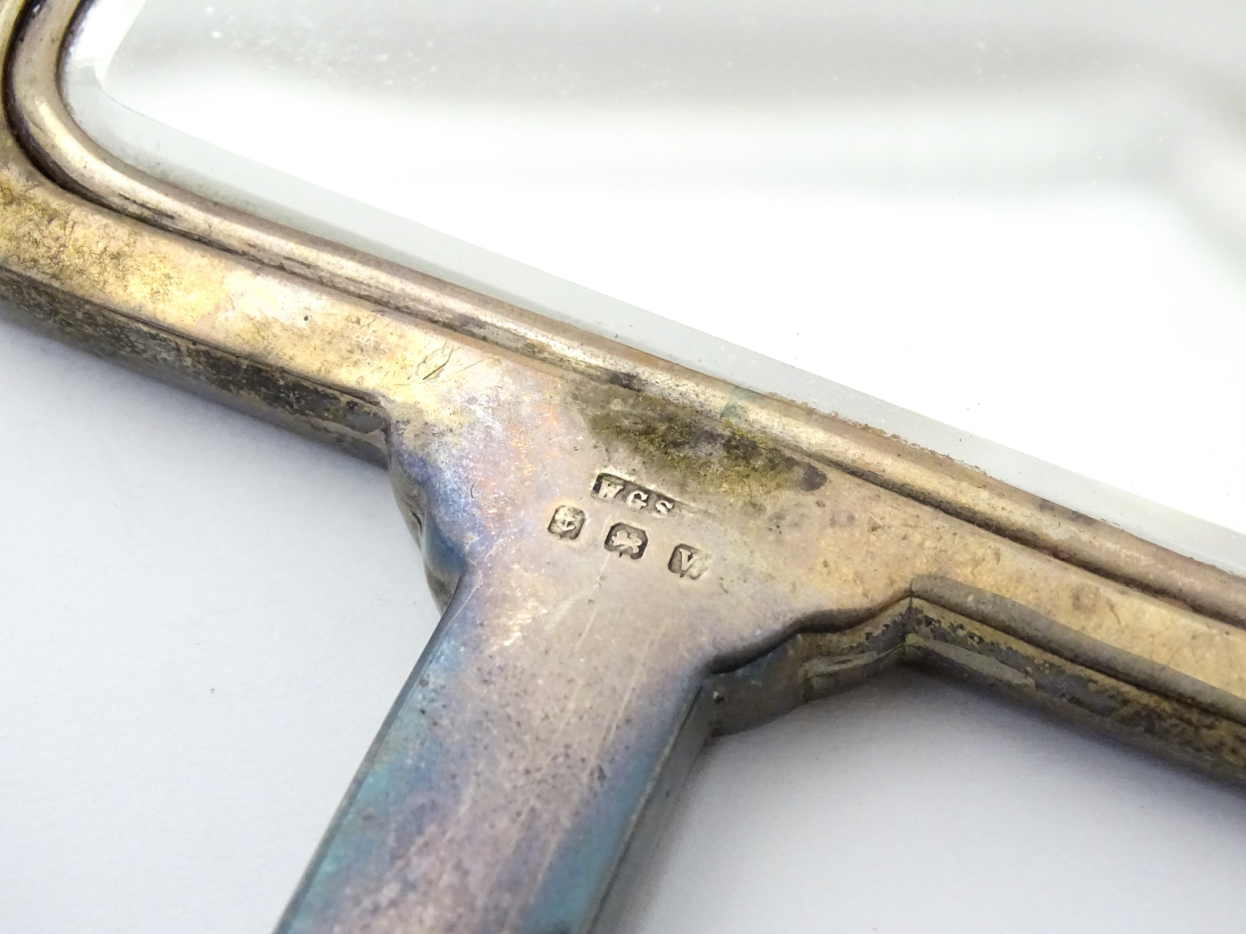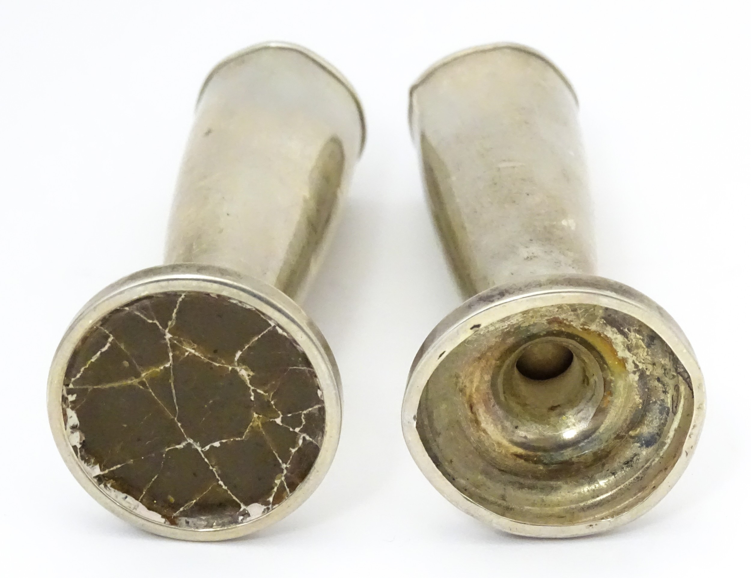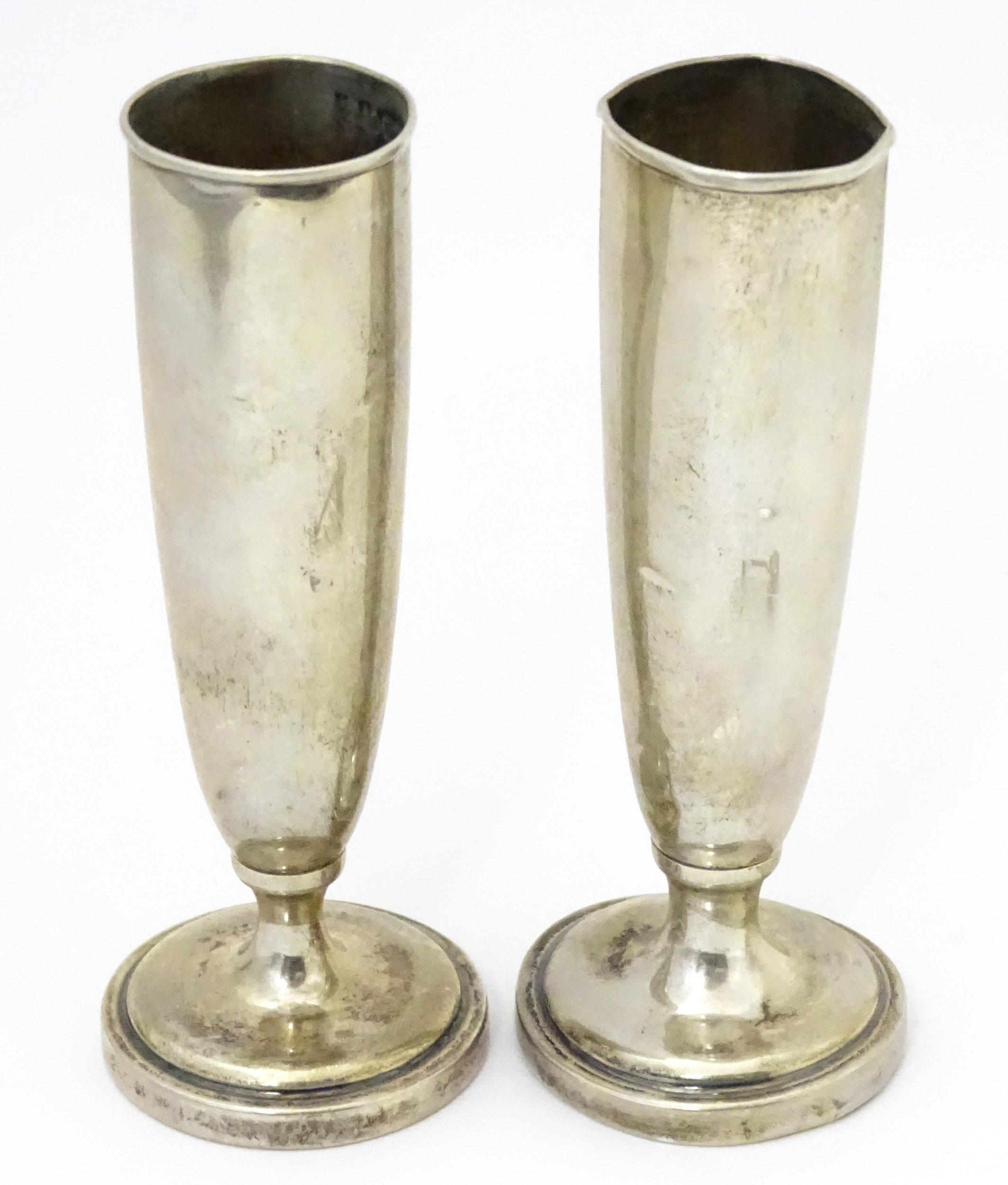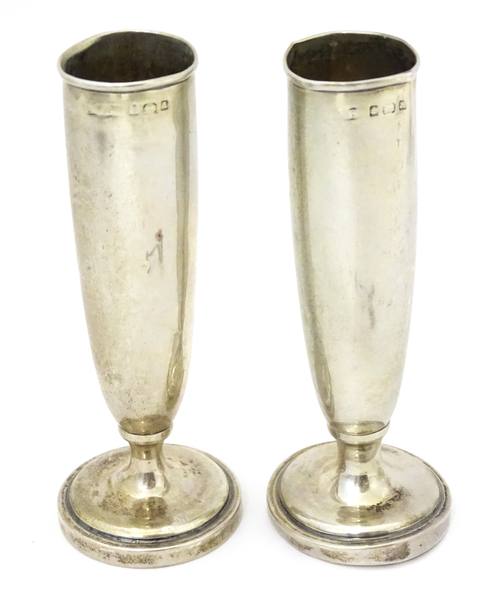 Assorted silver items to include a pair of spill vases hallmarked Birmingham 1900, a salt spoon, Jersey cream jug, and a silver handled mirror. Hand mirror approx. 9 3/4" long (5)