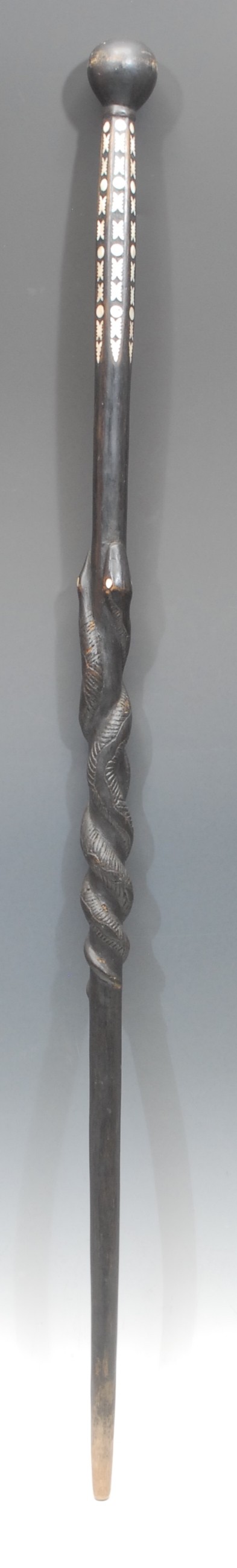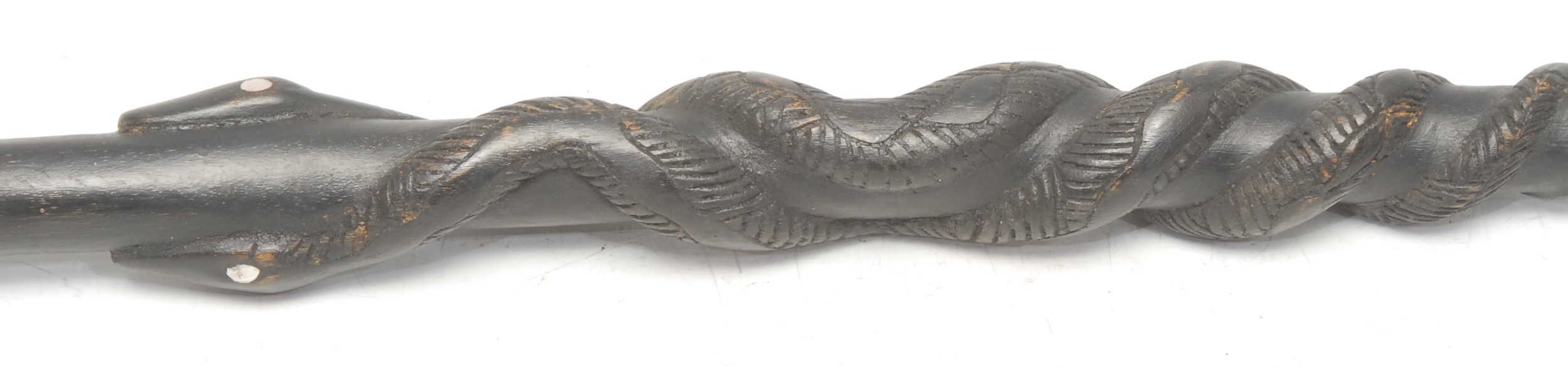A 19th century colonial Indian ebonised walking stick, the carved shaft entwined with a pair of serpents, mother of pearl inlay, 97cm long, c. 1910