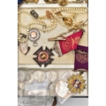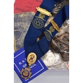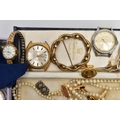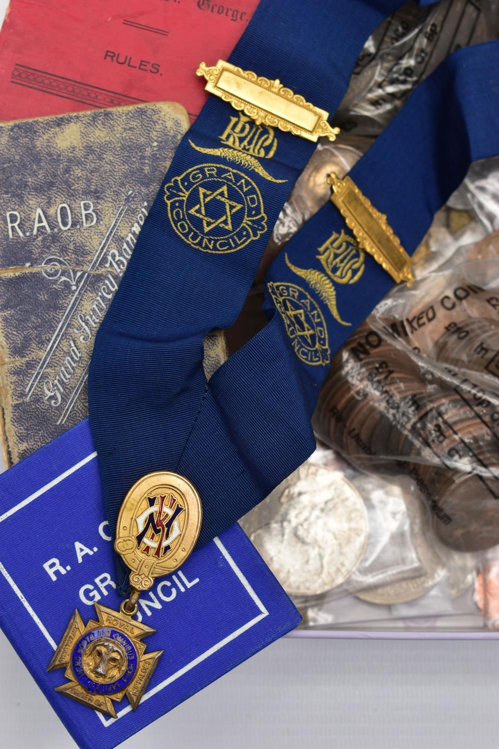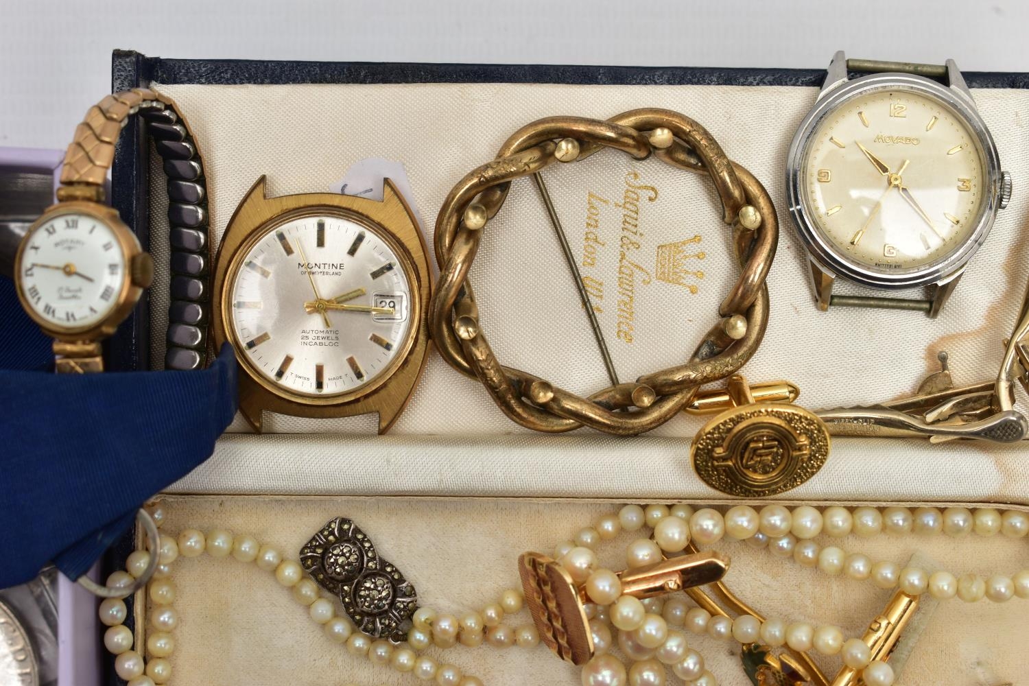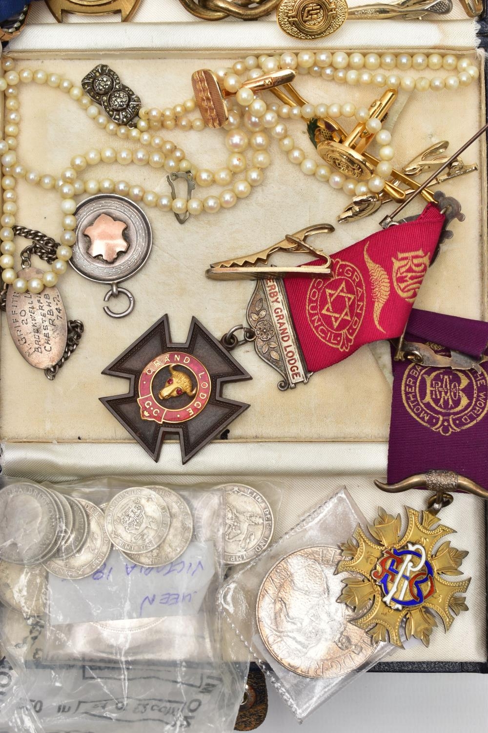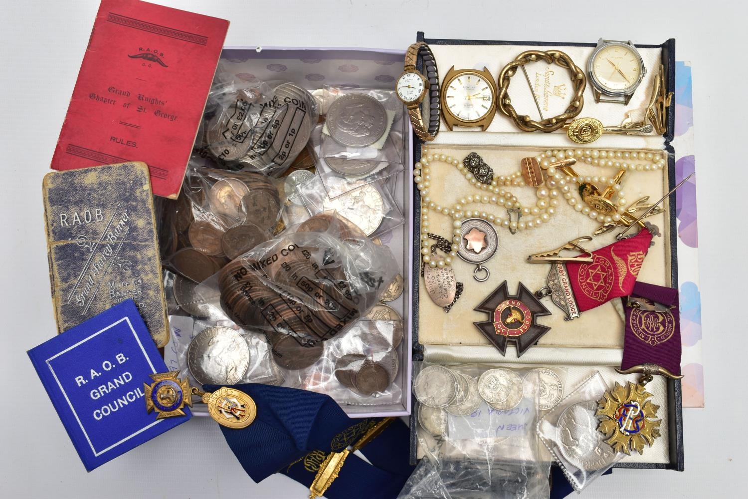 A BOX OF ASSORTED WATCHES, CUFFLINKS, MEDALS AND COINS, to include a gents stainless steel, hand wound 'Movado' watch head, round champagne dial signed 'Movado', Arabic twelve, three, six and nine numerals interspaced with baton markers (working, time keeping not tested), a gents gold plated 'Montine Automatic' watch head (working, time keeping is untested), a ladies gold plated 'Rotary' wristwatch fitted with a stretch link bracelet, a Victorian yellow metal brooch mount, a graduated cultured pearl necklace fitted with a white metal fish hook clasp stamped 'Silver' decorated with marcasite, costume cufflinks and tie clips, a white metal identification bracelet stamped 'Silver', a fob medal with vacant rose gold shield cartouche hallmarked Birmingham, a silver enamel 'R.A.O.B' medal fitted with a purple ribbon, another silver 'R.A.O.B' medallion fitted with a blue neck ribbon, each with a full Birmingham silver hallmark, another metal 'R.A.O.B' medal fitted with a red ribbon, together with associated booklets for the 'R.A.O.B', also including a box of mixed coinage such as a bag of silver Shillings and a Victoria 1895 crown coin, approximate gross weight of silver coins 140 grams