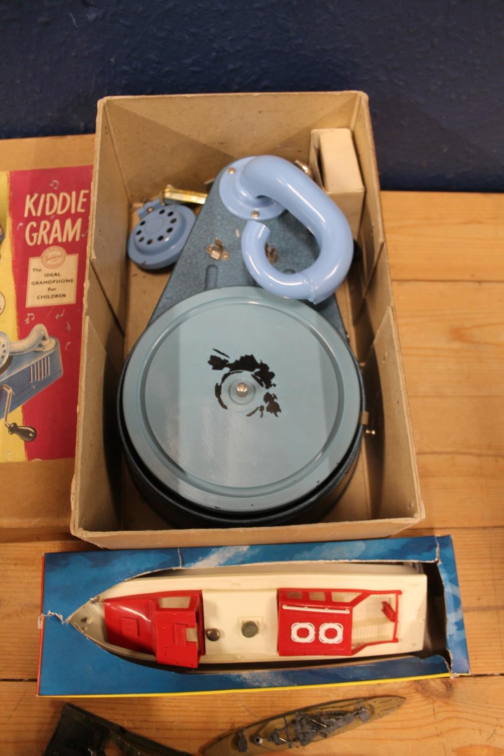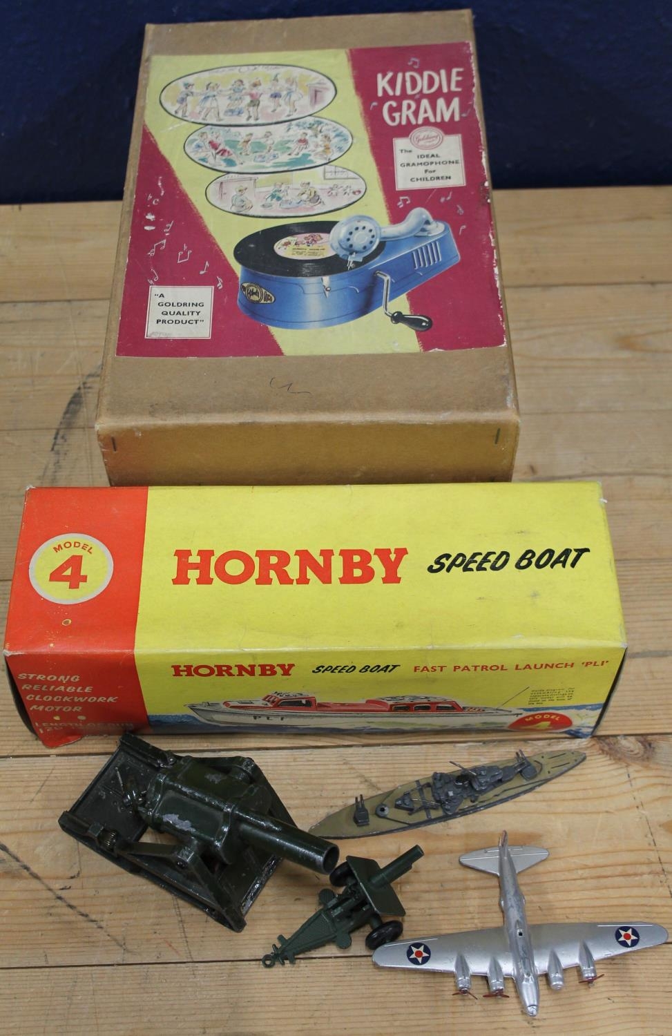 Hornby model 4 Speed Boat boxed. Goldring of England Kiddie Gram gramophone for children, boxed. Diecast model of an artillery gun, patent number 105728, registration number 658723, Dinky Toys Boeing Flying Fortress model, etc.