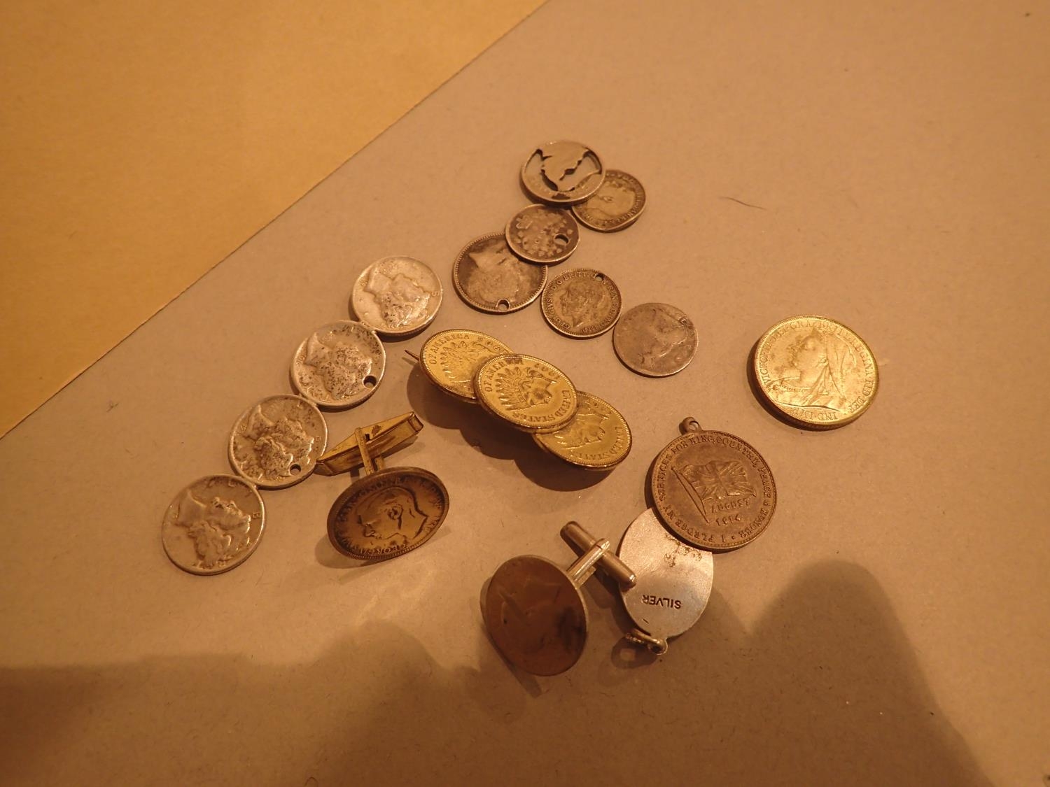 Mixed mounted, cut and holed coins, some made into jewellery, including some silver. P&P Group 1 (£14+VAT for the first lot and £1+VAT for subsequent lots)