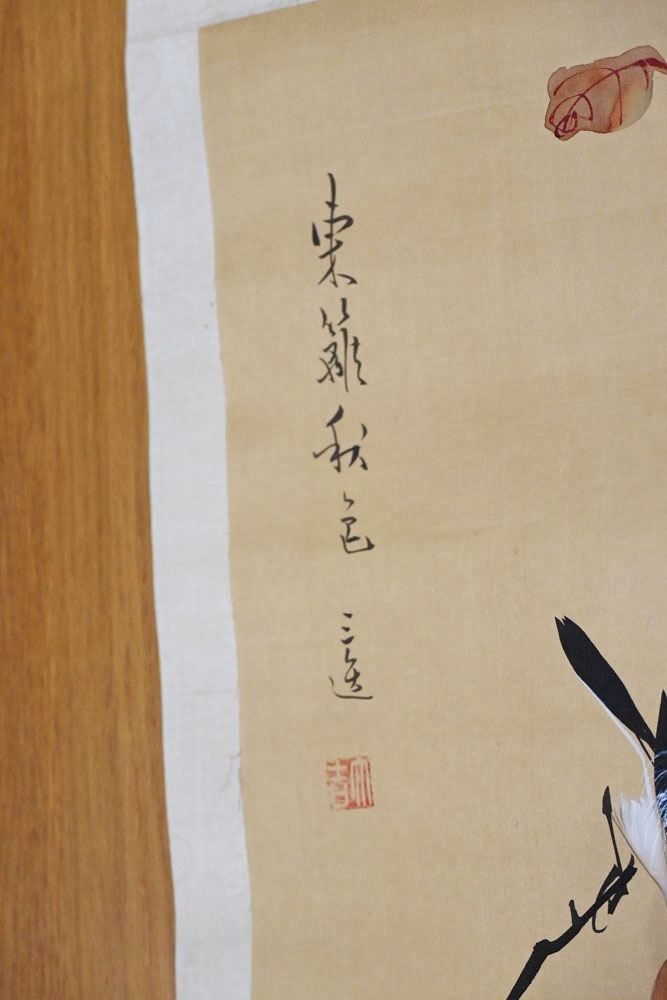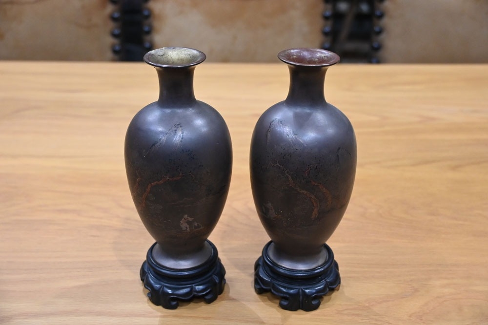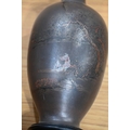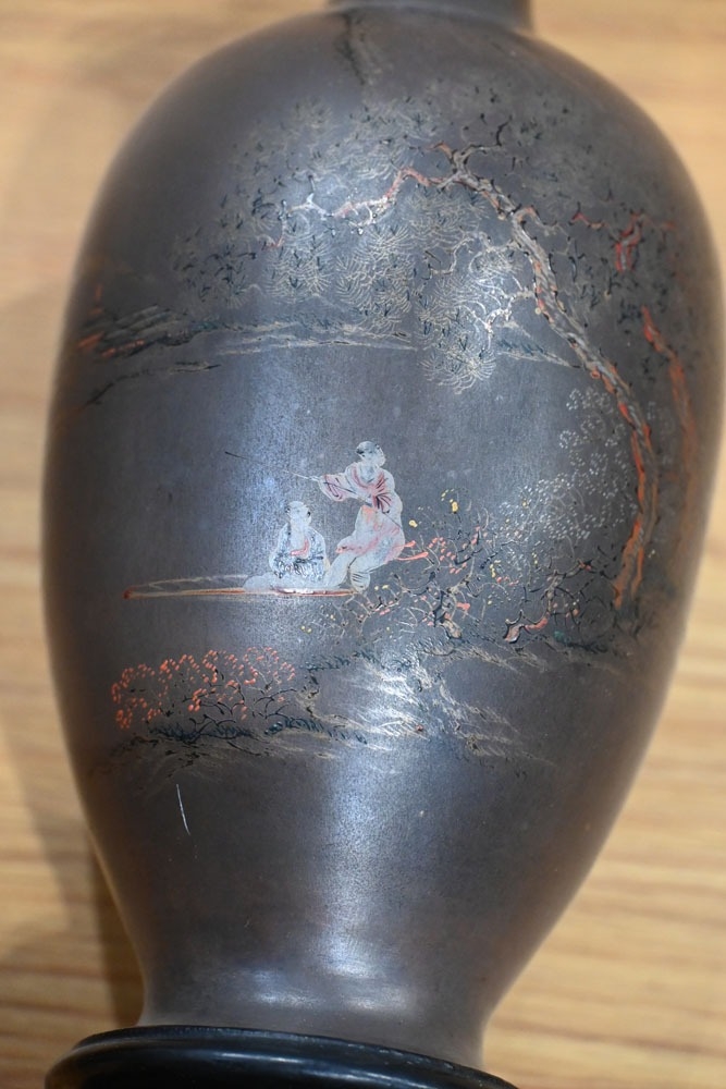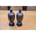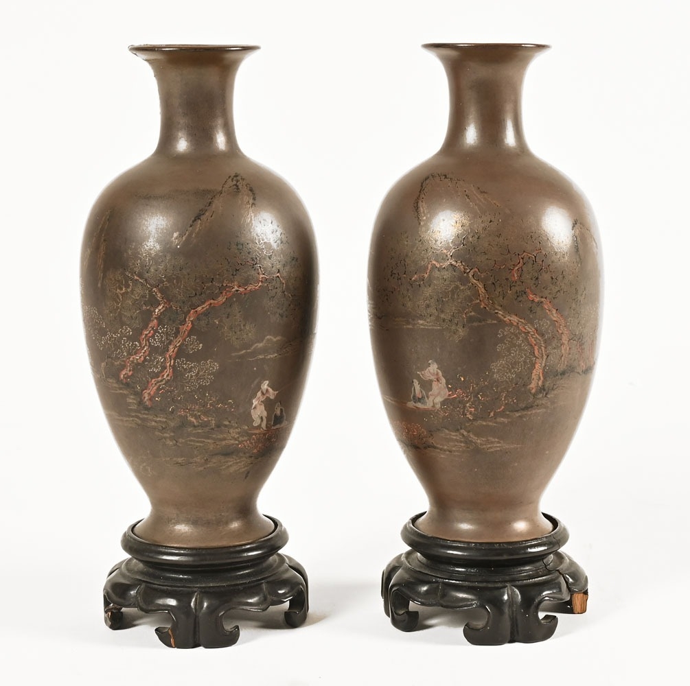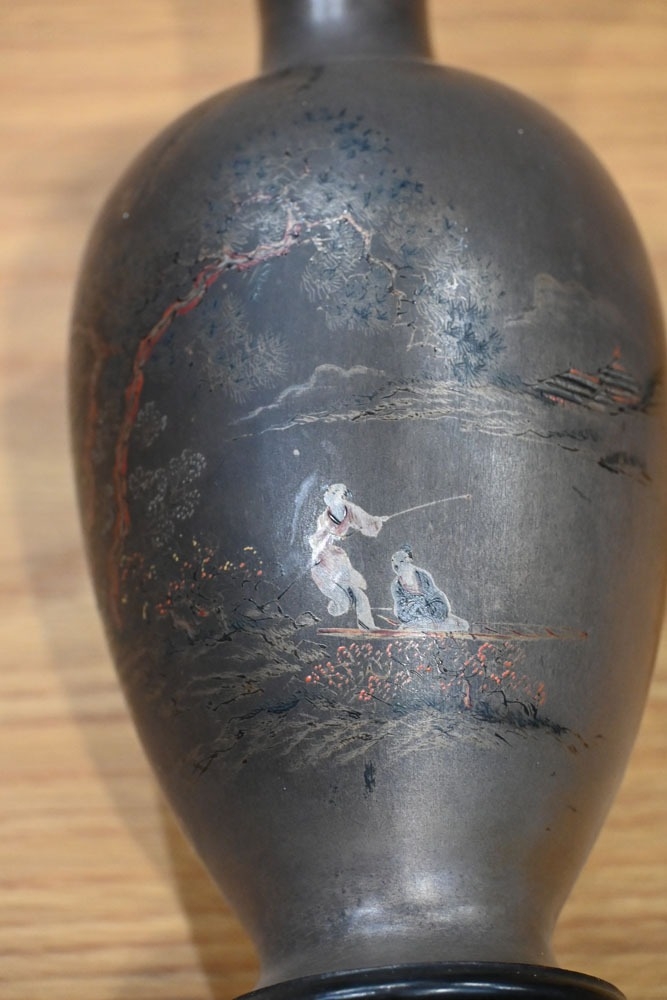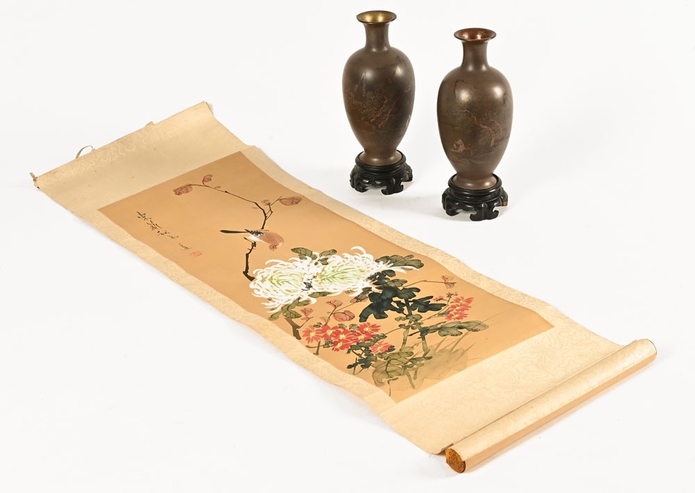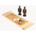 A pair of Japanese lacquered vases, each on integral stand. Height 24 cm, together with a Chinese scroll painting bird on branch.