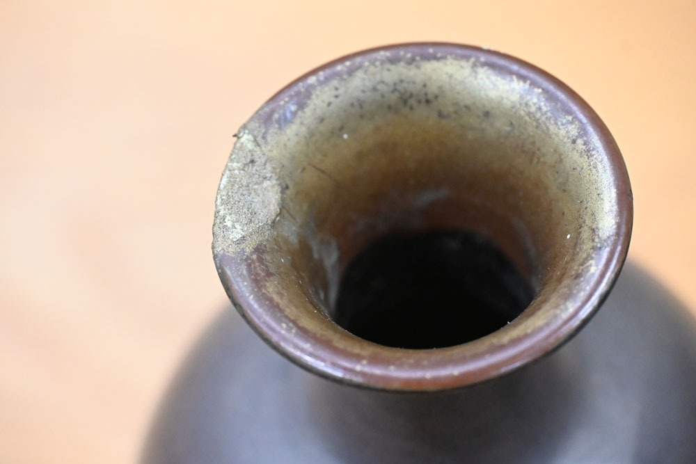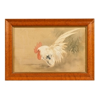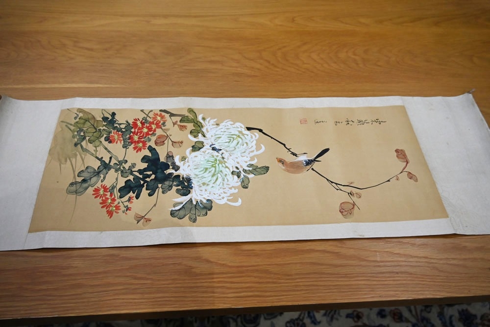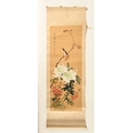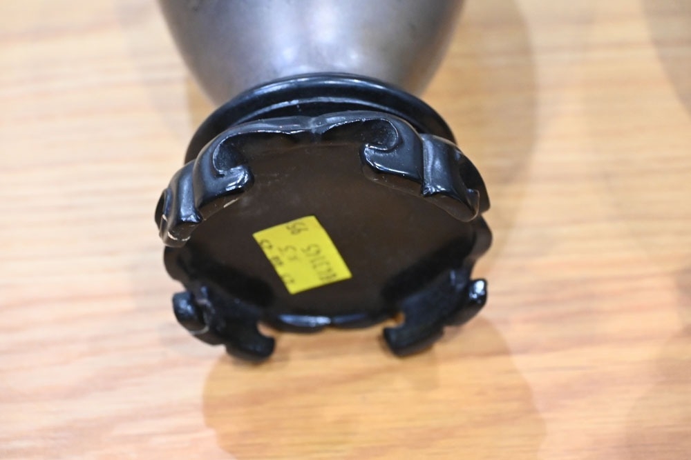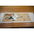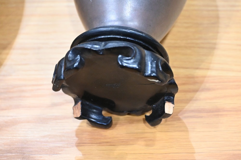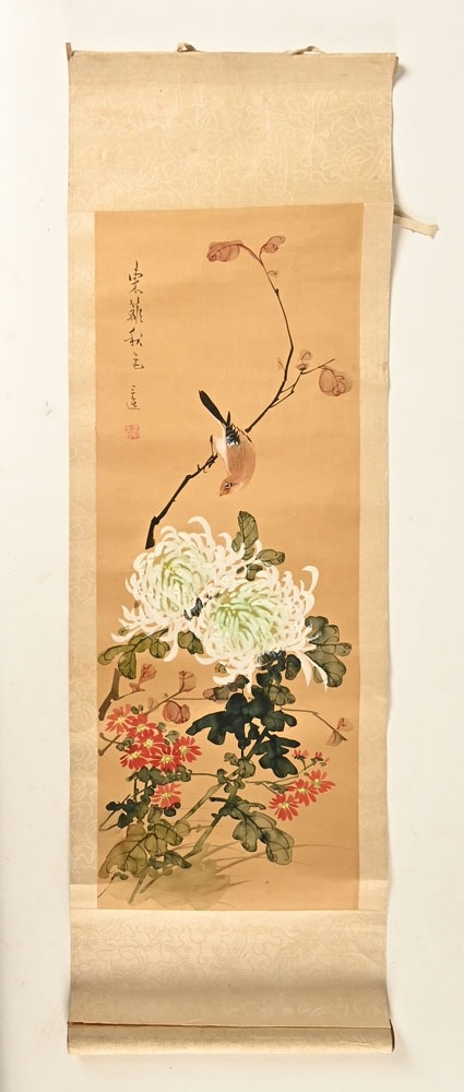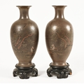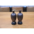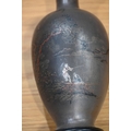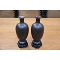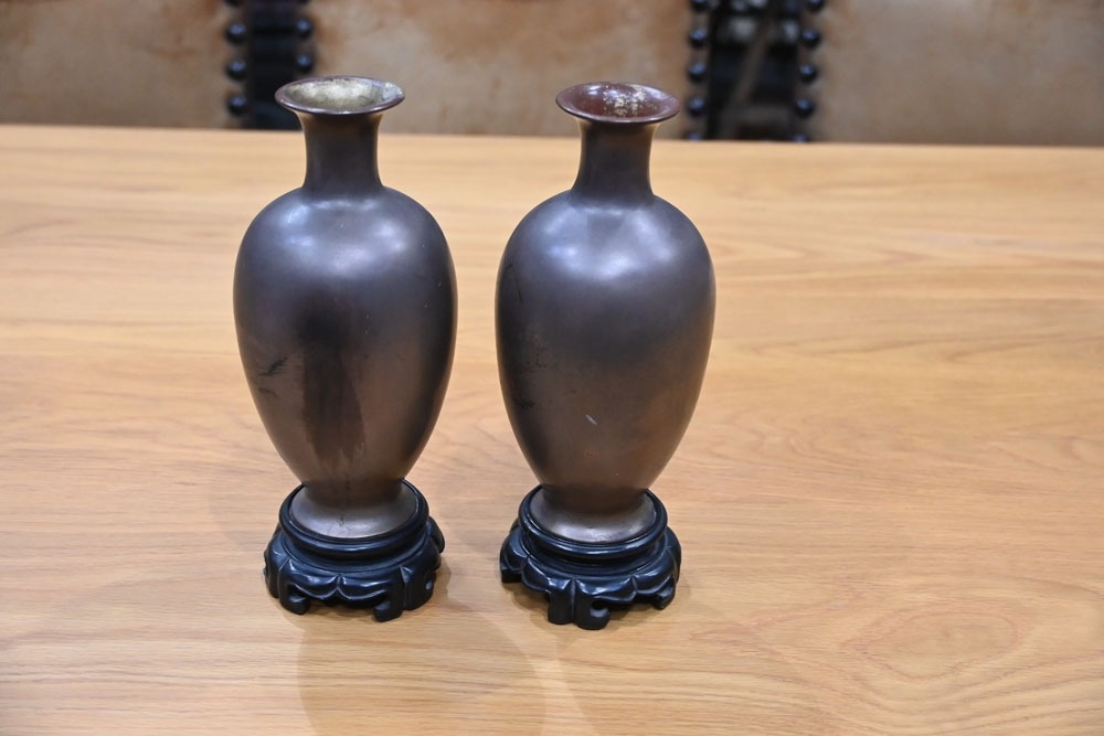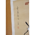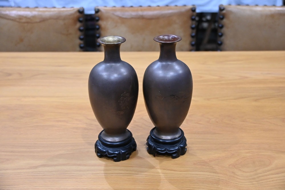 A pair of Japanese lacquered vases, each on integral stand. Height 24 cm, together with a Chinese scroll painting bird on branch.