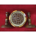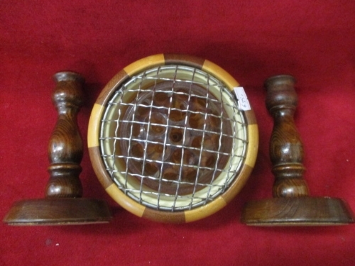 TREEN ROSE BOWL AND PAIR OF TURNED CANDLE STICKS
