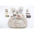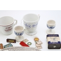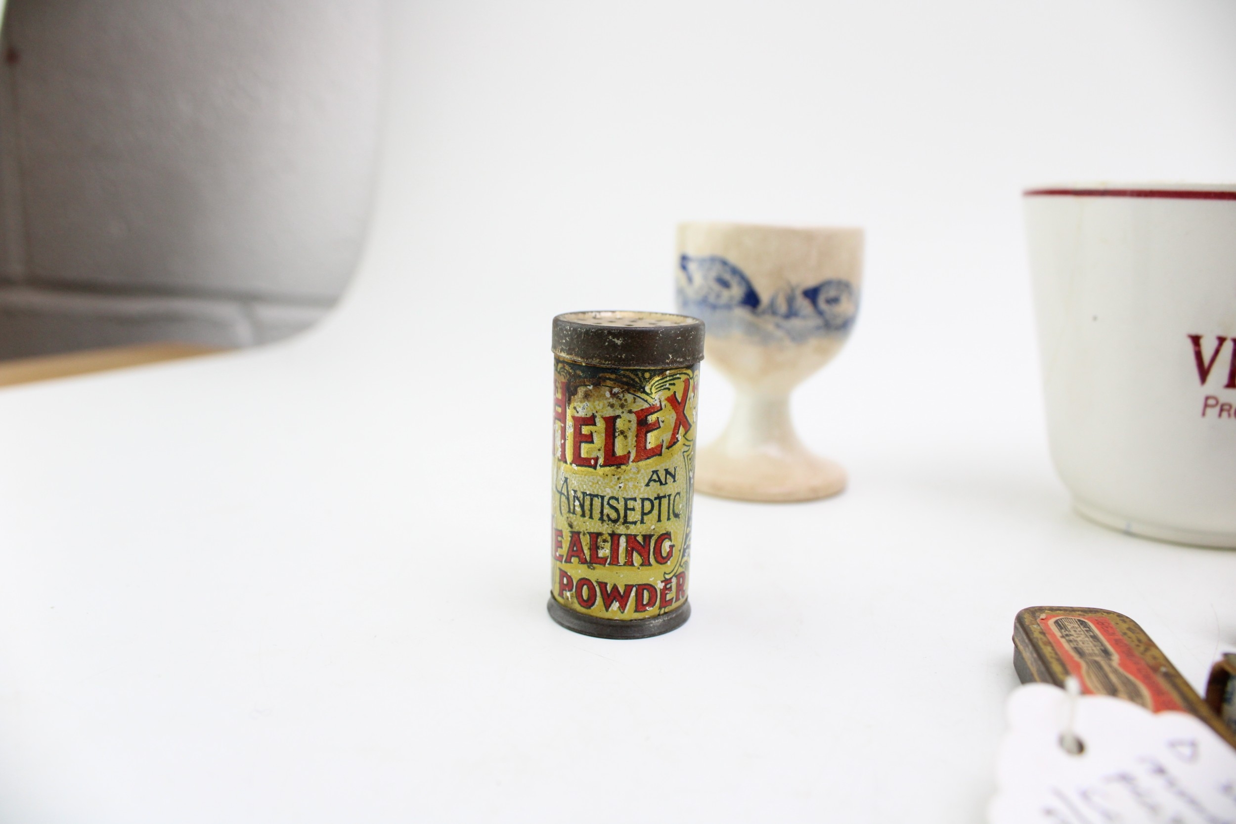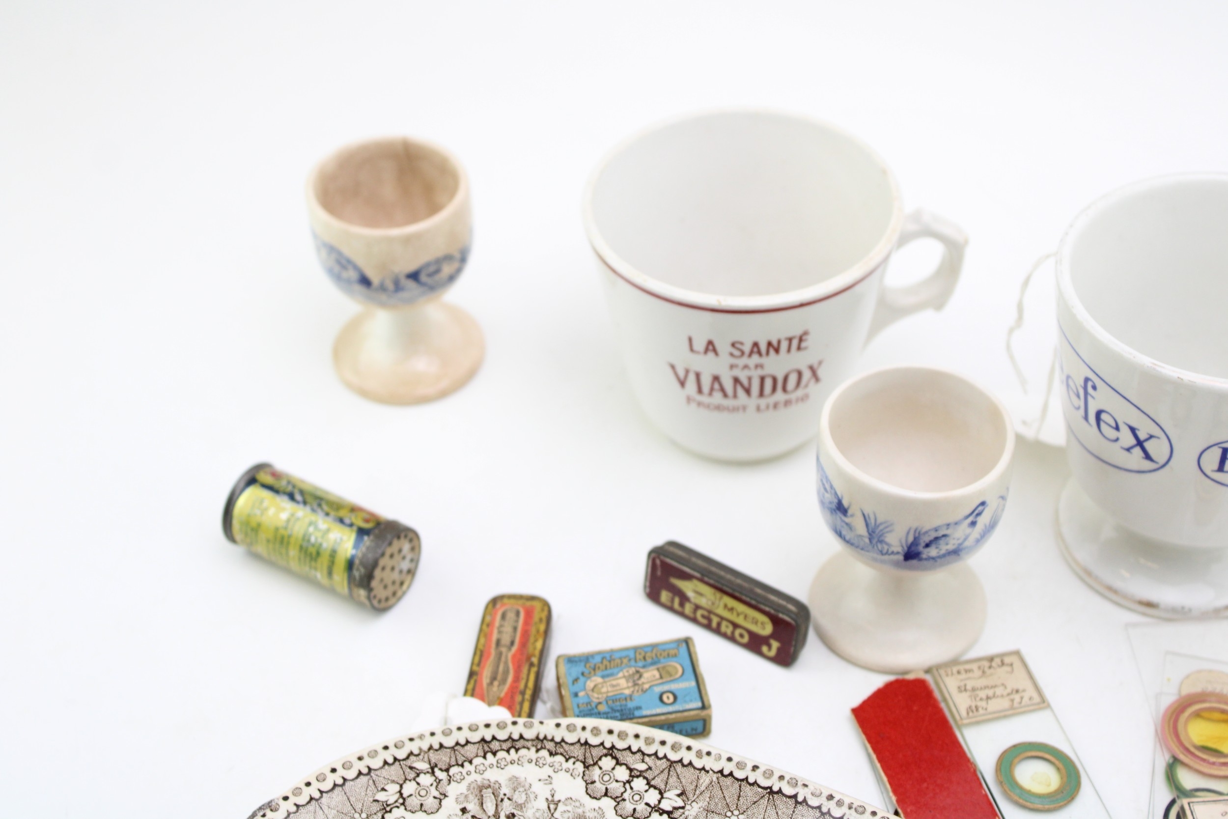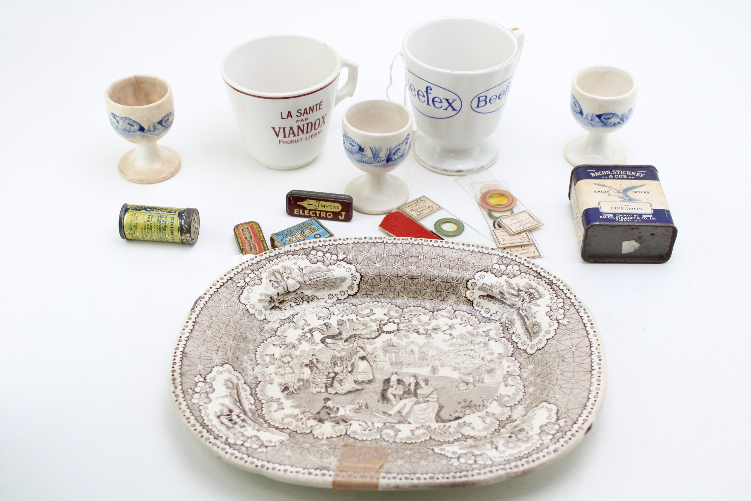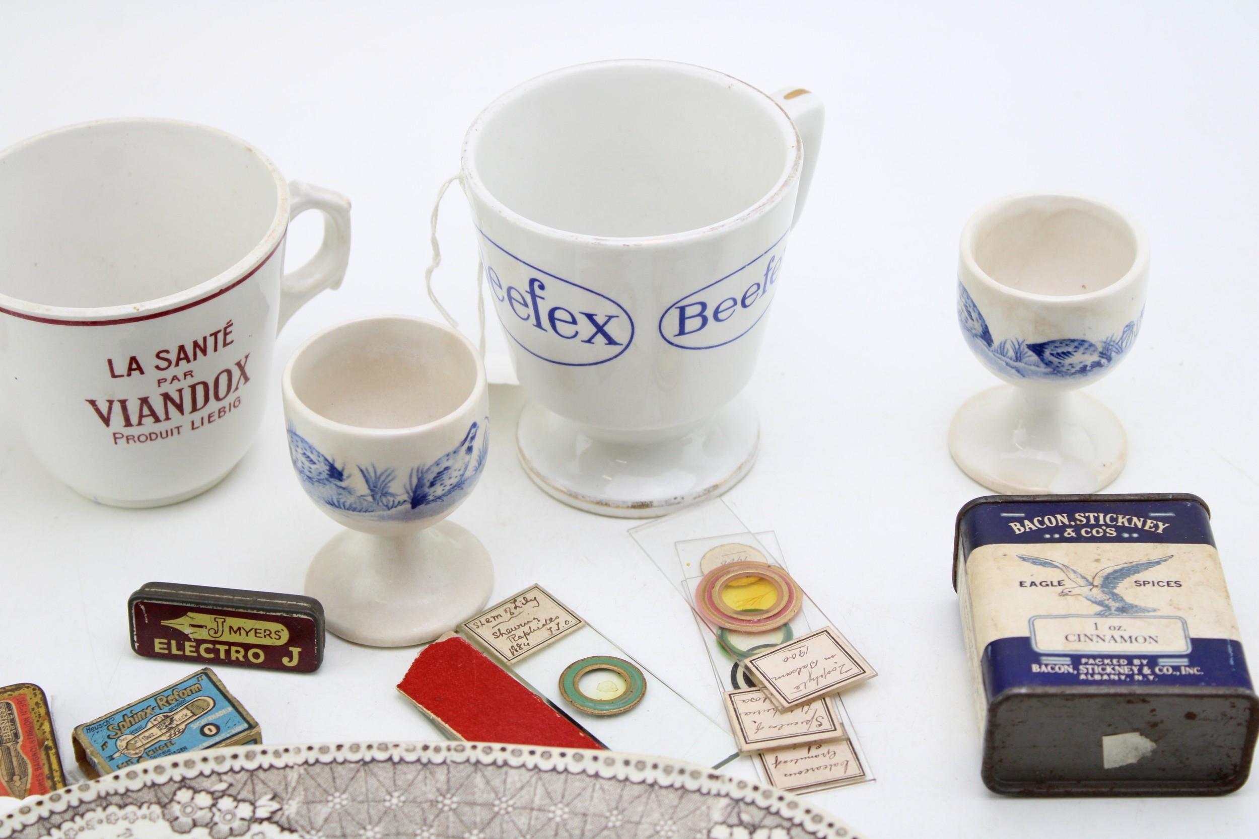 Advertising collectables to include, Beefex cup, La Santa Par Viandox cup, Bacon, Stickney & Co's Eagle Spices, 1 oz Cinnamon, Helex antiseptic Healing Powder for cattle, pen nib tins, microscope slides, North Shields Pottery transfer printed 19th century plate a/f and other similar items, (Qty).