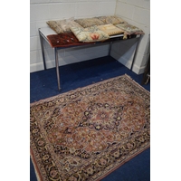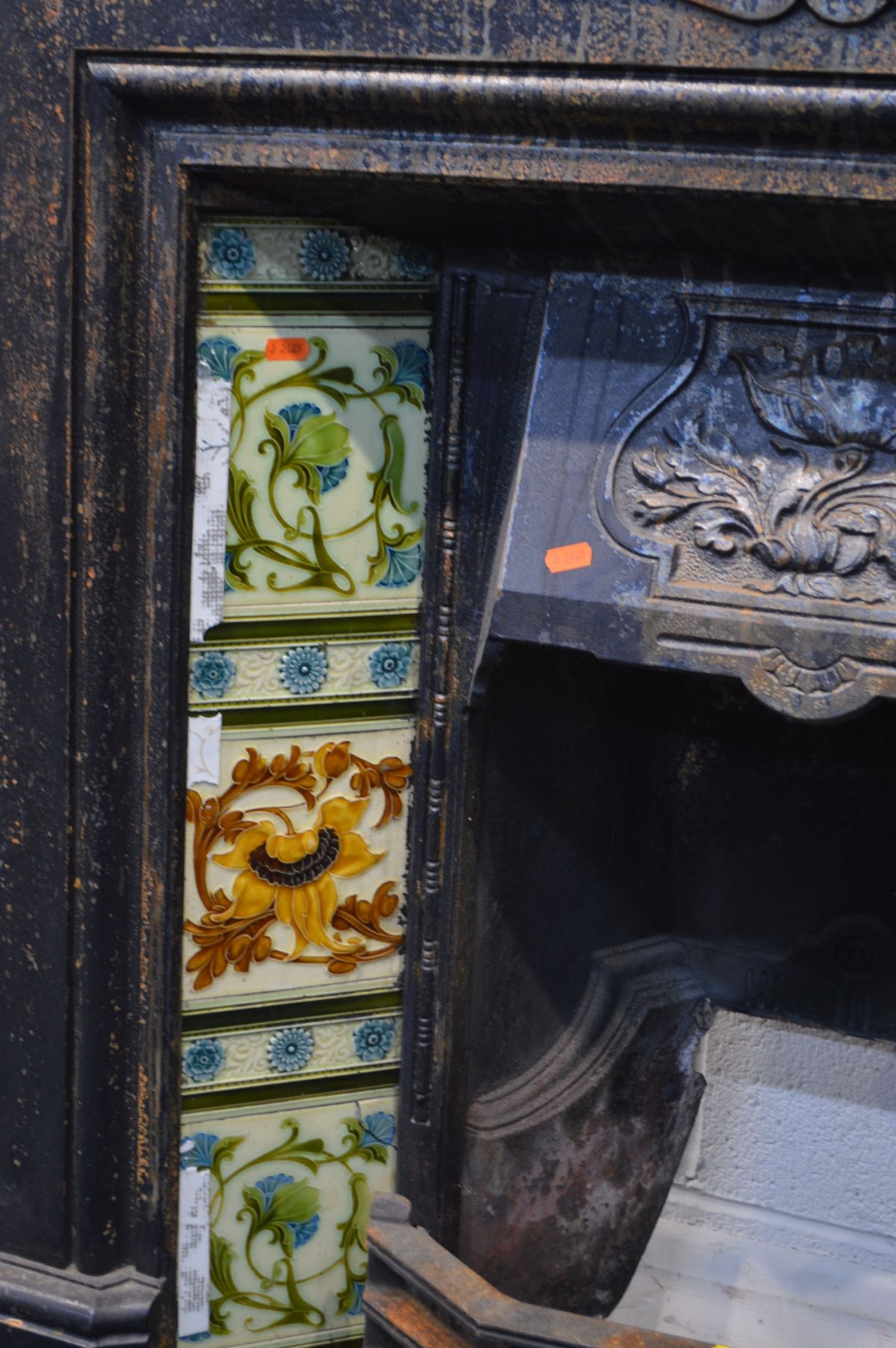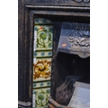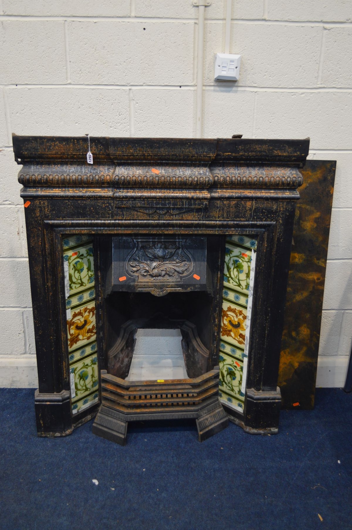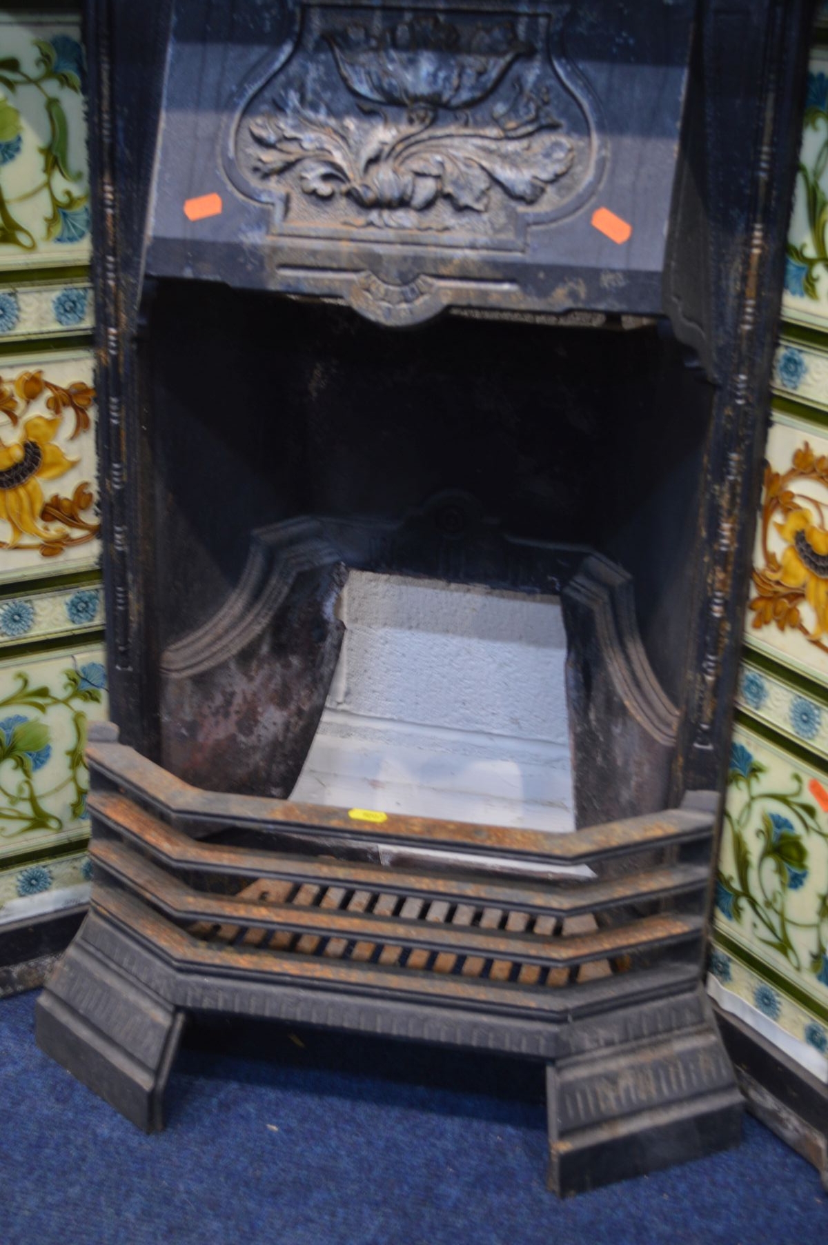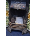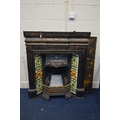 AN EARLY 20TH CENTURY CAST IRON FIRE INSERT, flanked with floral tile inserts, width 105cm x depth 30cm x height 120cm, with a grate (sd to top) (3)