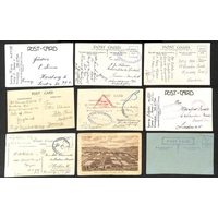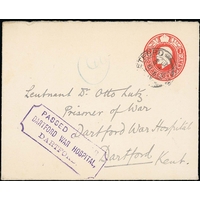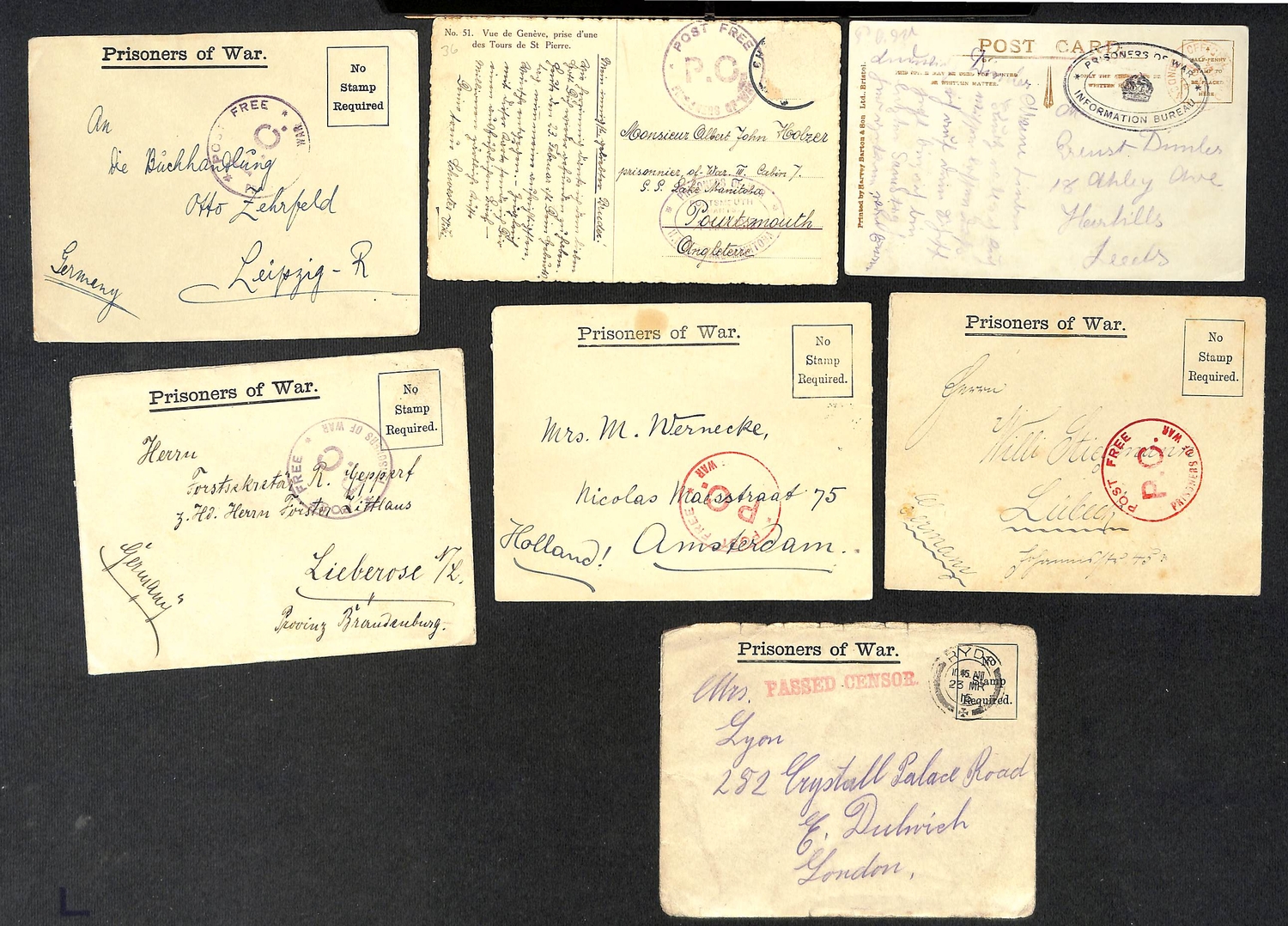 P.O.W Ships. 1914-15 Covers (5) and picture postcards (2) comprising postcard from Switzerland to a P.O.W on "Lake Manitoba" at Portsmouth with violet oval "PRISONERS OF WAR / PORTSMOUTH / HANTS / 1 MAR 1915 / H.M.T "LAKE MANITOBA"", stamp removed by the censor; stampless picture postcard of the "Royal Edward" with red London Official Paid c.d.s and oval "PRISONERS OF WAR / INFORMATION BUREAU"; and stampless P.O.W covers from the "Lake Manitoba" or "Ascania" at Ryde, "Scotian" at Portsmouth or "Ivernia" at Southend on Sea, another (flap missing) posted at Ryde. (7).